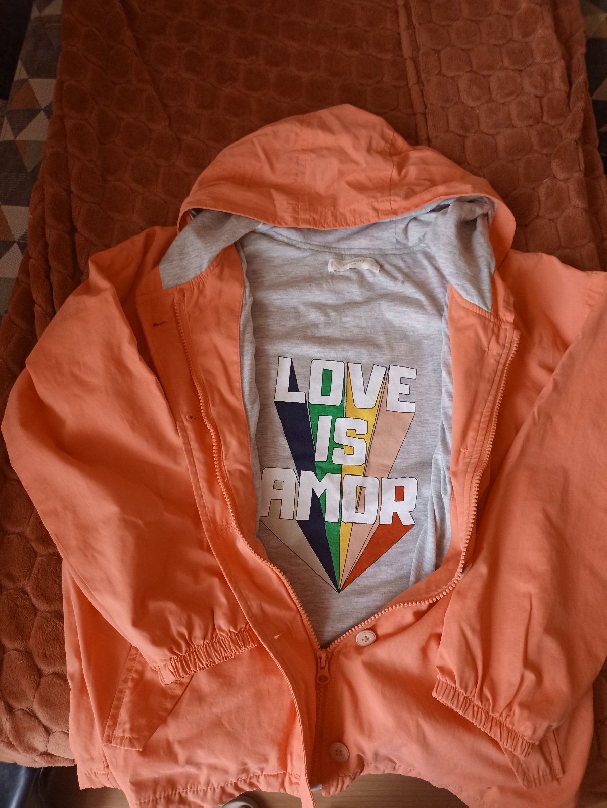 Predám dievčenskú jarnú bundičku, príjemný mäkký materiál, s kapucňou bez odopínania, bavlnená podšívka s nápisom, zapínanie na zips a gombíky, dve vrecká na gombíky, rukáv do gumičky, dĺžka: bundička predĺžená nie je. Strihovo tak na zadok. miery: dĺžka 57cm., plecia 52cm.,pod pazuškami 49cm.,rukáv od pleca 44cm., rukáv od krku 60cm., veľ. písaná 11/12 rokov, cena 10,-€ s poštovným