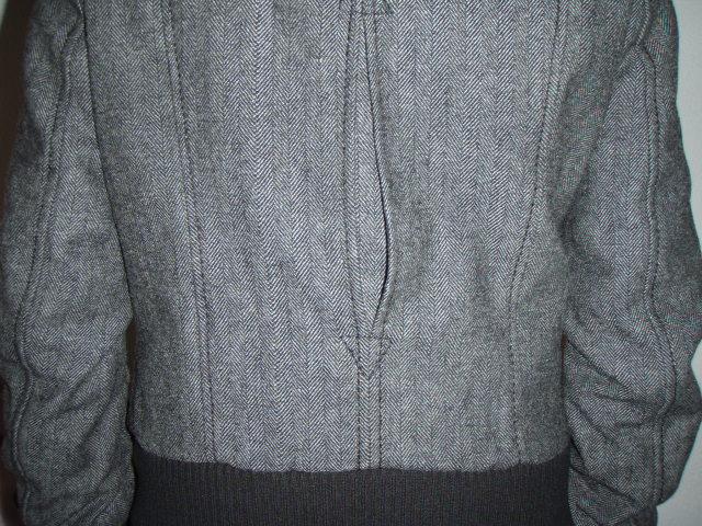 Pár x oblečená pekná bundička grafitovej farby s metalickým odleskom. Kapucňa sa dá odopnúť.