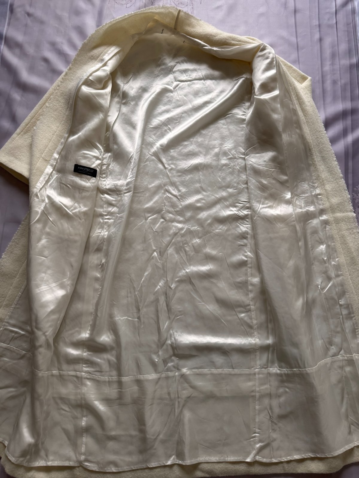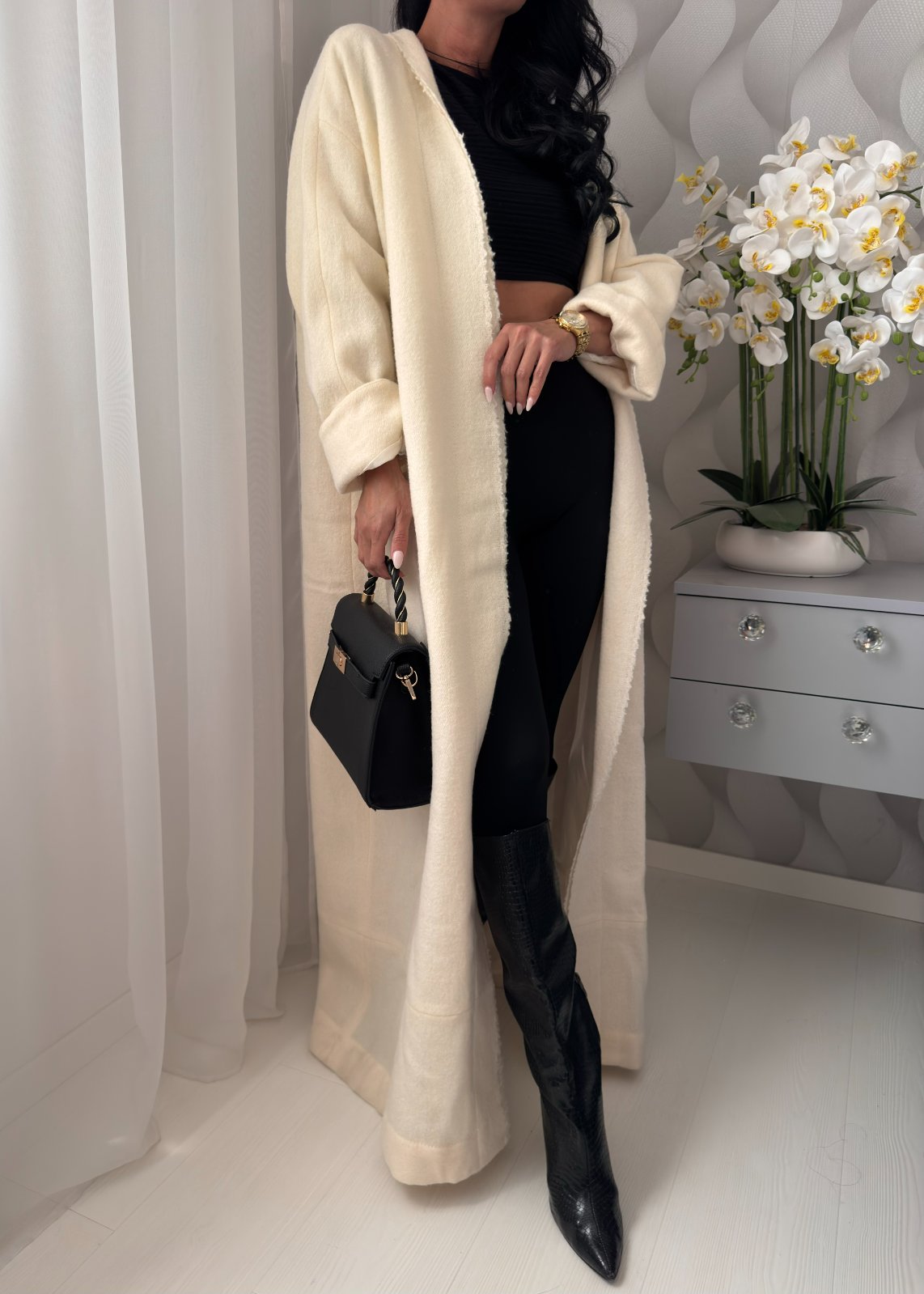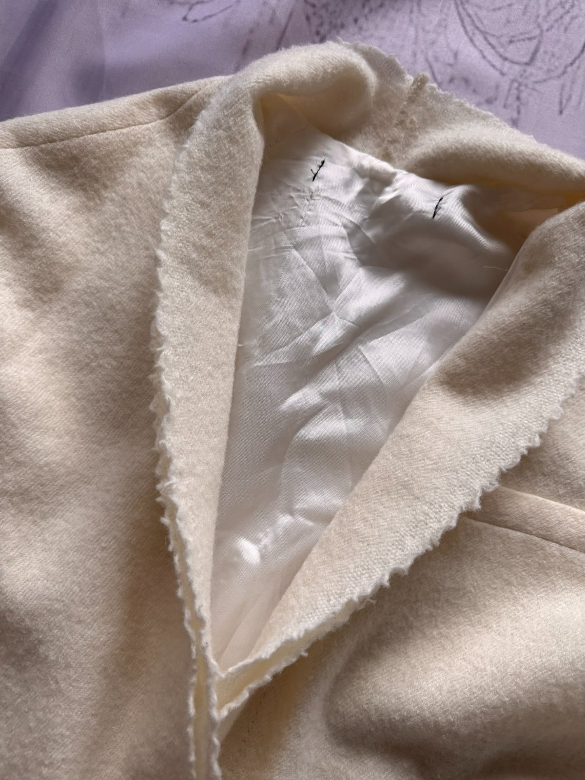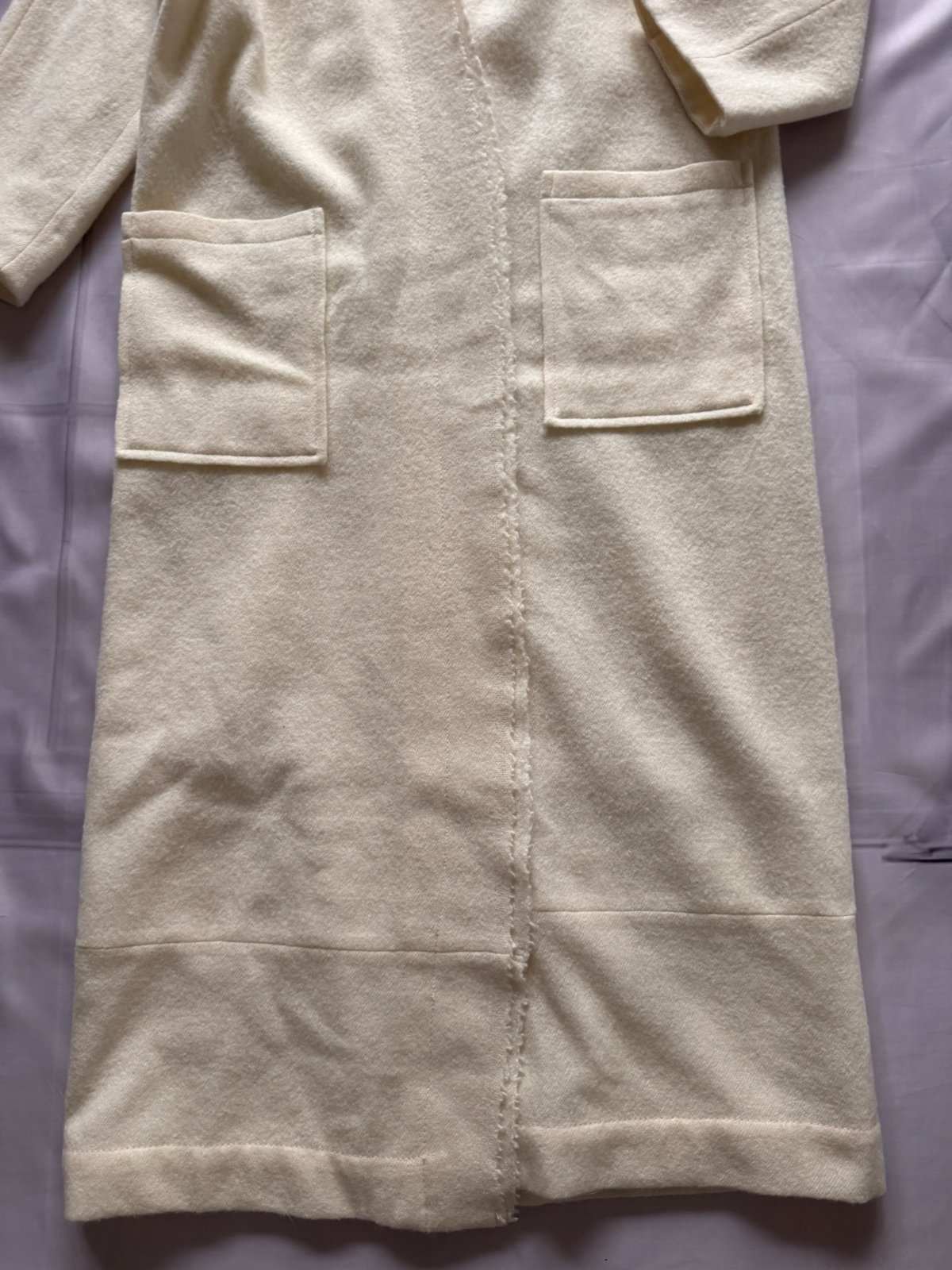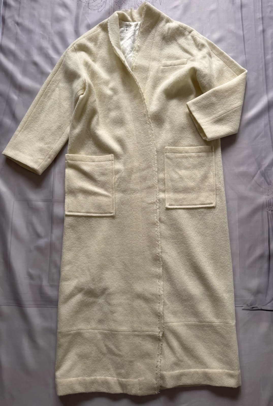 Smotanový zavinovací vlnený kabát s padajúcimi ramenami.