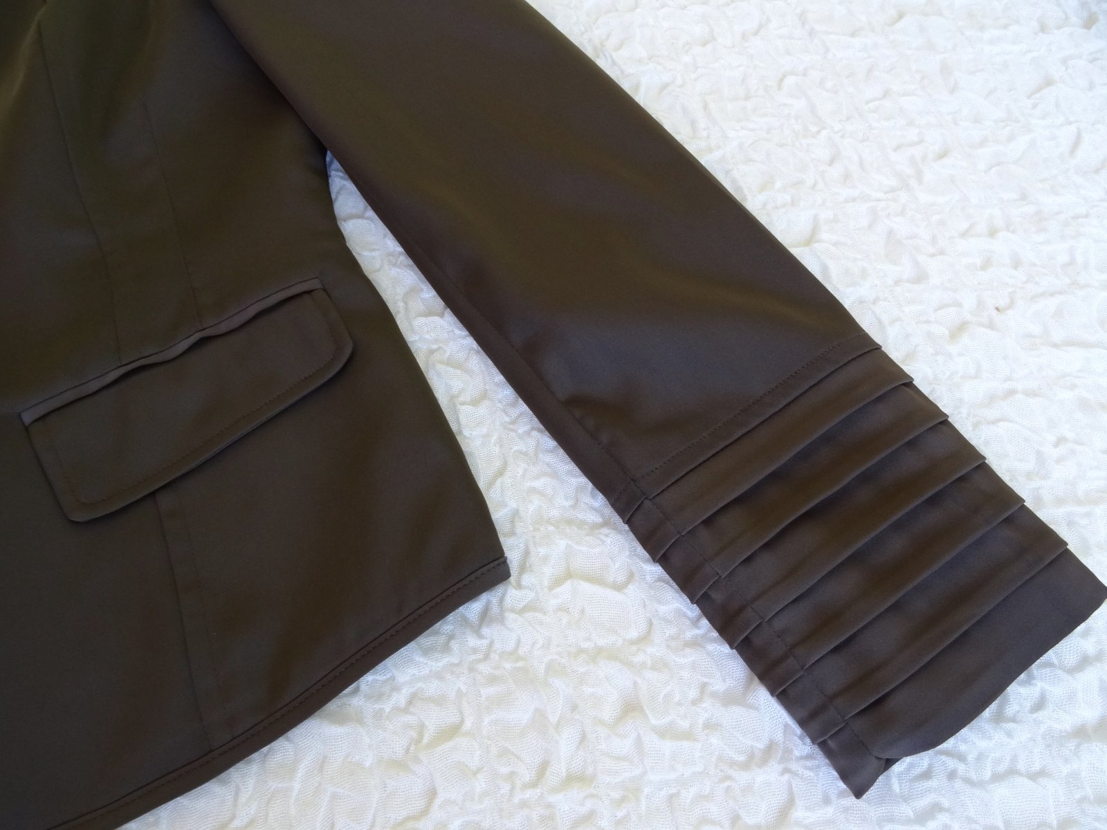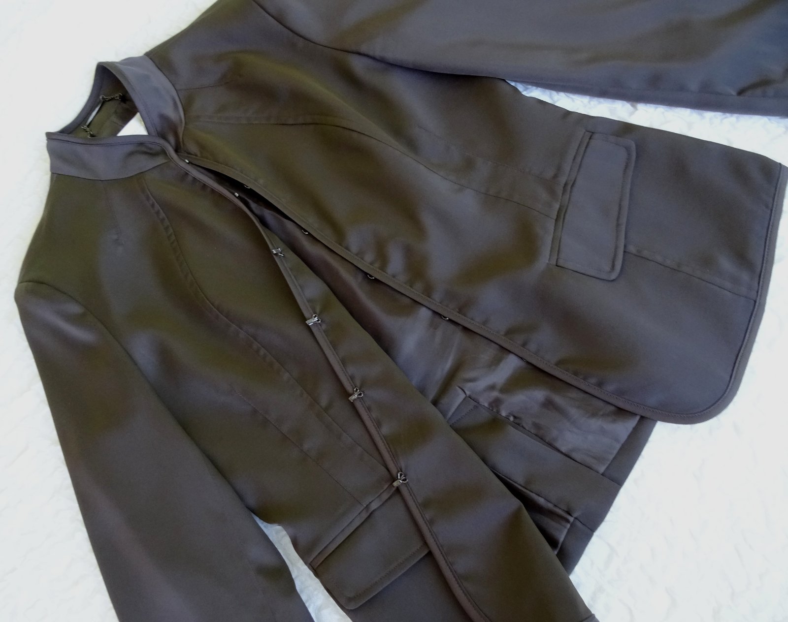 Sačko je tmavohnedé, skôr také elegantnejšie, zapína sa na háčiky, podšité.