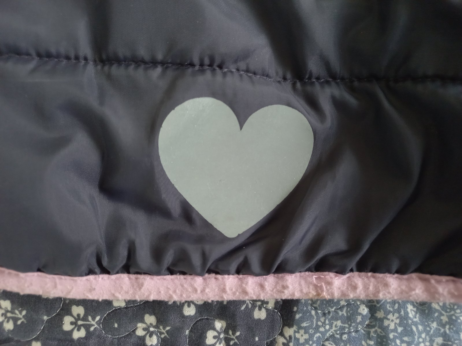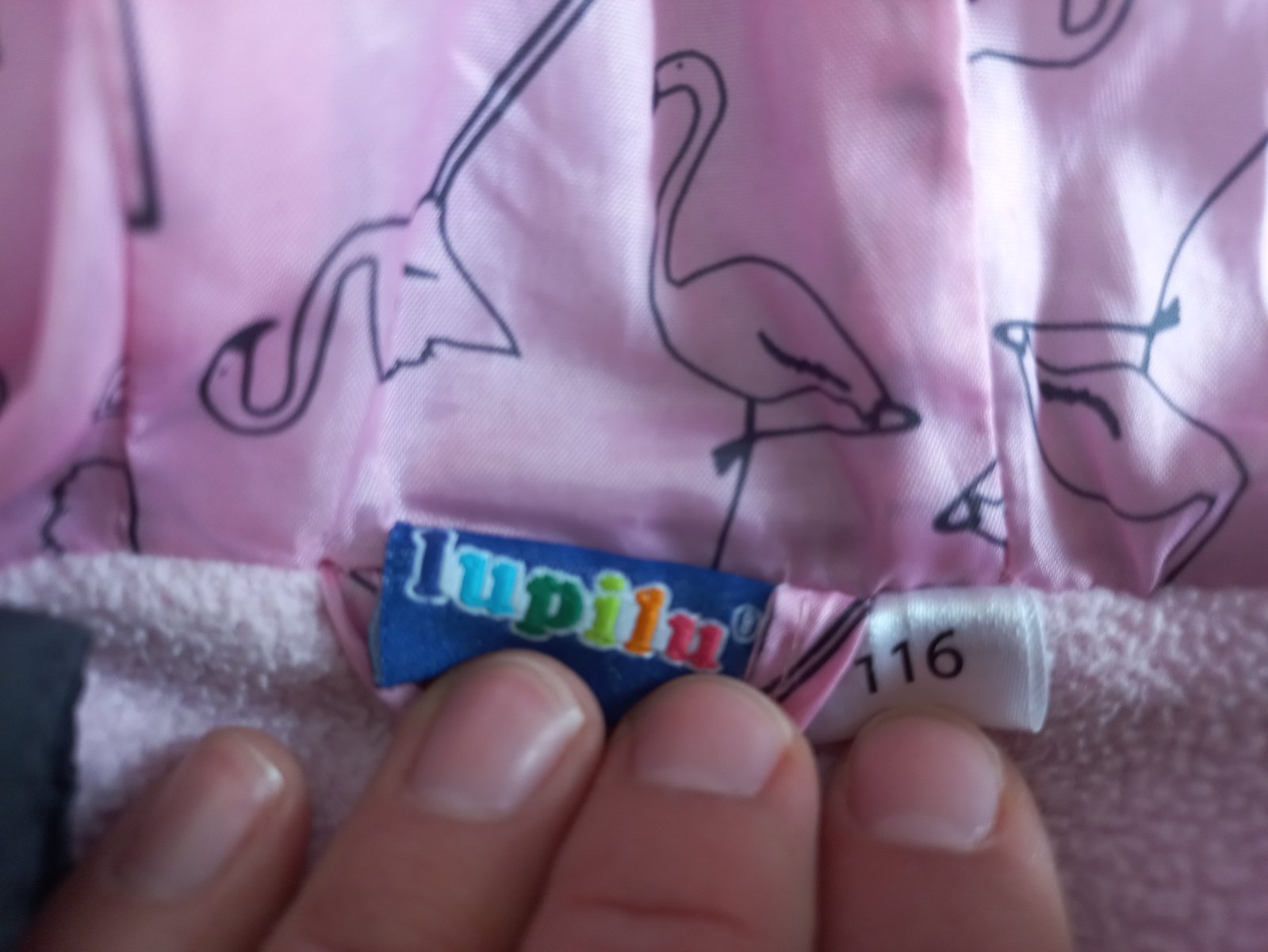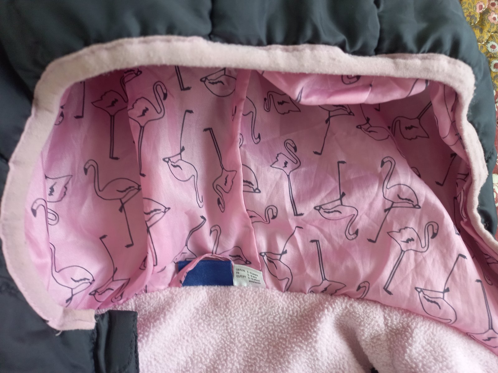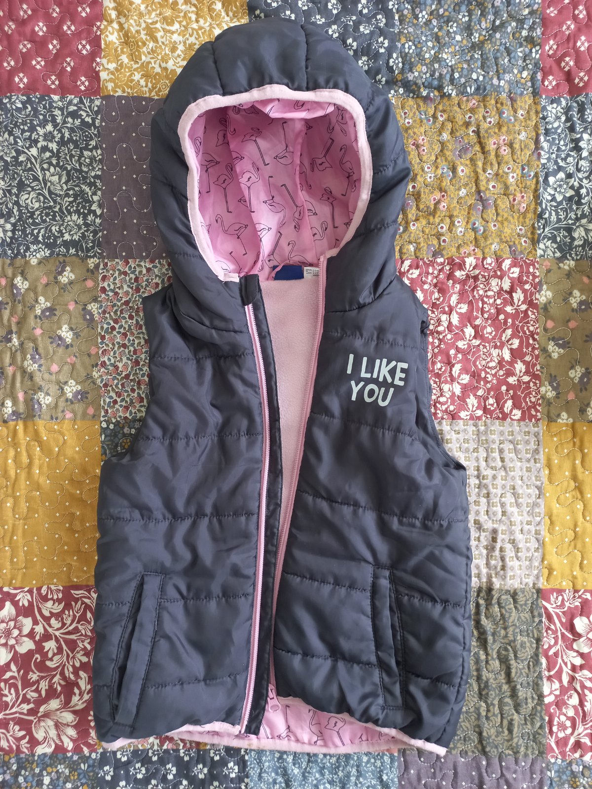 Pekná a praktická dievčenská vesta. Tmavošedá farba, na ktorej nevidno zaspinenie, zvnútra má pekný plameniakový vzor. V peknom zachovalom stave, len na spodnom leme vidno mierne opotrebenie - viď foto.
