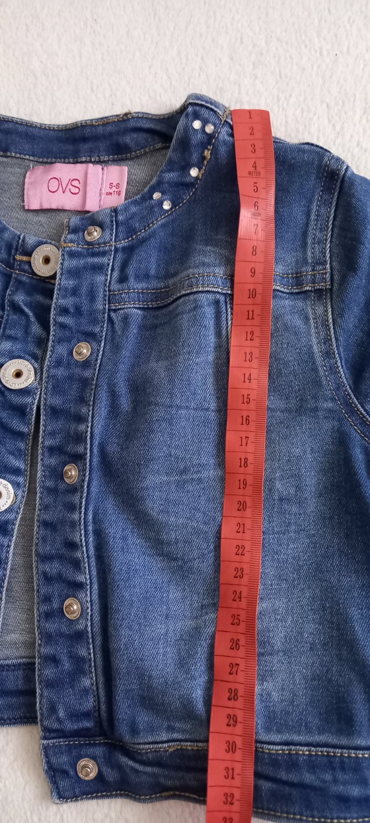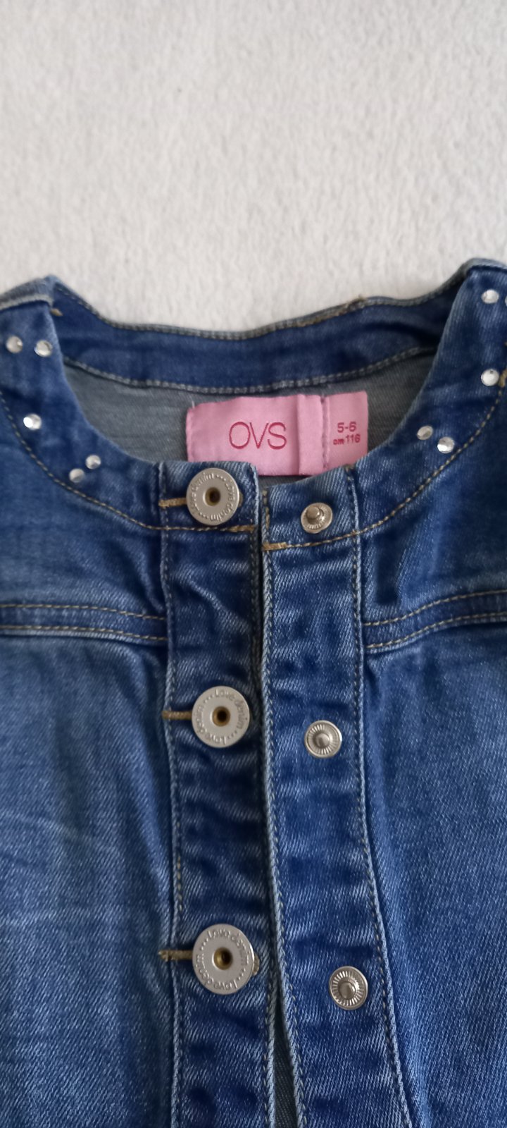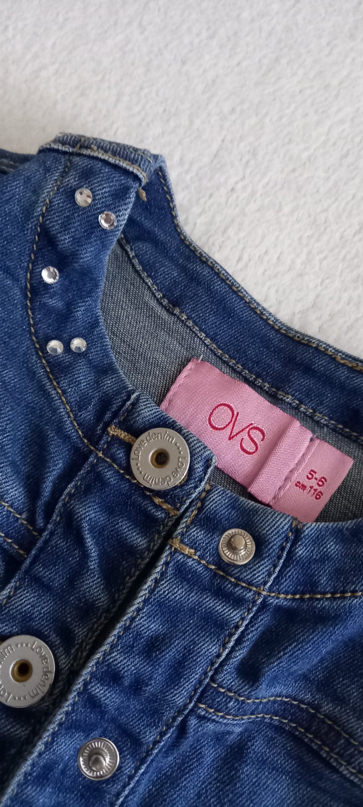 Štýlová riflovka pre dievčatká zdobená kamienkami. Zapínanie vyzerá ako gombíky ale sú to patentky- takže rýchle pozapínanie. Super stav.