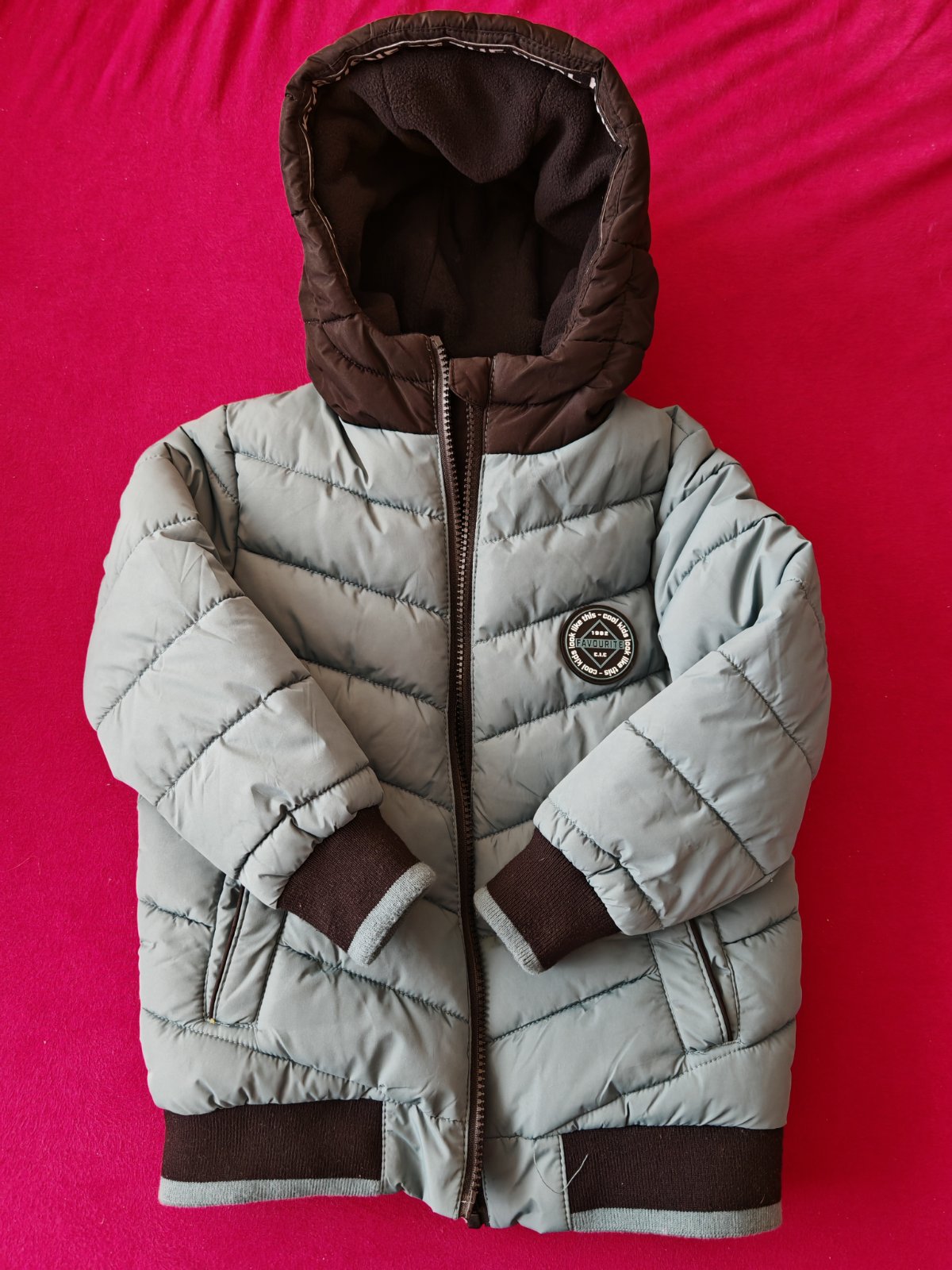 Krásna bunda Hrubá Min.nosená Neposkodena Krásny stav Odnímateľná tepláková kapucňa Farba pekná sivá Chlapčenská, ozaj pekna...