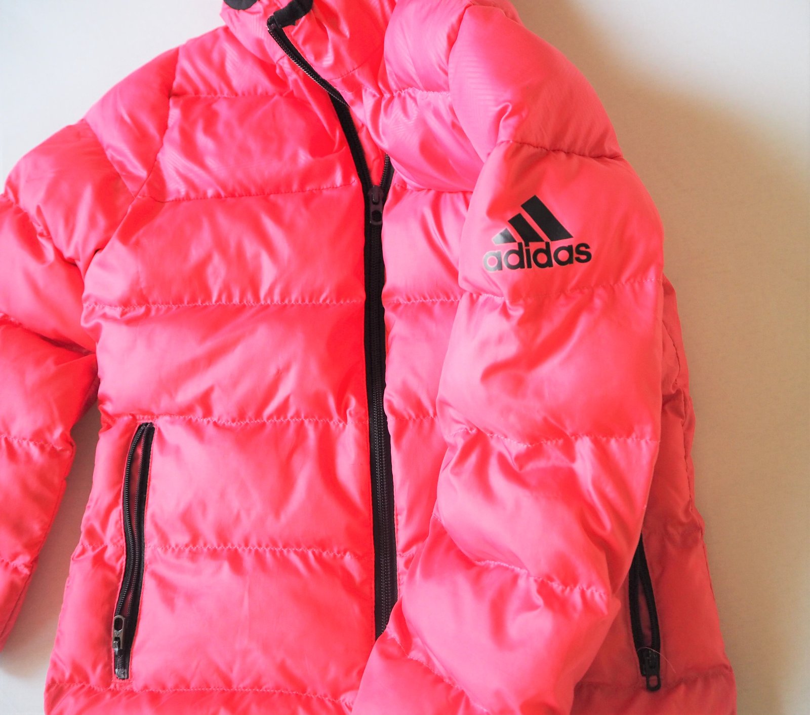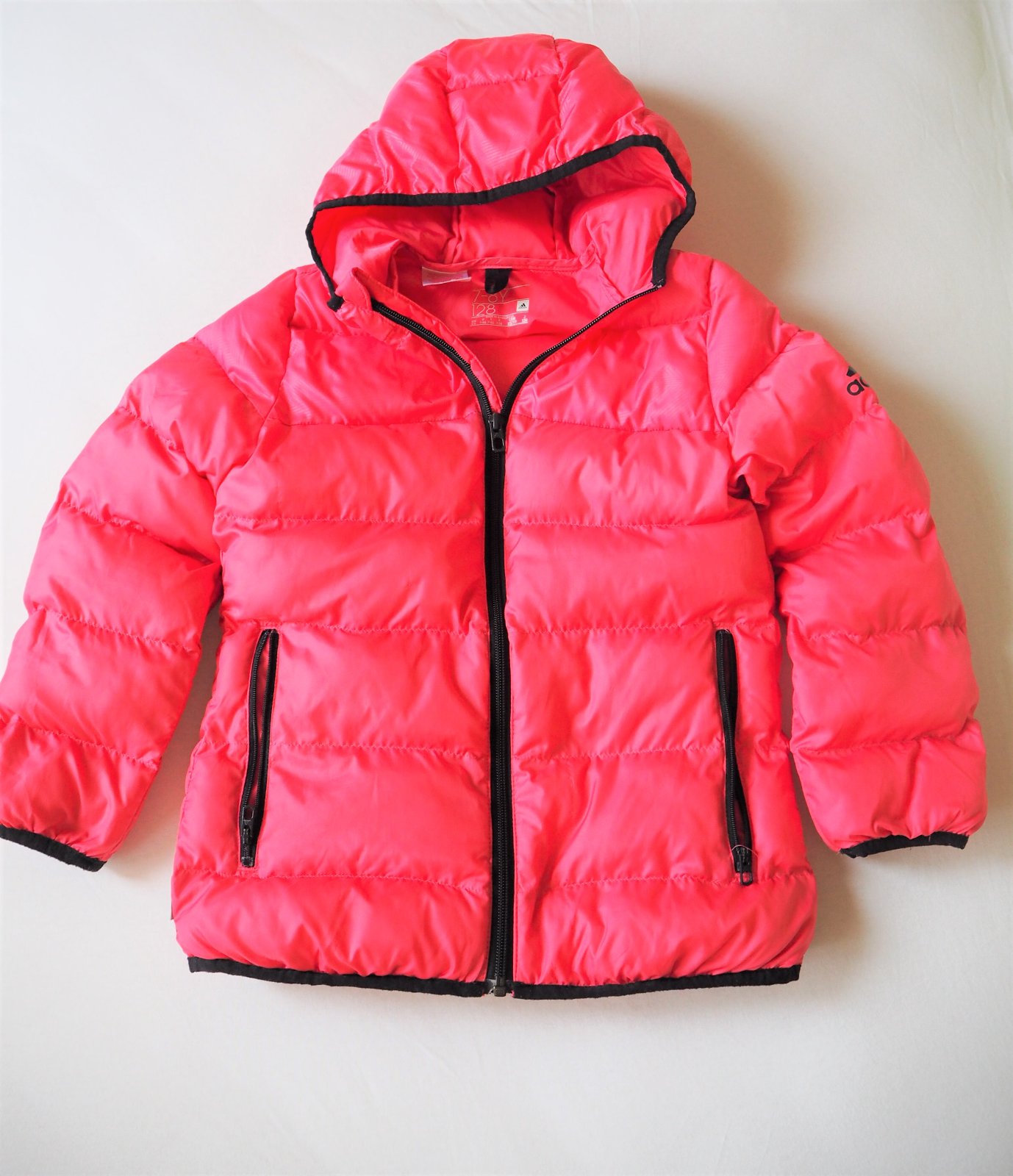 bez fľakov a poškodení, až na nepatrné zatiahnutie na ľavej strane pri vrecku! viď posledné foto! pri nosení nevidieť, zohľadnenie v cene! farba je asi o odtieň bledšia, nedá sa mi to lepšie nafotiť, všetky zipsy funkčné, my sme nosili ako 122/128 výplň je duté vlákno + bez kostrnkove perie,