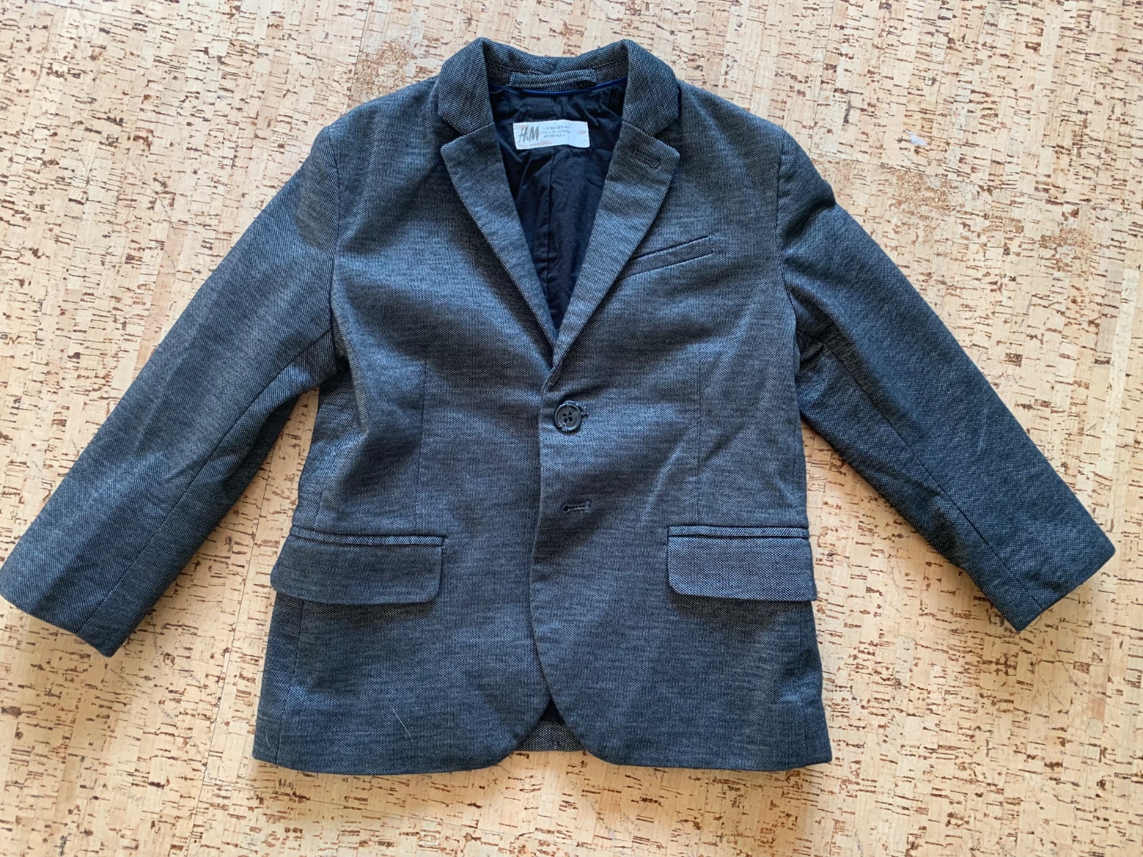 Detske sako, farba antracitova s bledymi frckami. Zapinanie na gombik, vpredu dve vrecka a v zadu maly razporok. Znacka Okaidi, velkost na 3-4 roky -104cm vyska. Oblecene parkrat na fotenie. Top st...