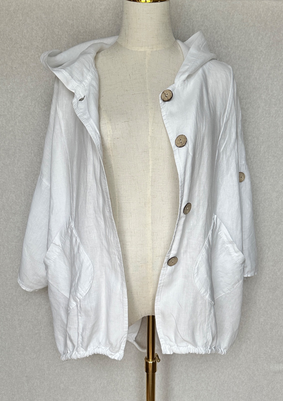 Vzdušná bunda na teplejšie prechodné obdobie, alebo aj na leto ako ochrana pred slnkom. Rukávy sú rolovacie, dajú sa zopnúť zrolované do manžety na gombík. Bunda je v super stave, bez poškodení. Sedí aj na menšie veľkosť - vyzerá štýlovo aj ako oversized. 100% ľan.