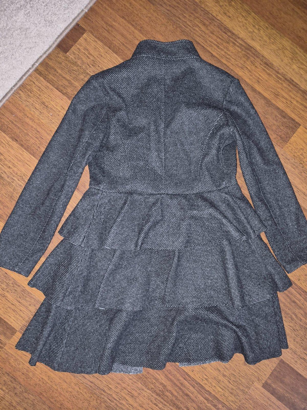 krásne štýlové sačko Zara, veľkosť S, tmavosivej až čiernej farby, podšité, vzadu krytý rozparok, rukávy na pleciach nazbierané, vpredu dve vrecká, zapínanie na jeden gombík, veľmi pekné, top stav