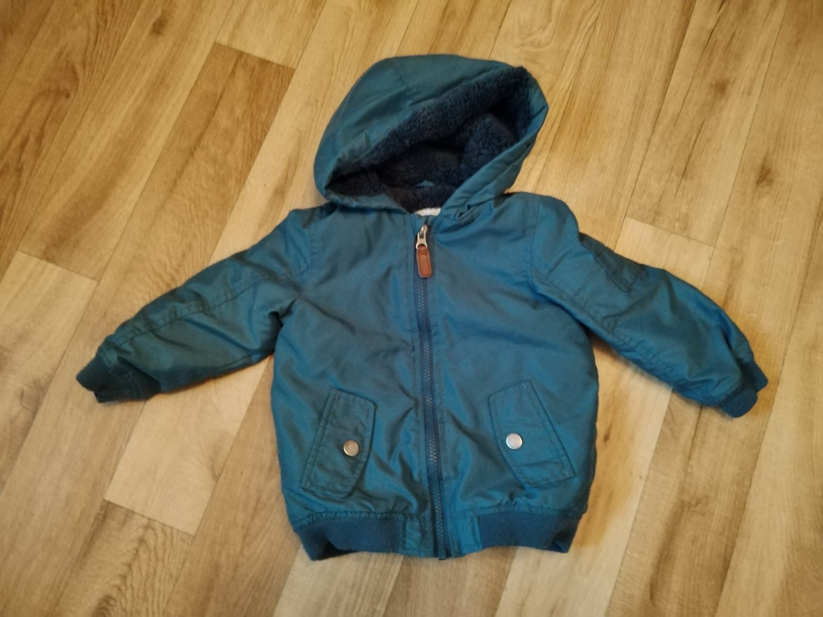 Krasna bundička, tenká, na rukávoch podšívka, ostatné časti sú podšité tenkým flísom. Velkost na stitku je uvedena 80 no je vacsia, tak 86-92. Nosili sme ju do skoro 3 rokov :) Bundicka je v peknom...