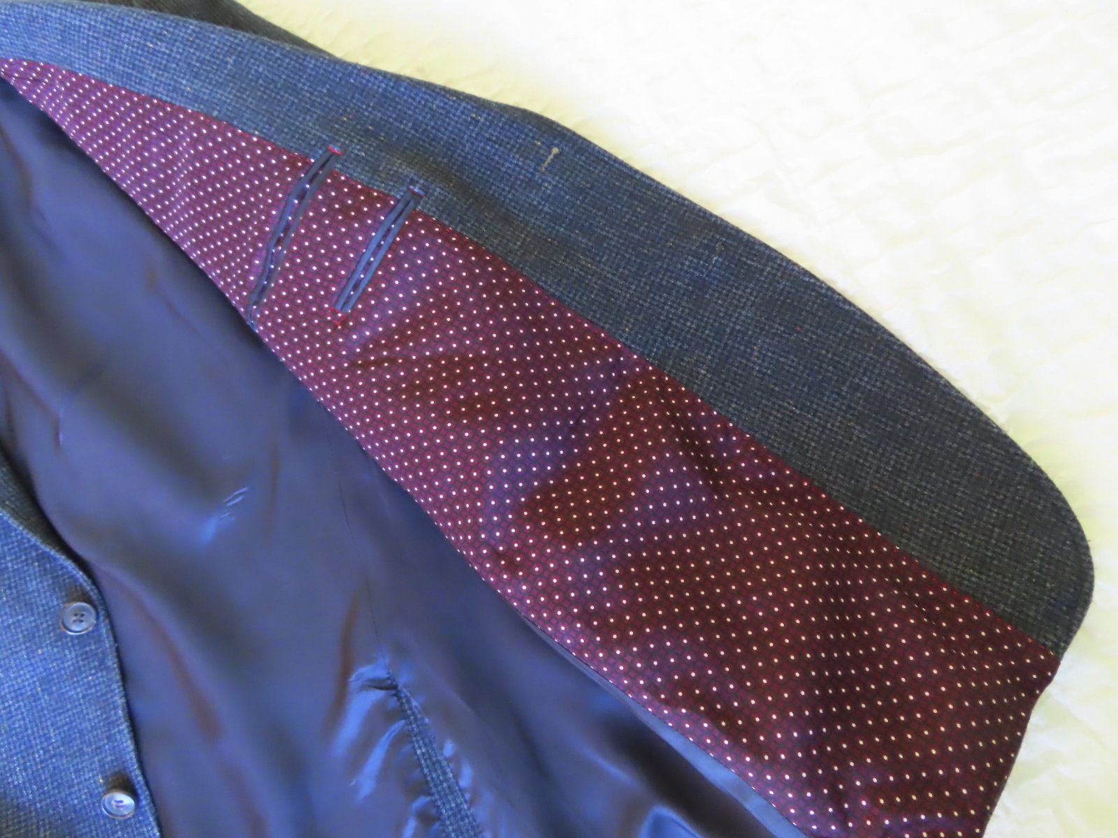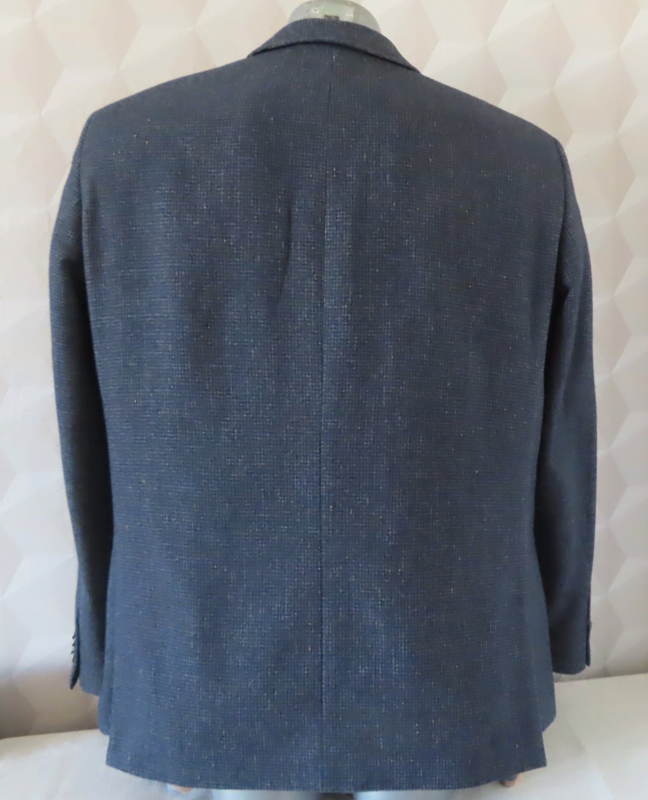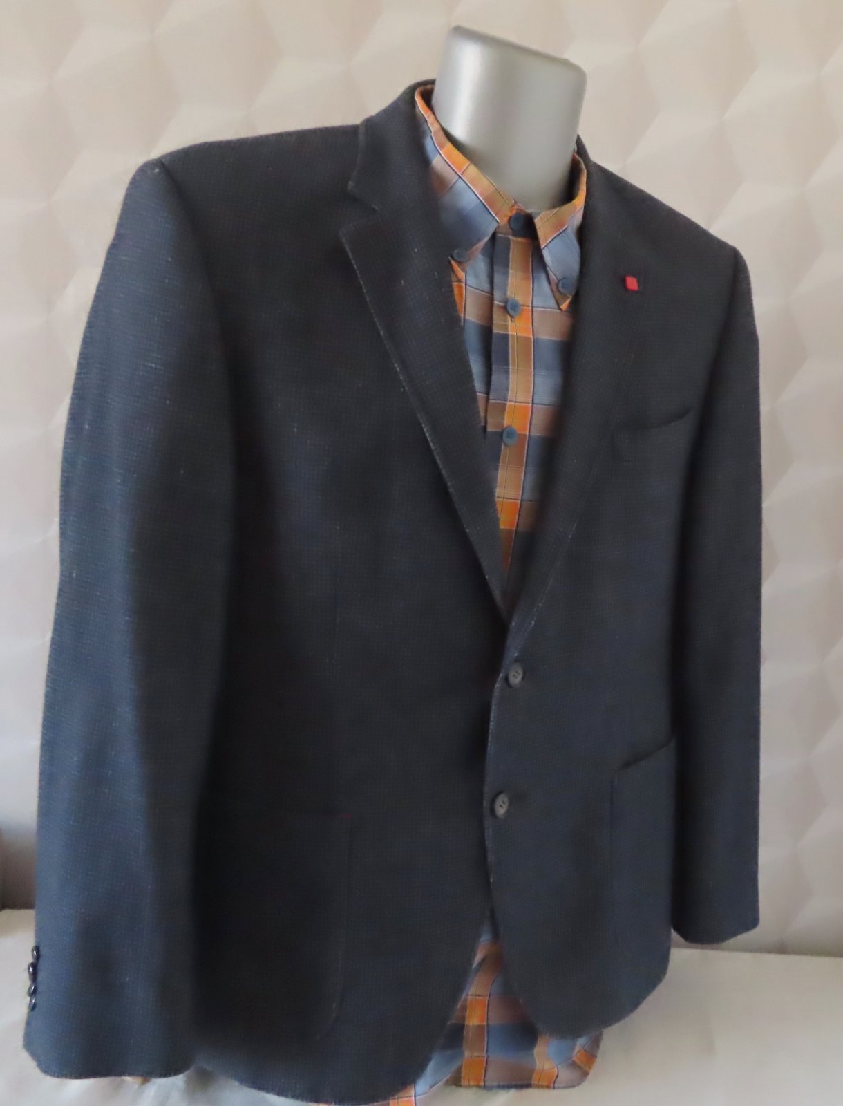 Sako nosené, veľmi dobrý stav, ale upozorňujem že vzadu na podšívke je malé zatrhnutie od vešiaka - viď posledná fotka, nijako nevidieť pri nosení, zohľadnené v cene.