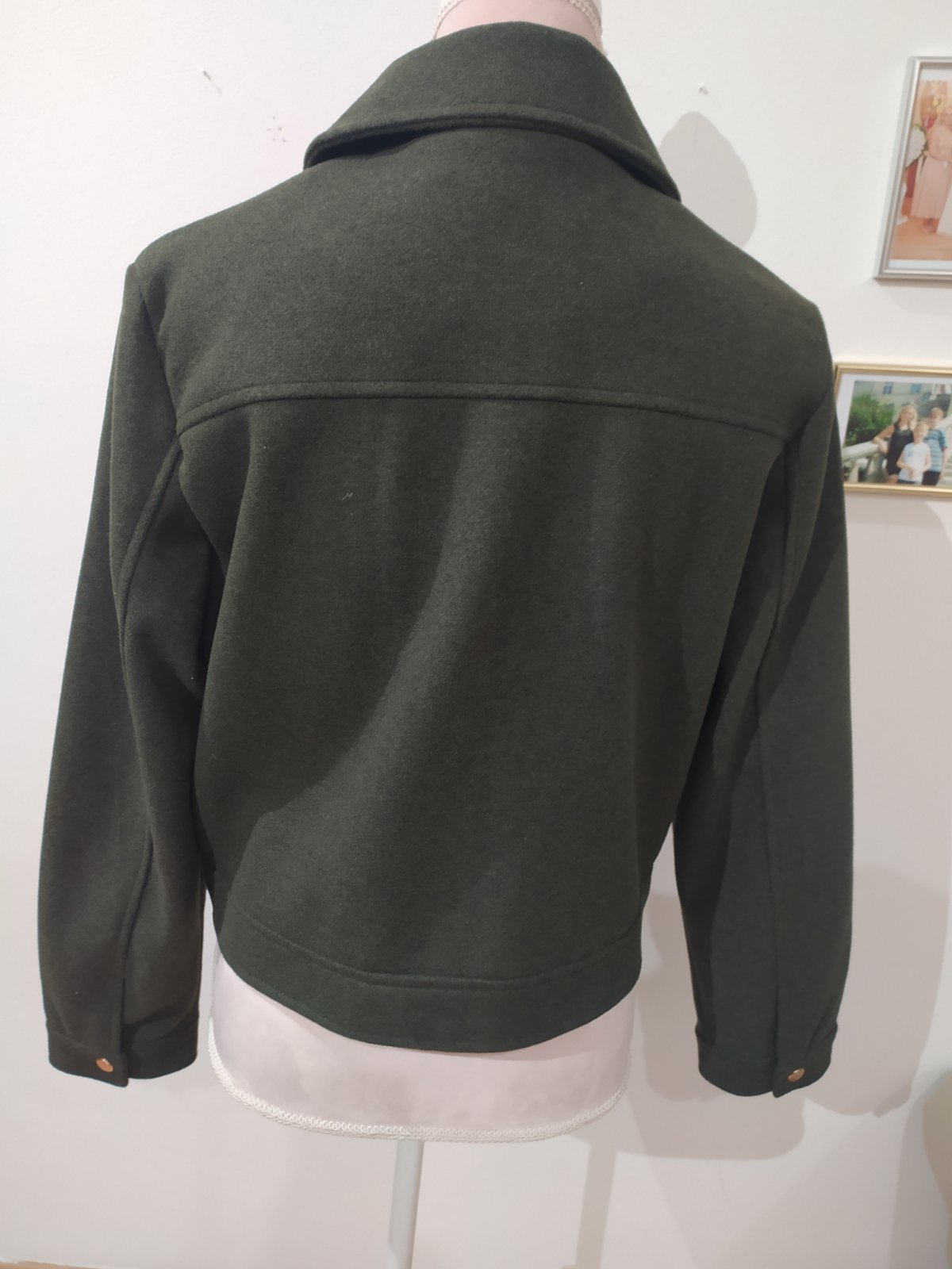 Prechodná 3/4 bunda, v páse a dole stiahnutá šnúrkou - parkový strih. Na ľavom rukáve je mierne poškodená látka- viď. foto. Rozmery sú uvedené na fotkách.