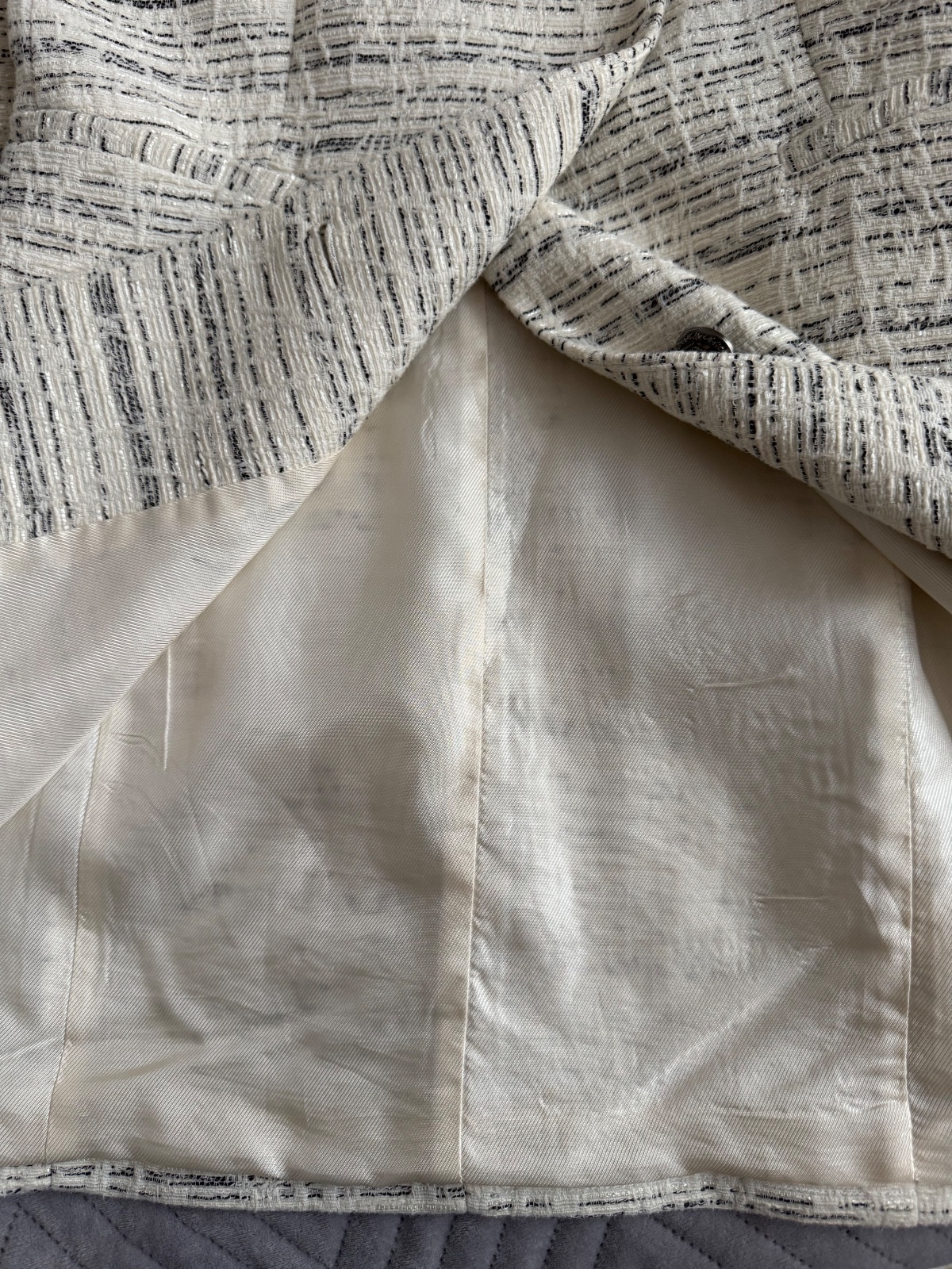 Párkrát vzaté, vidno hlavne z vnútornej strany (zatiahnutia, viď foto). Veľkosť XS, S, ale sedí aj na M. Farba krémová. Opasok nie je súčasťou predaja.