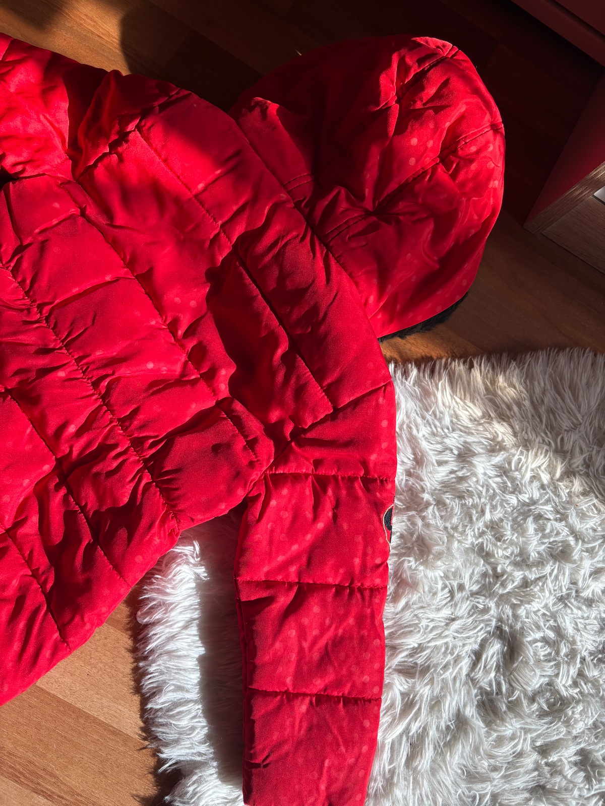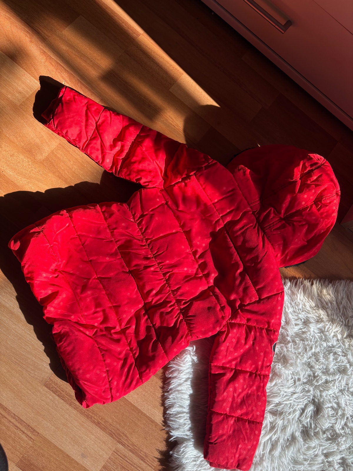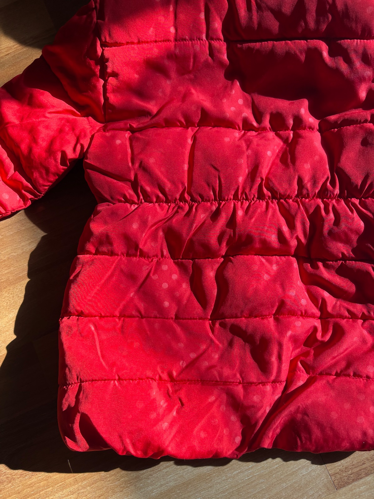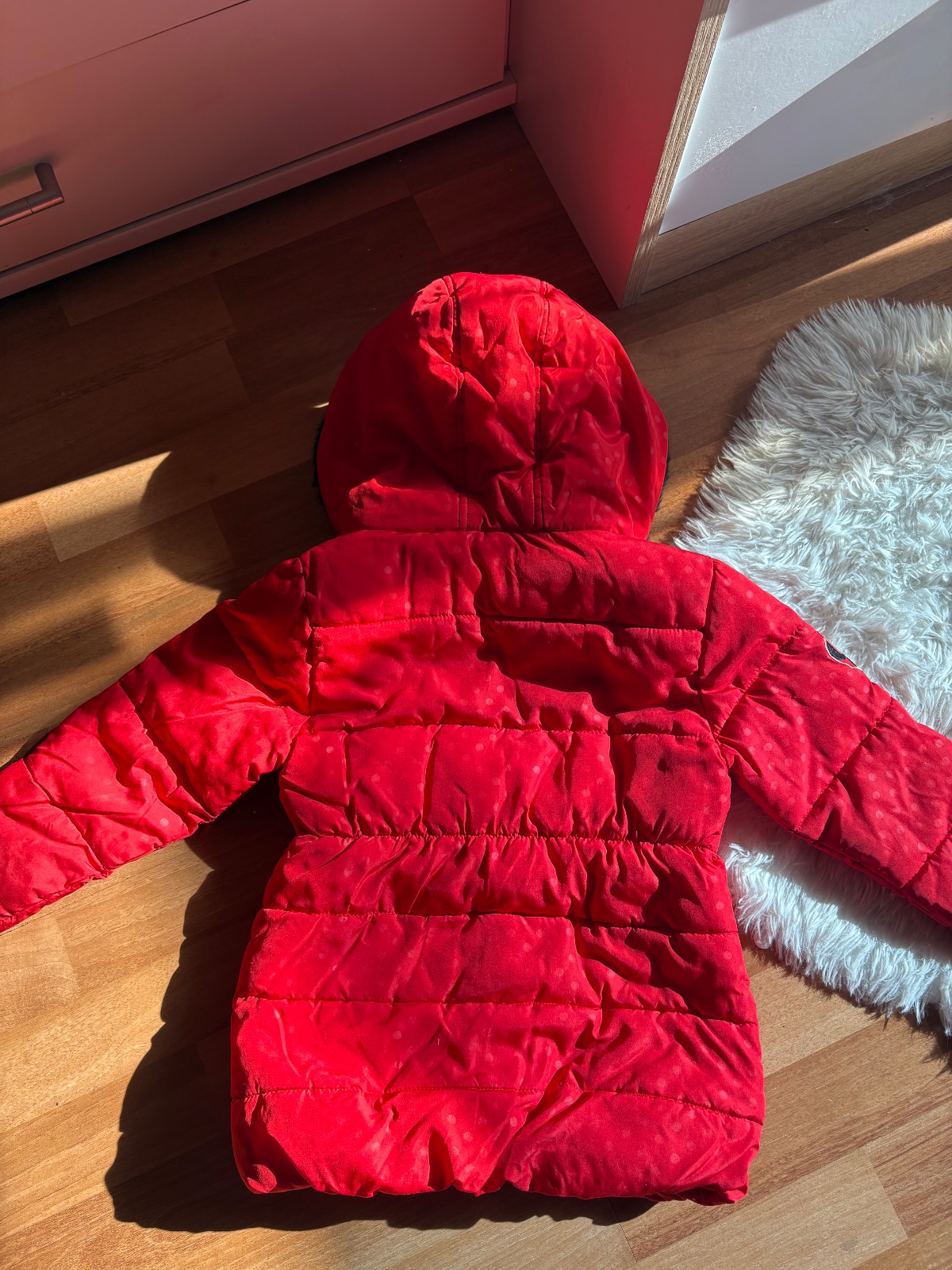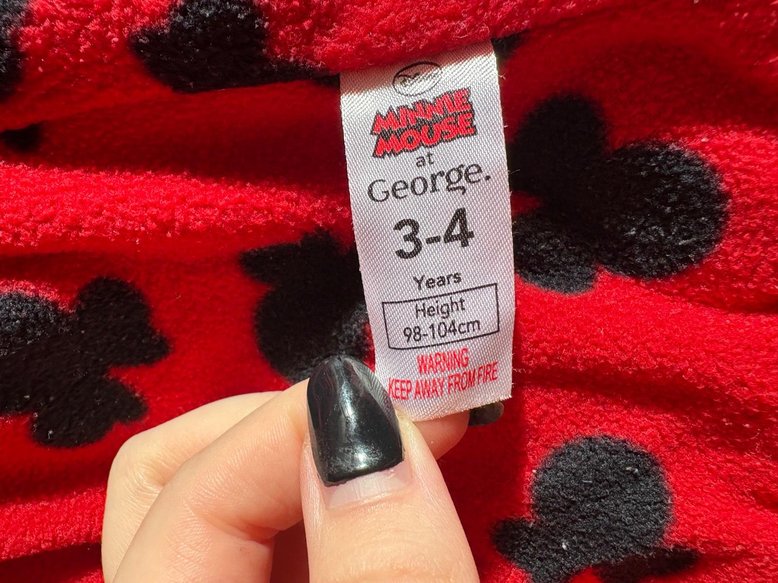 Veľkosť 98/104. Stále v dobrom stave ako na foto. Bodky sú už veľmi vyblednuté niekde skoro ani neviditeľne. Zips je funkčny. Mašľa v bok sa zapína na patent.
