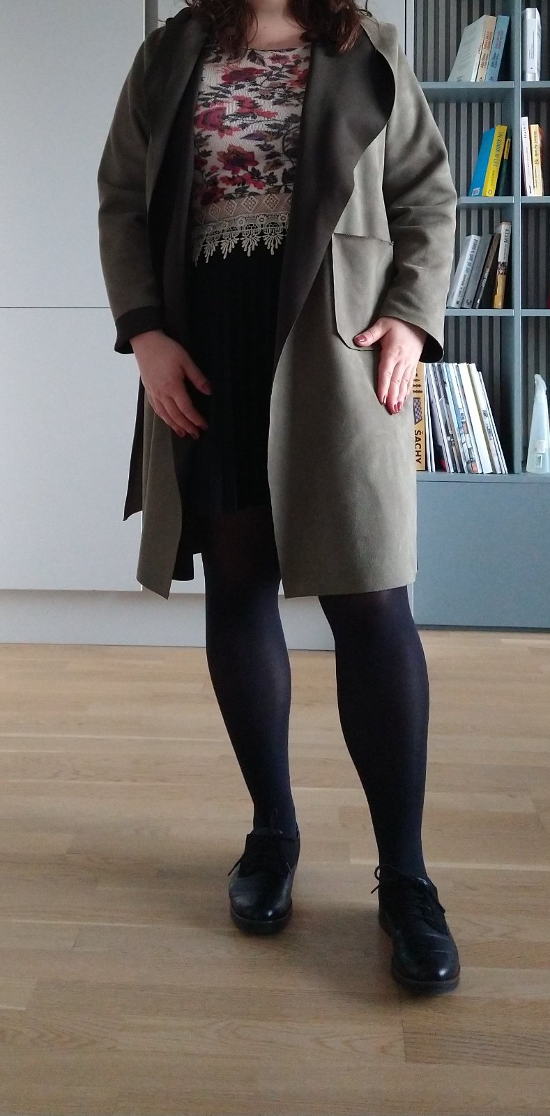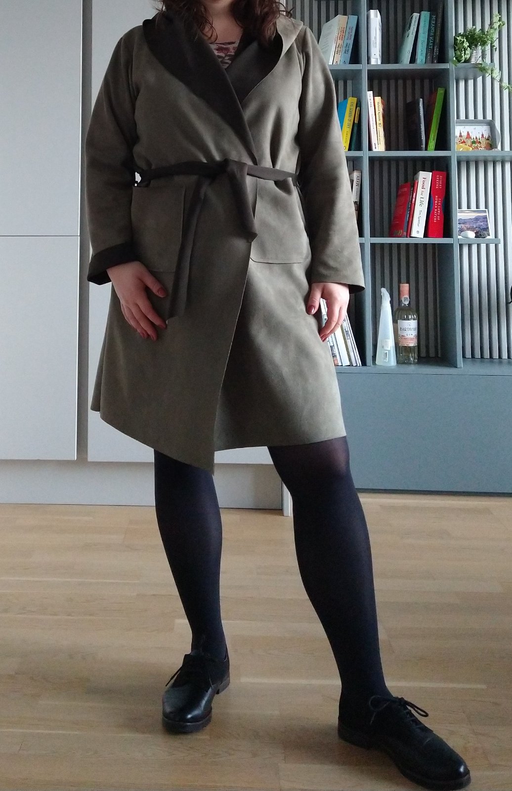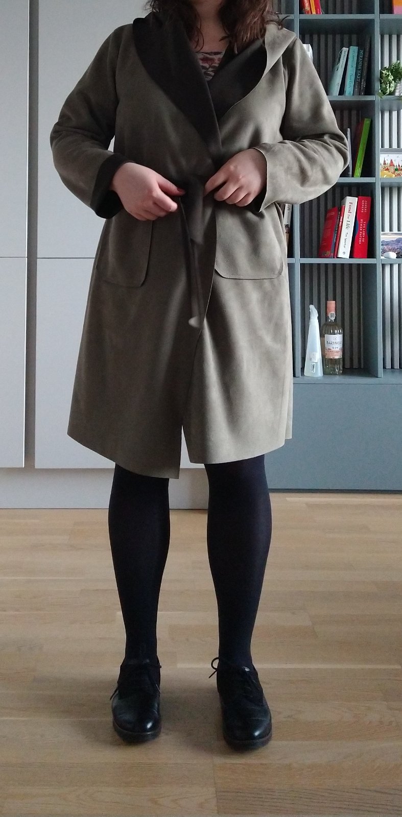 Tlmený zelený semišový kabátik, voľný s opaskom so zaväzovaním ako župan, má dve vrecká a kapucňu. Nosené na jeseň, je super, len farba sa mi nehodí. Veľ. L/XL