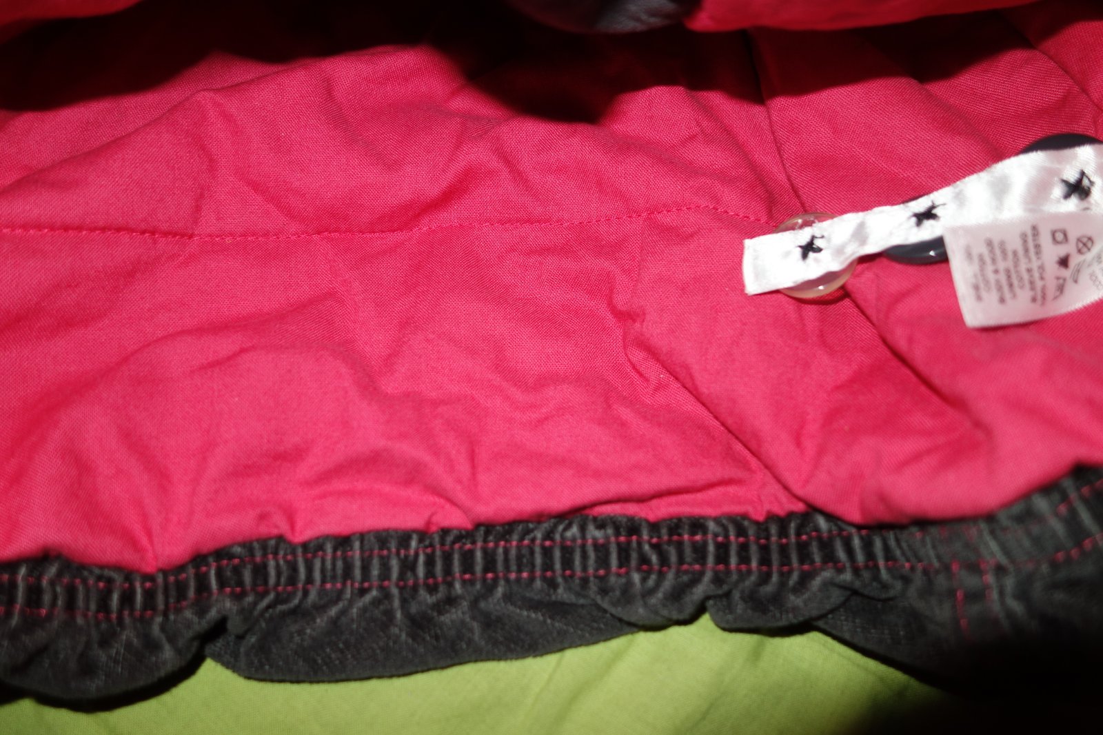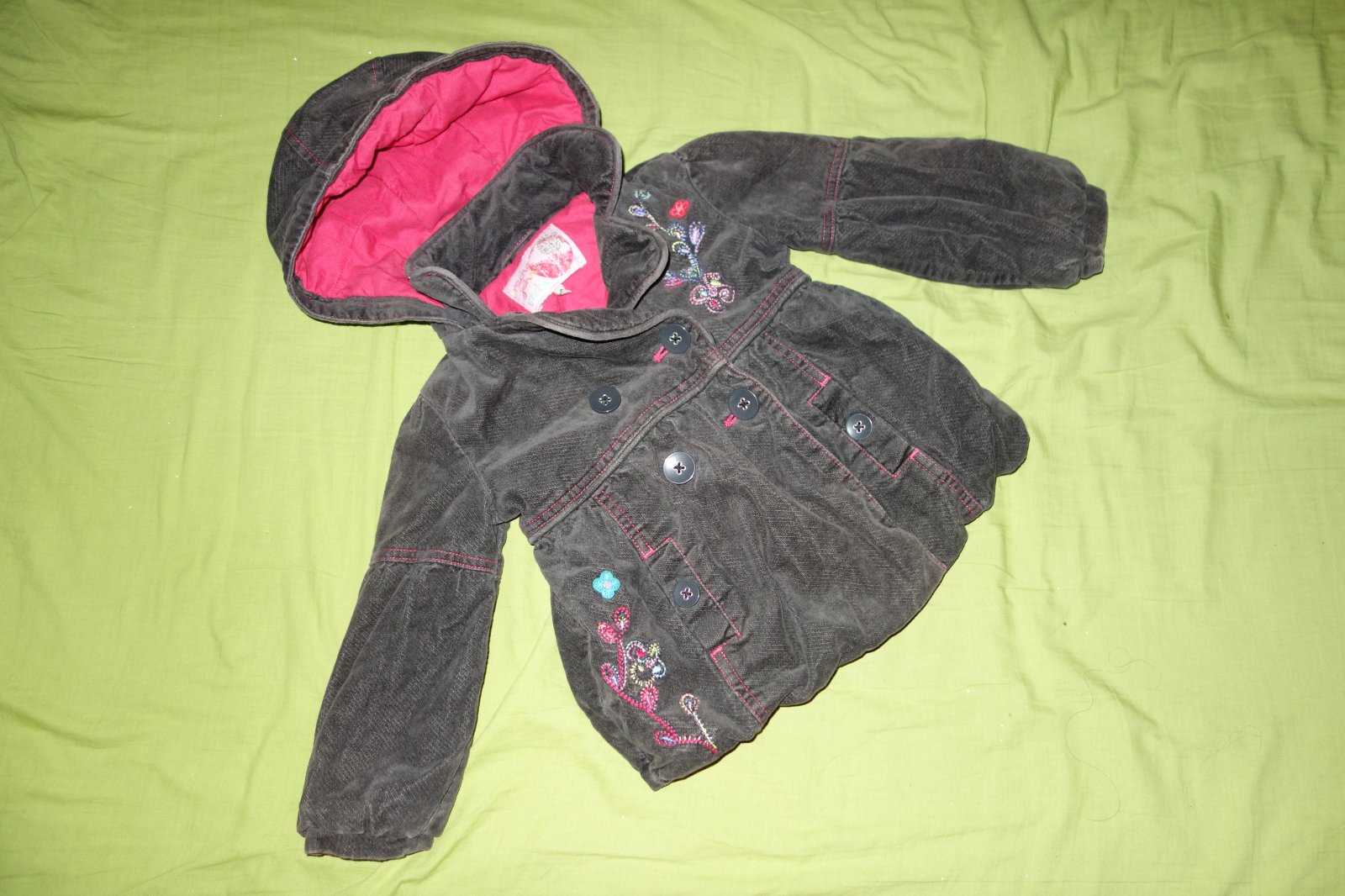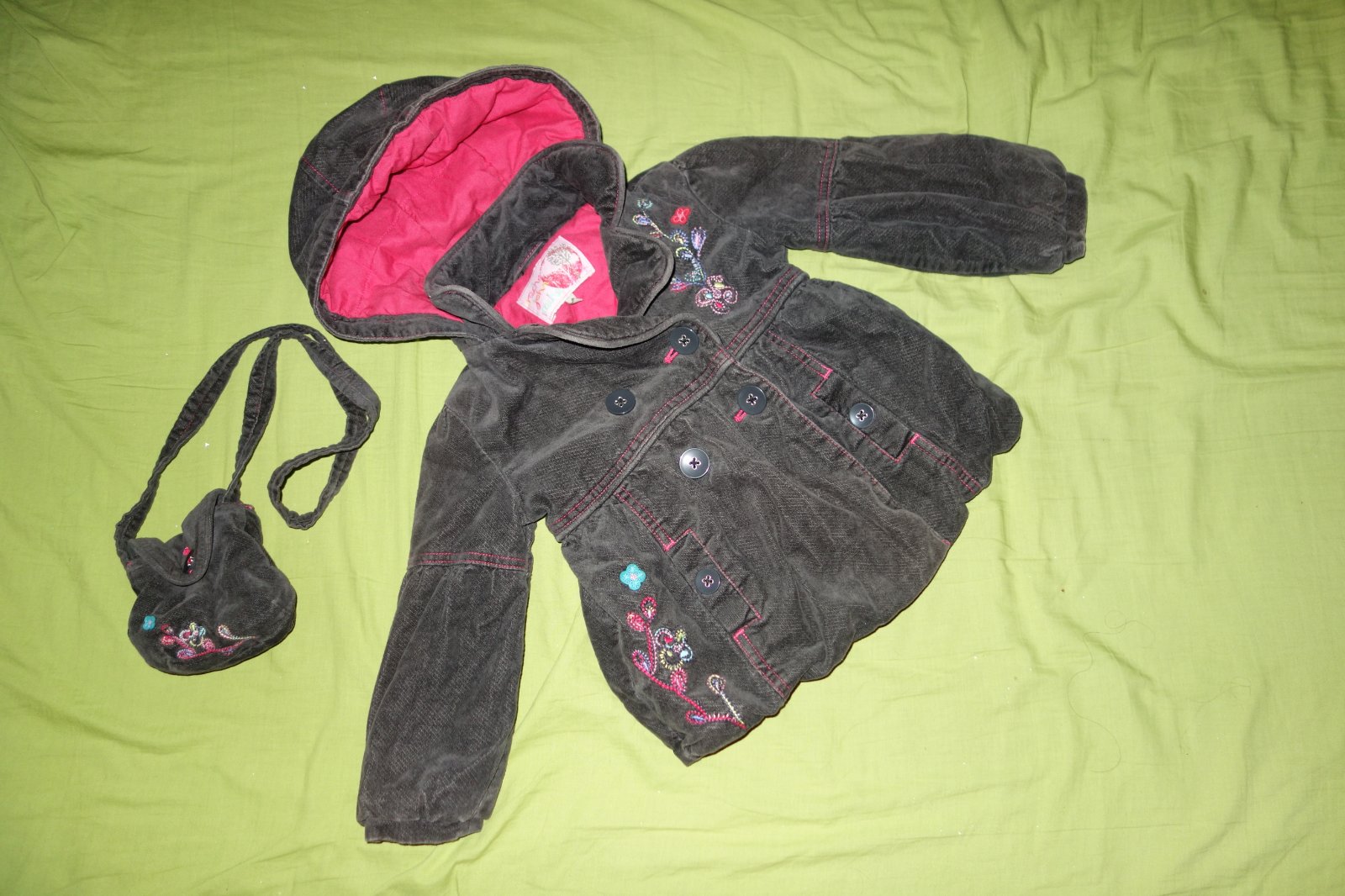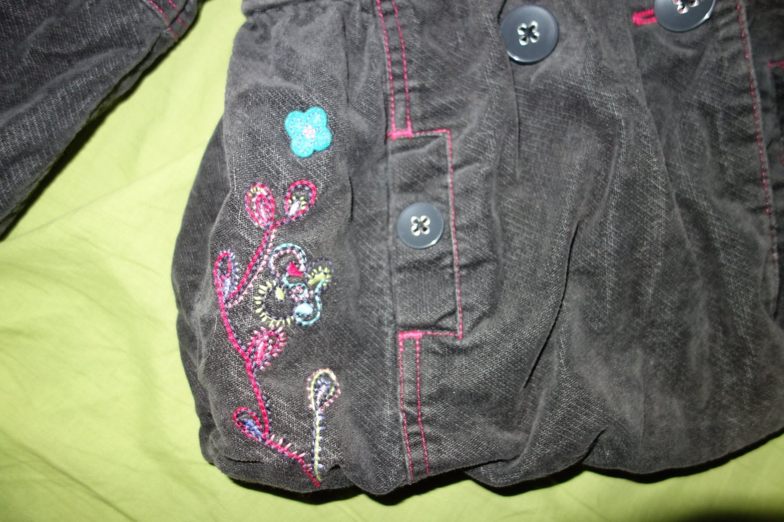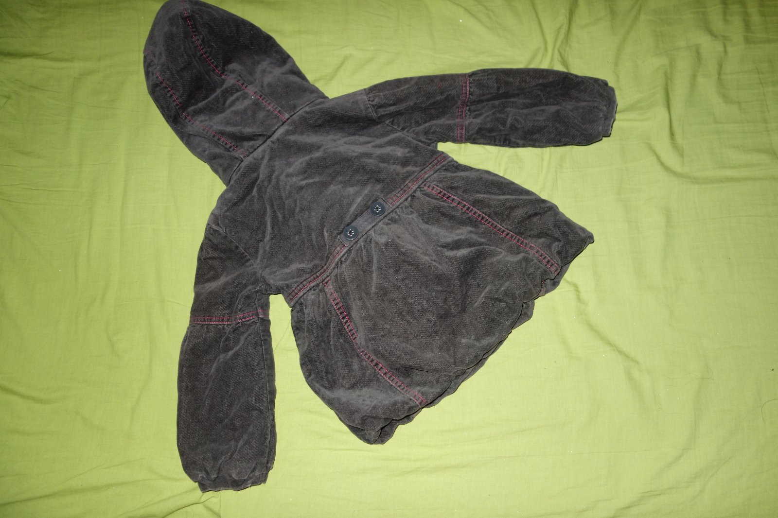 Zimna bundicka/kabatik vo velmi dobrom stave. Farba je tmavosiva (tmavsia ako na fotke) malinko by som povedala, ze zachadza do hneda. Material zvrchu je podobny zamatu- plysu, taky makkucky. Kabatik je zatepleny vatelinom a podsity ruzovou latkou podobnou koselovine, ale nie je uplne hrubizny. Velkost je uvedena ako 104, ale je mensi.2