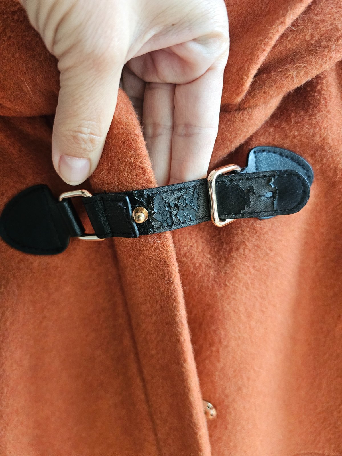 Jedina známka nosenia ja osupana koženka na pracke pod krkom, ale je to vidno len keď je rozopnuta. Keď ju zapnete je to skryté ako vidno na foto.