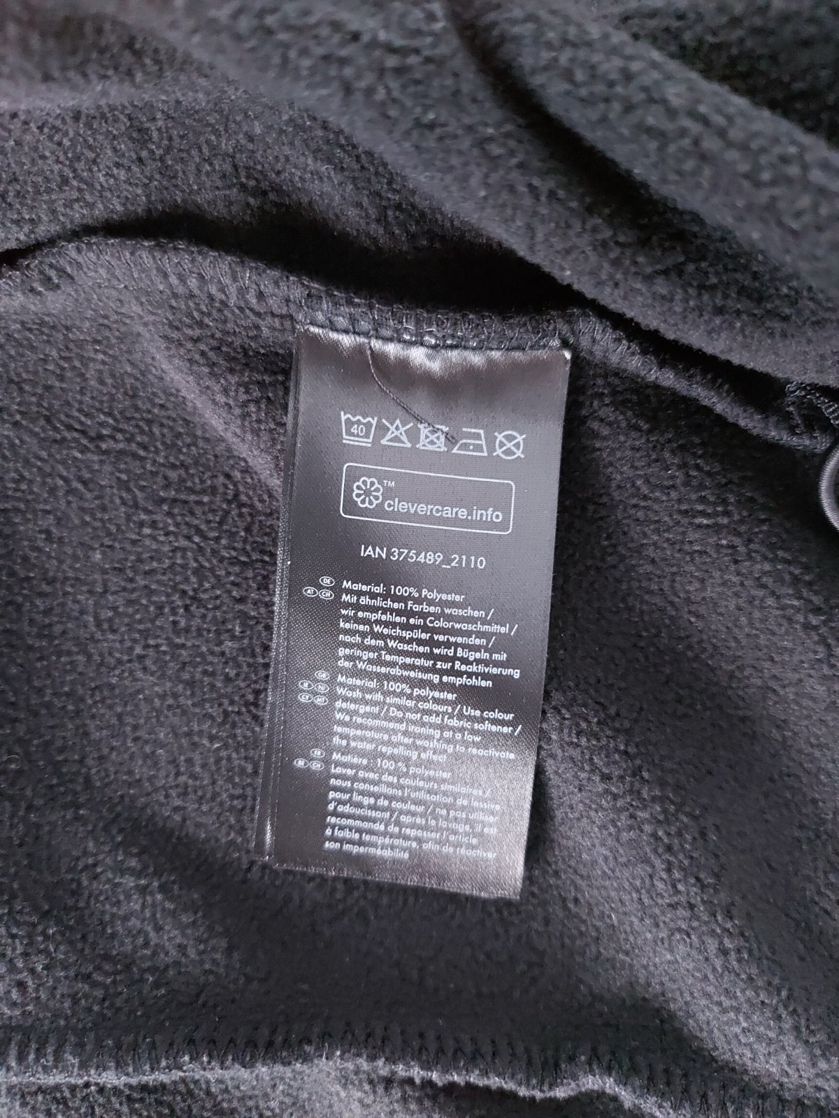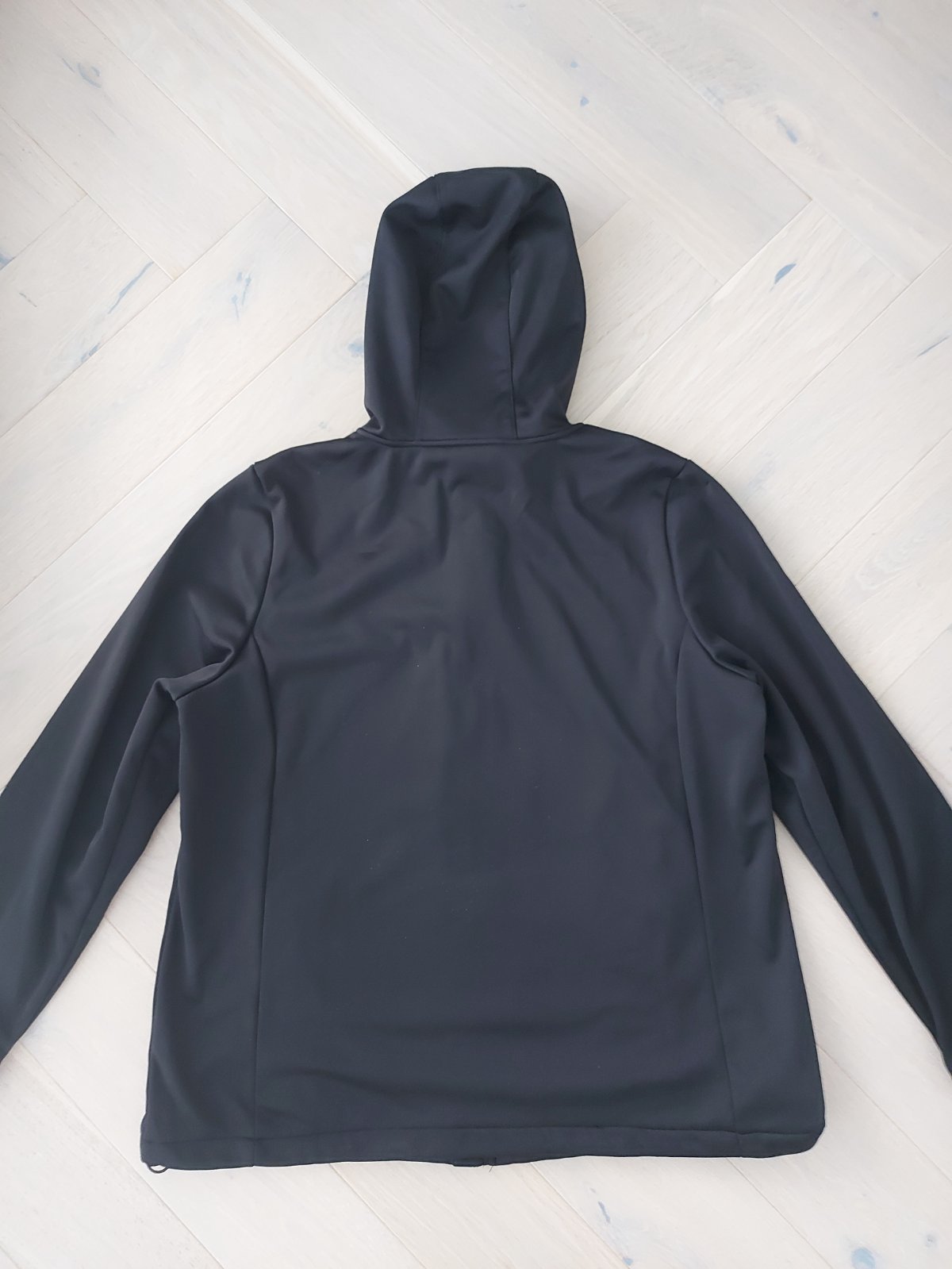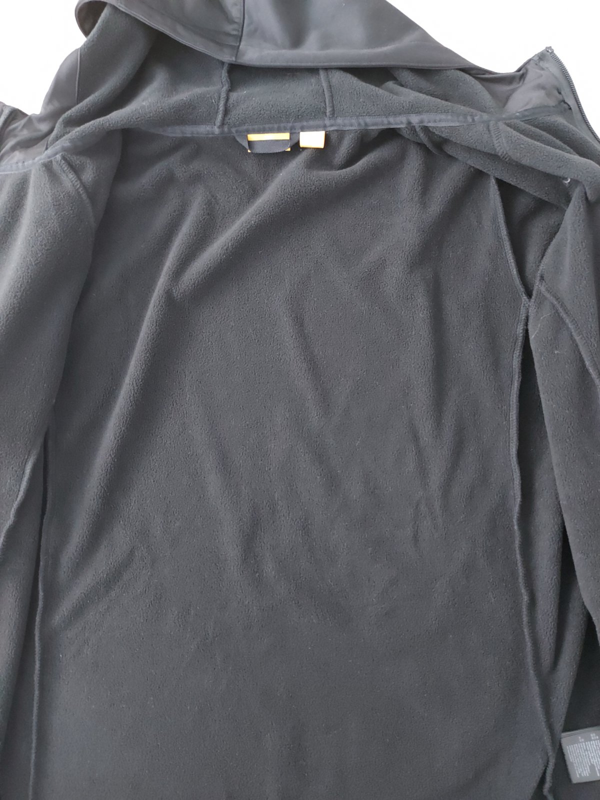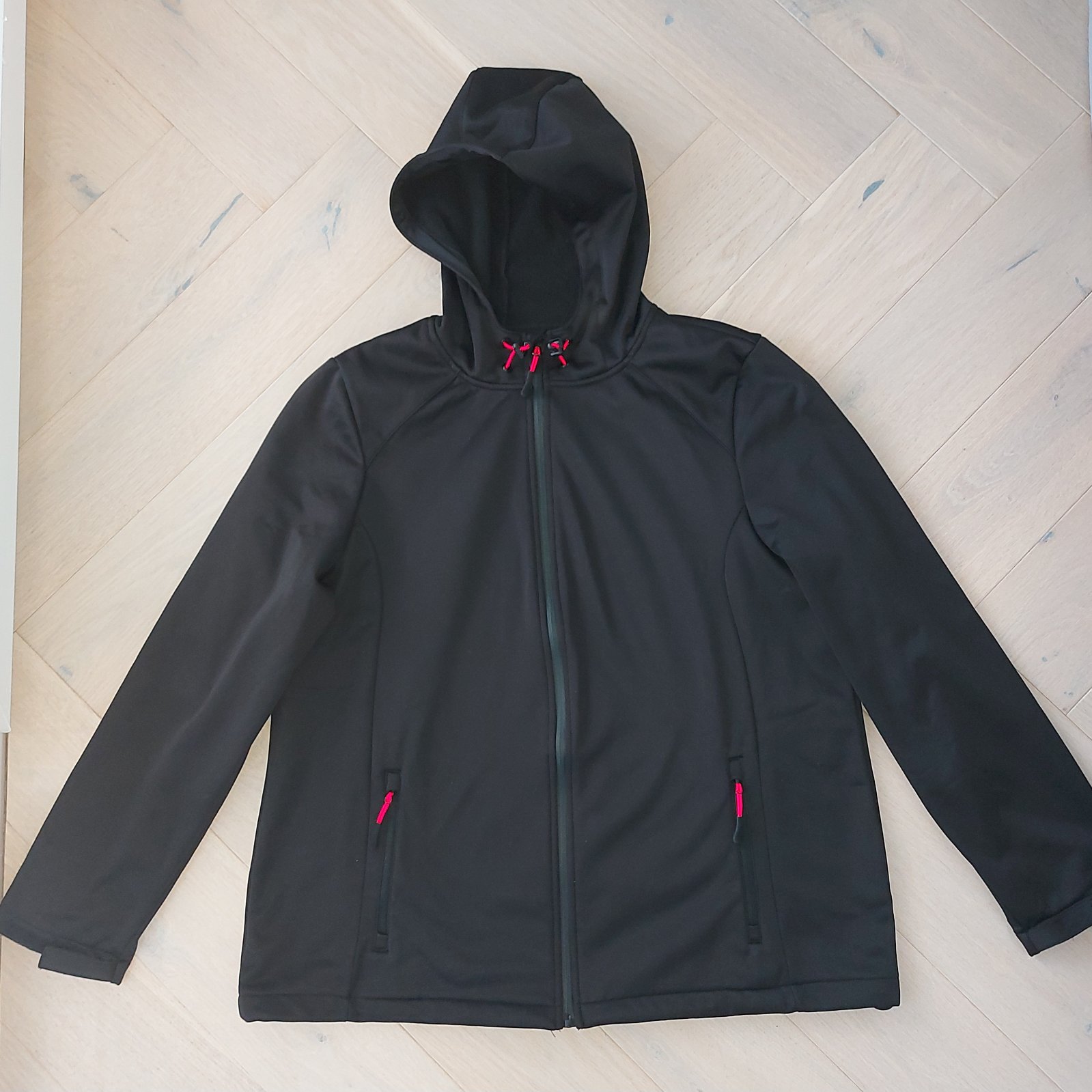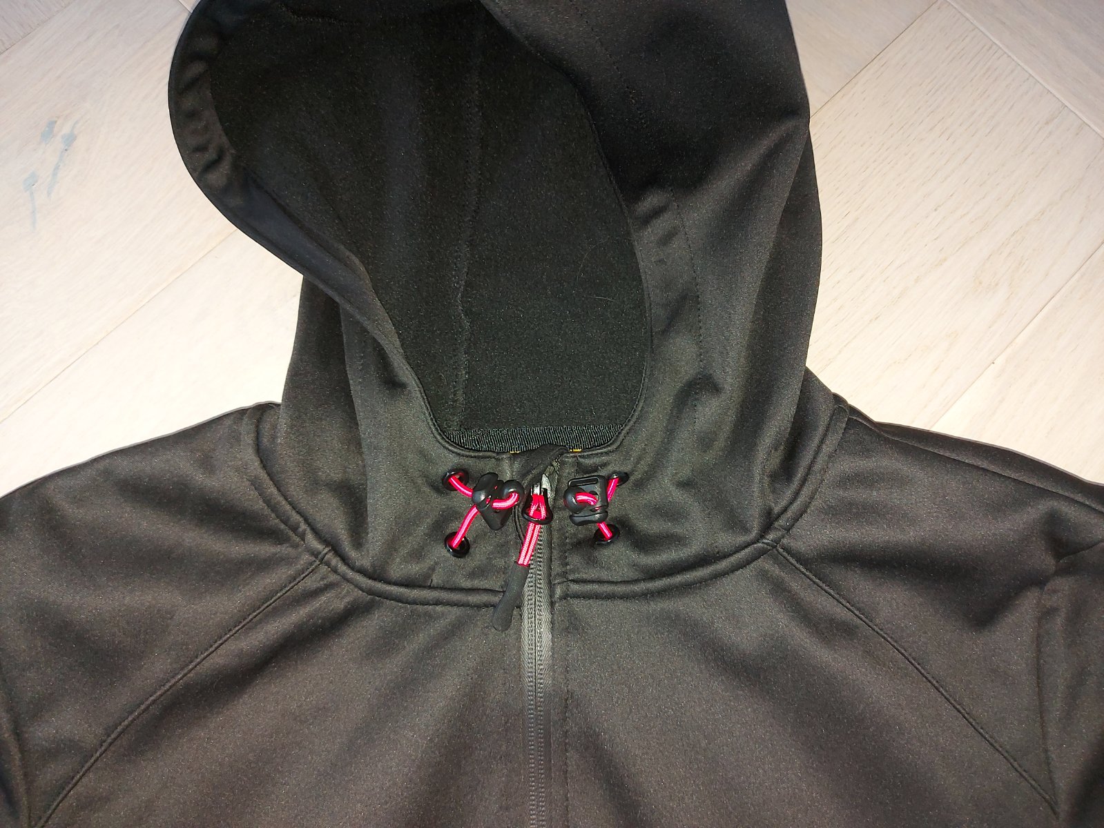 Malo nosená dámska softshellová bunda, veľkosť 44/46 (L), čierna, podšitá flisom tiež čiernej farby, šnurky na kapucni a zipsoch sú neónovej ružovej farby.