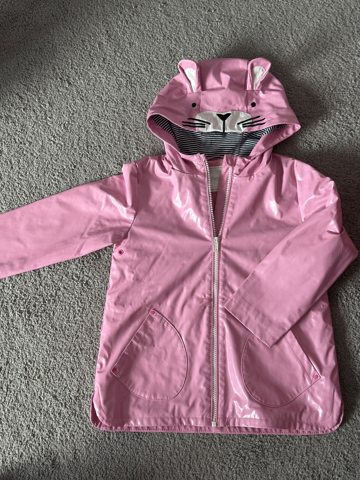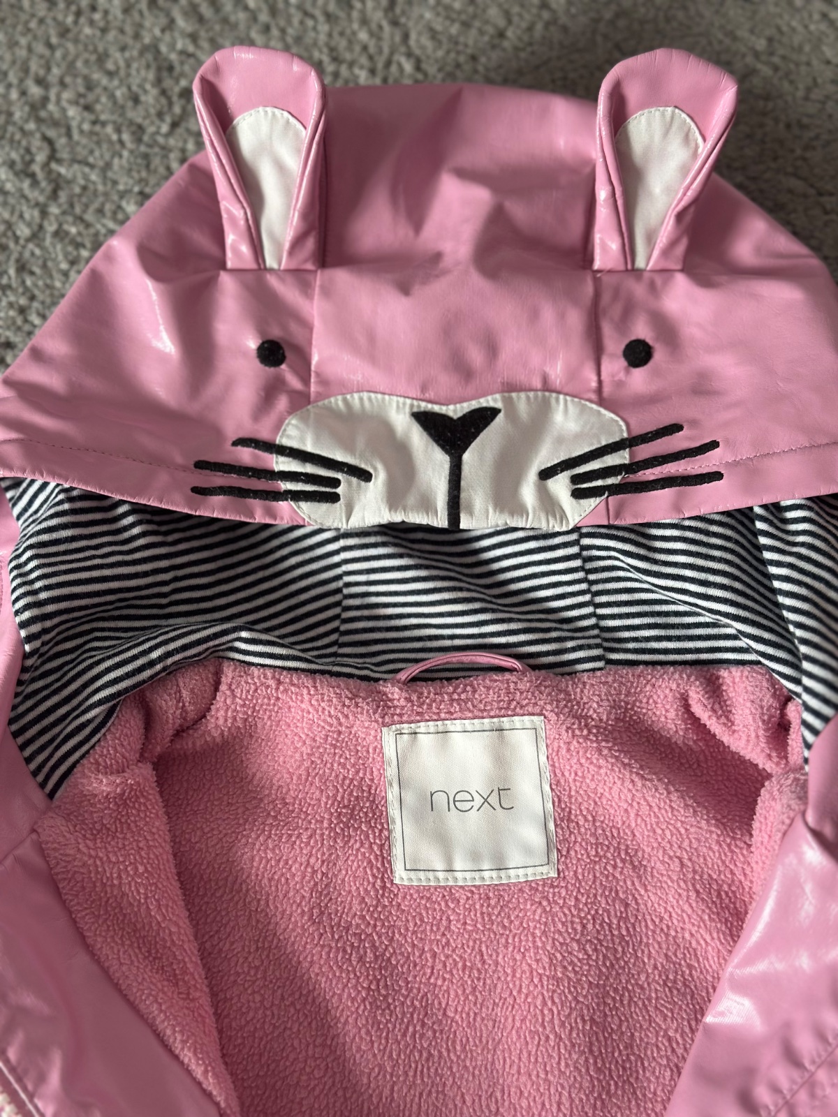 Krásny a kvalitný, nepremokavý kabátik, zvnútra zateplený, na vrchu pogumovaný, vhodný do vetra a dažďa s milou ozdobou na kapucni.