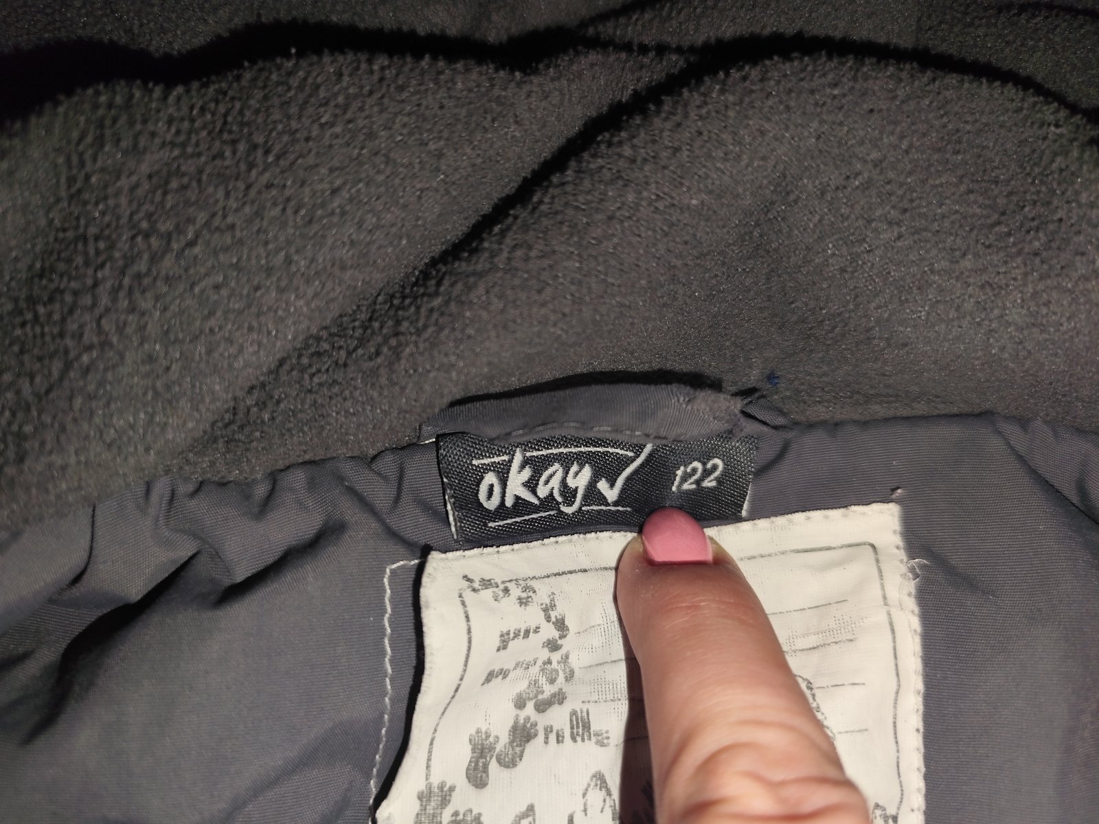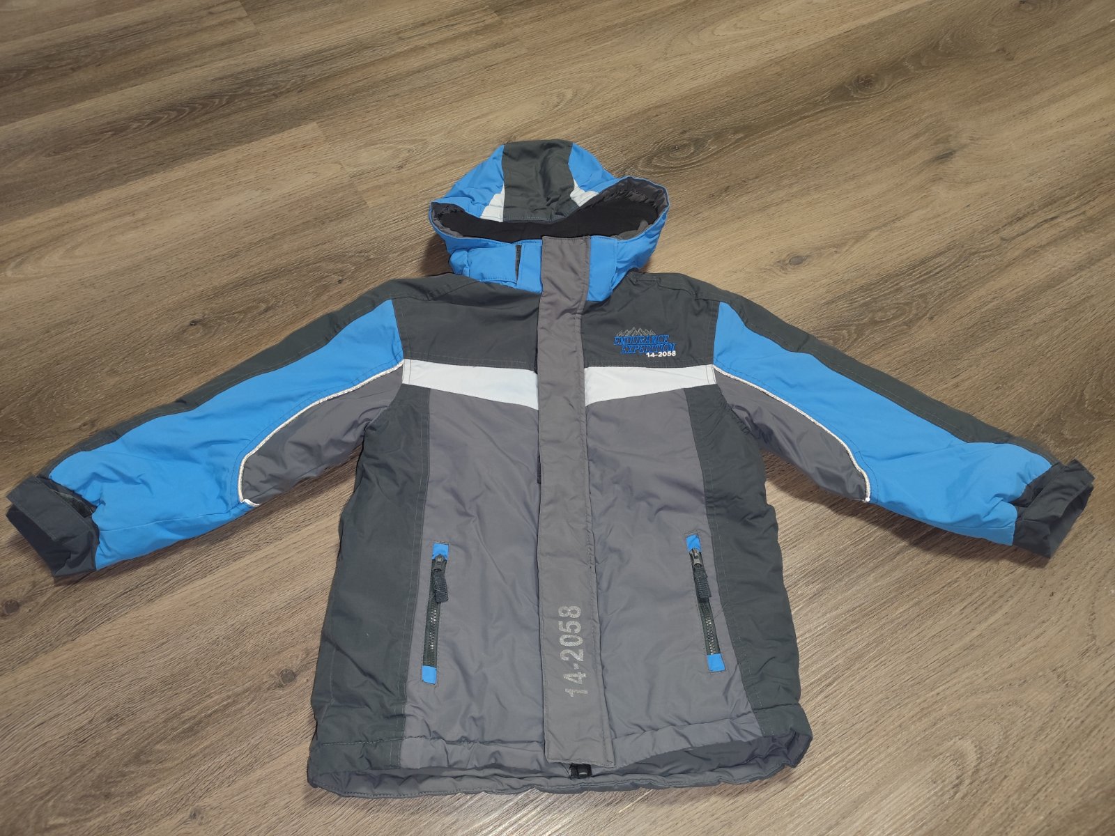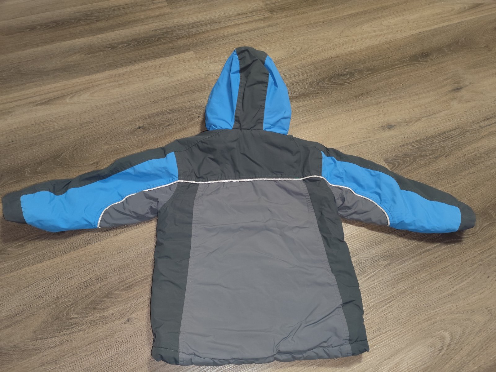Teplá šedo-modrá chlapčenská zimná bunda s kapucňou vo veľmi dobrom stave, na štítku uvedená veľkosť 122, značka okay.