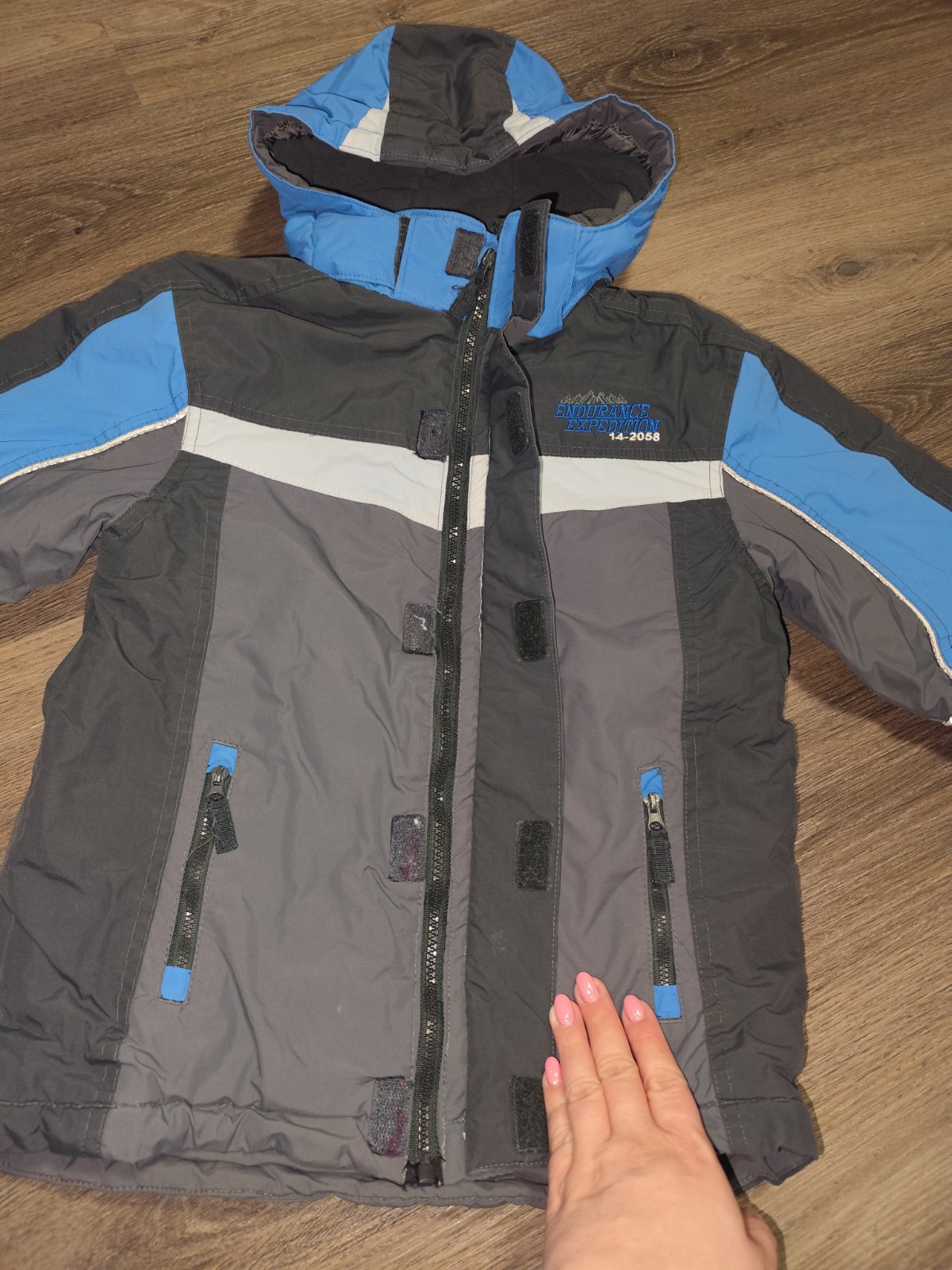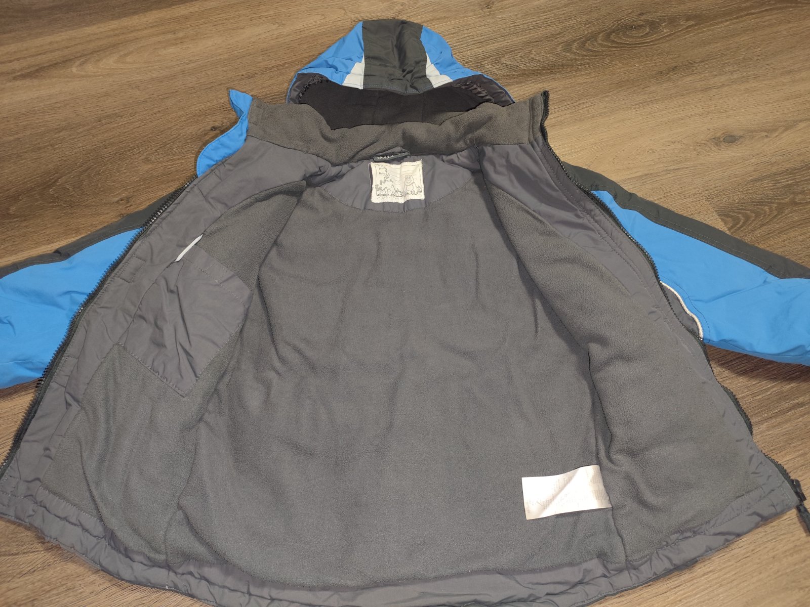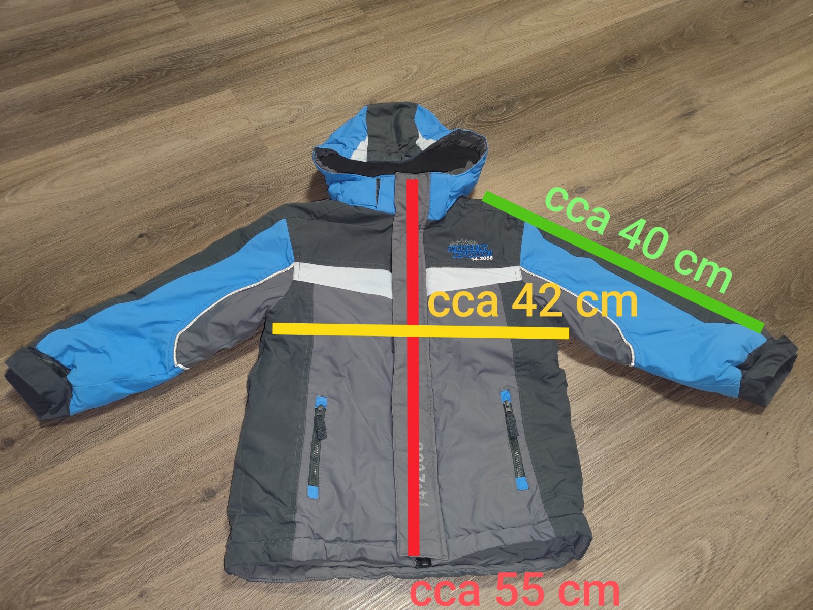 Teplá šedo-modrá chlapčenská zimná bunda s kapucňou vo veľmi dobrom stave, na štítku uvedená veľkosť 122, značka okay.