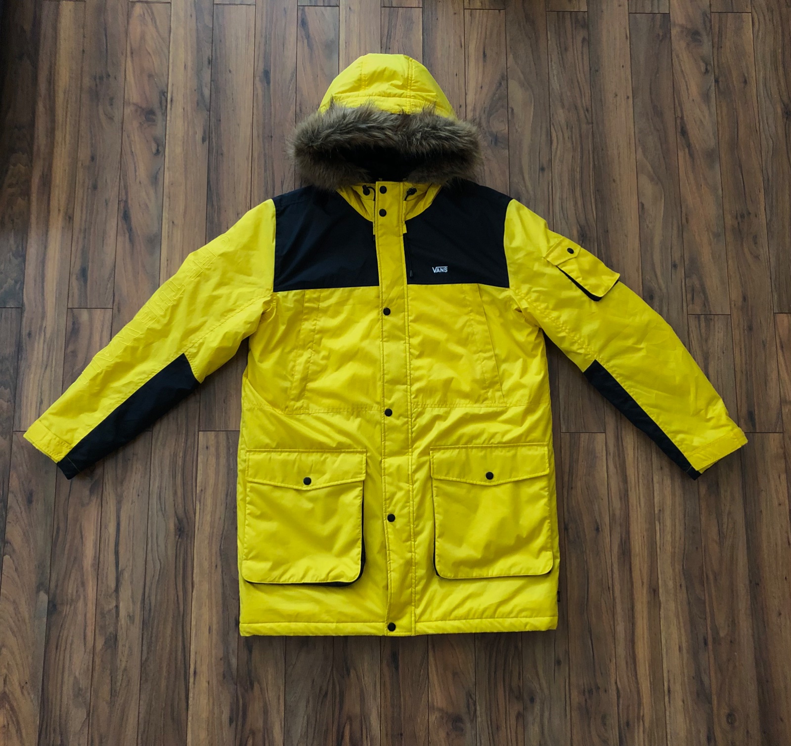 Žltá zateplená bunda Vans Sholes MTE pre pánov má sťahujúcu kapucňu s odnímateľnou kožušinoz. Je predĺžená, má 2 bočné vrecká, s otvormi zhora aj zboku, vrecko na rukáve na gombíky a dve prsné vrecká na zips. Zapína sa na obojsmerný kovový zips a patentky. Na ľavej strane hrude je umiestnené menšie biele logo značky. Konce rukávov sa sťahujú suchým zipsom. Bundu tvorí jemná hrejivá výplň. Materiál je 100% polyester na zvršku a podšívke. MTE technológia zabezpečuje vodeodpudivosť - bunda je tak vhodná do každého počasia.