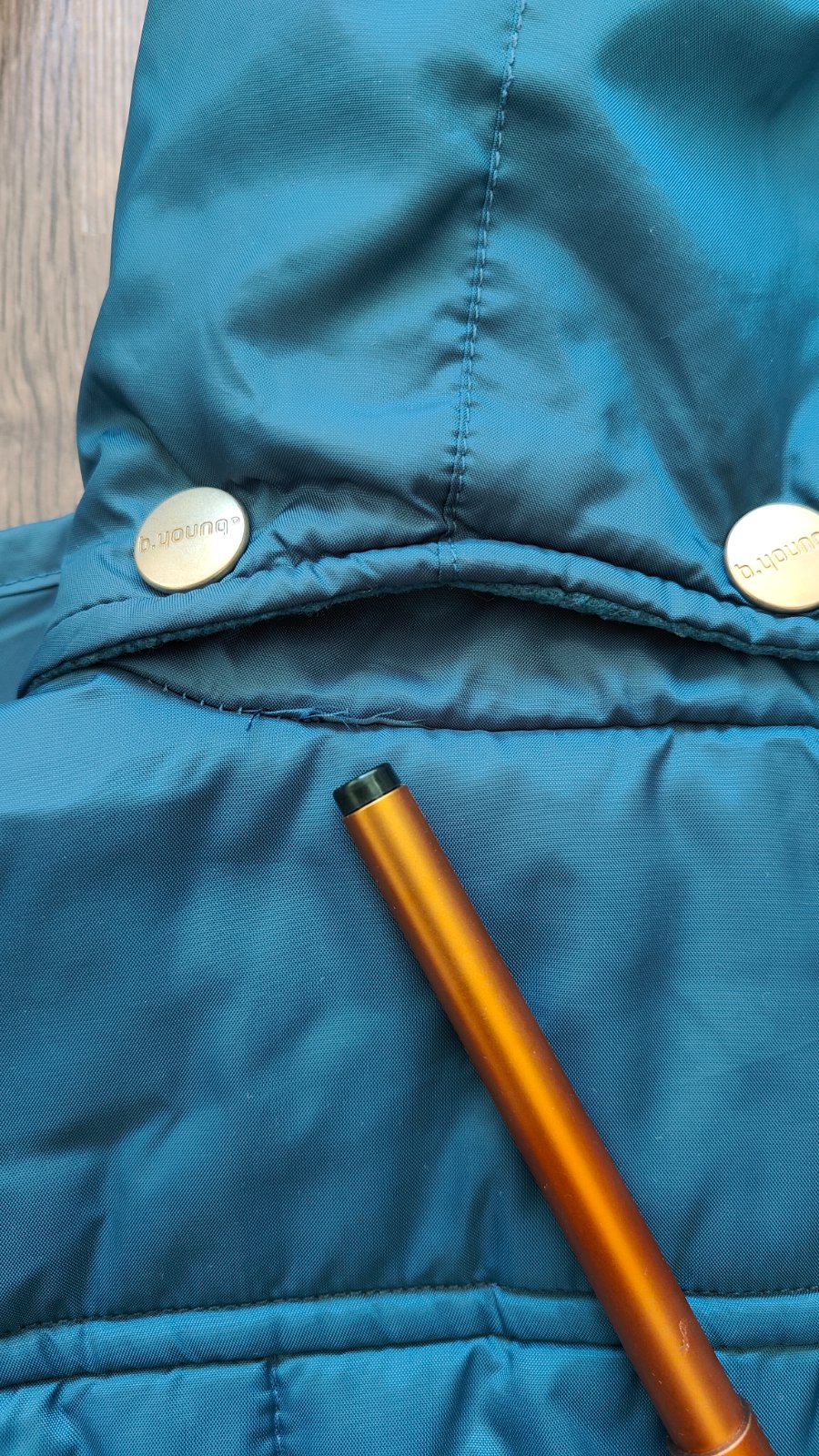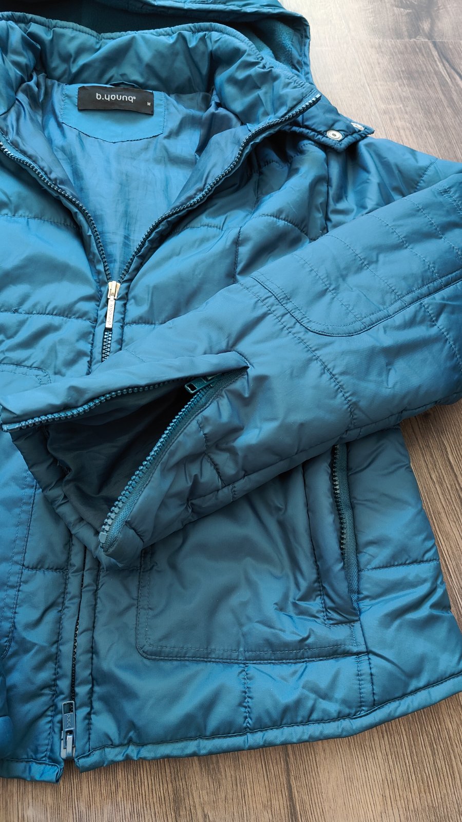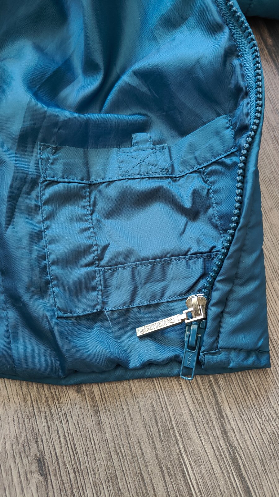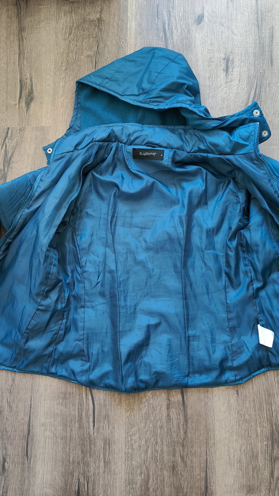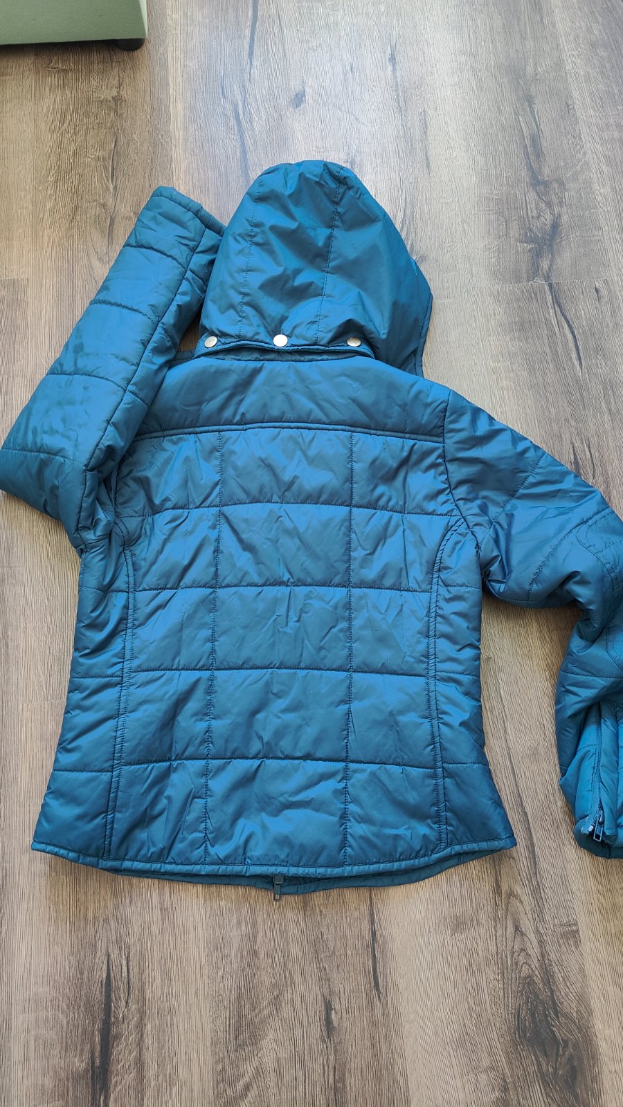 Bunda prijemnej farebnej kombinacie, neposkodena, bez skvrn, na zips, oblecena 2krat, so skrytou kapucnou, dvoma vreckami, da sa v dolnej casti stiahnut gumickou, posuvam dalej, je mi zial velka.