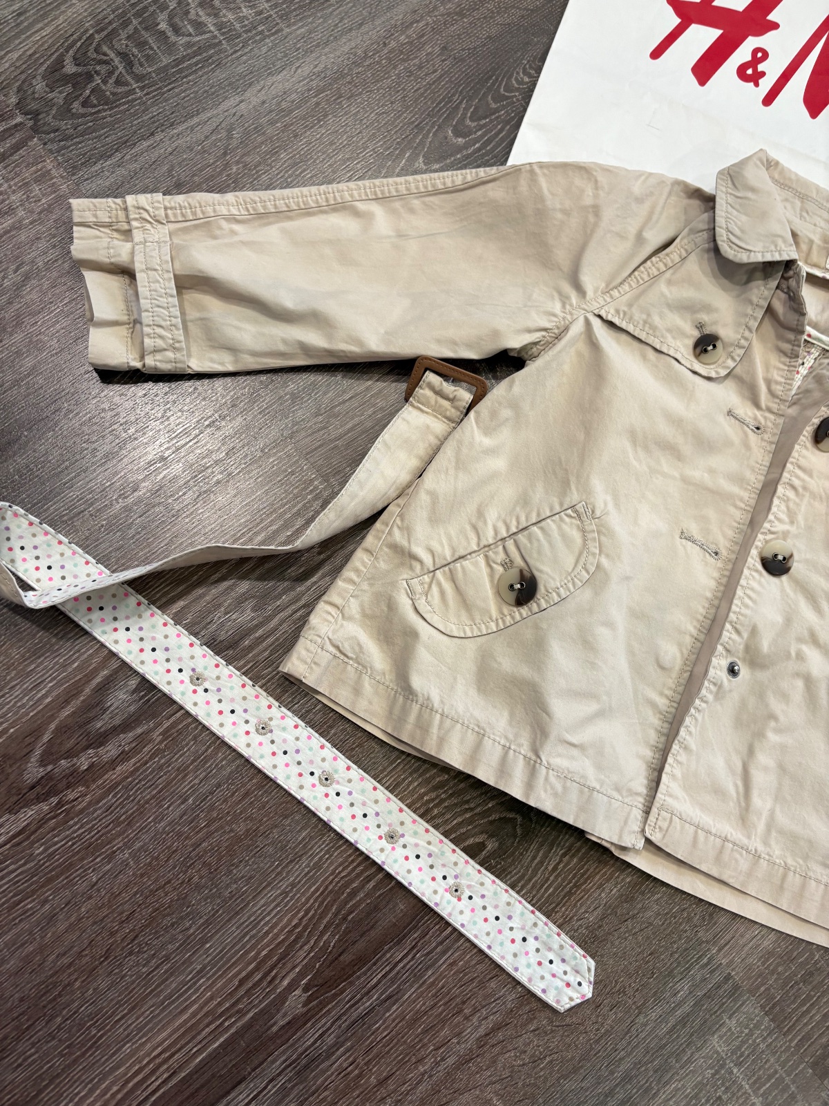 03.H&M krásny dievčensky bežový trenčkot s detailami na farebne bodky v super stave, len na jednom rukave akoby svetlulinko modý pasik, nič strašne a pri nosení nie je vidieť akoby to bolo narokom..možno aj pustí