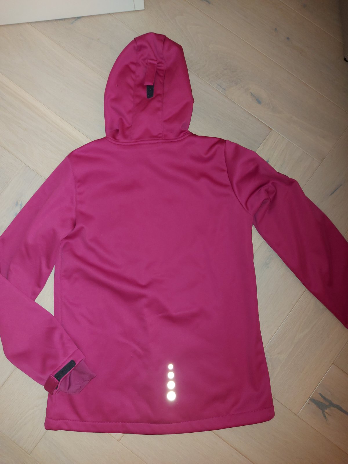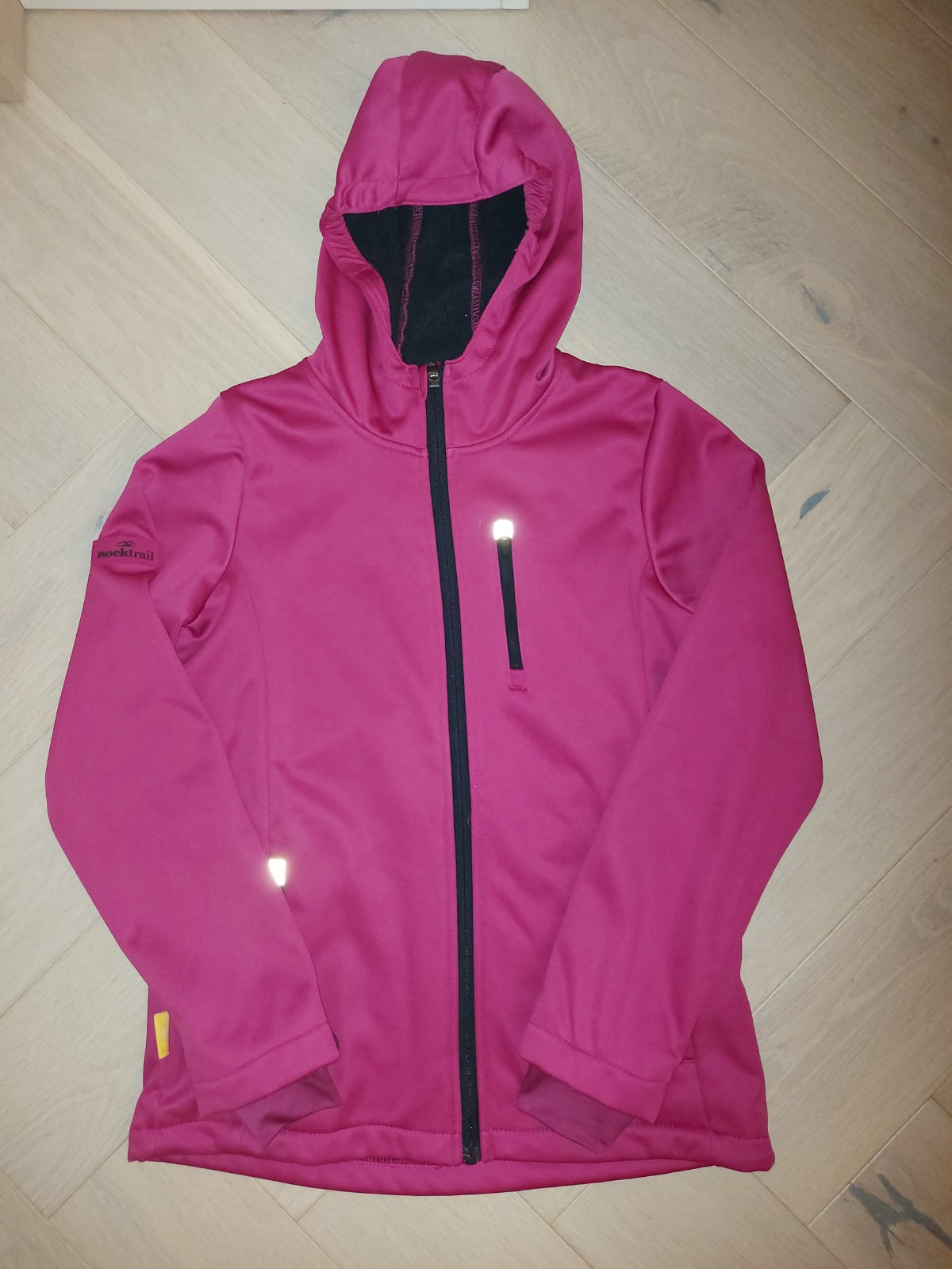 Ponukam na predaj softšelovú (softshell) bundu pre slecnu, veľkosť 146/152. Zateplená zvnútra flisom, reflexné orvky, kapucňa, predĺžené rukávy. Farba zodpovedá fotke spredu a zozadu, tam kde je odfotená rozopnutá je farba skreslená fotením bez blesku.
