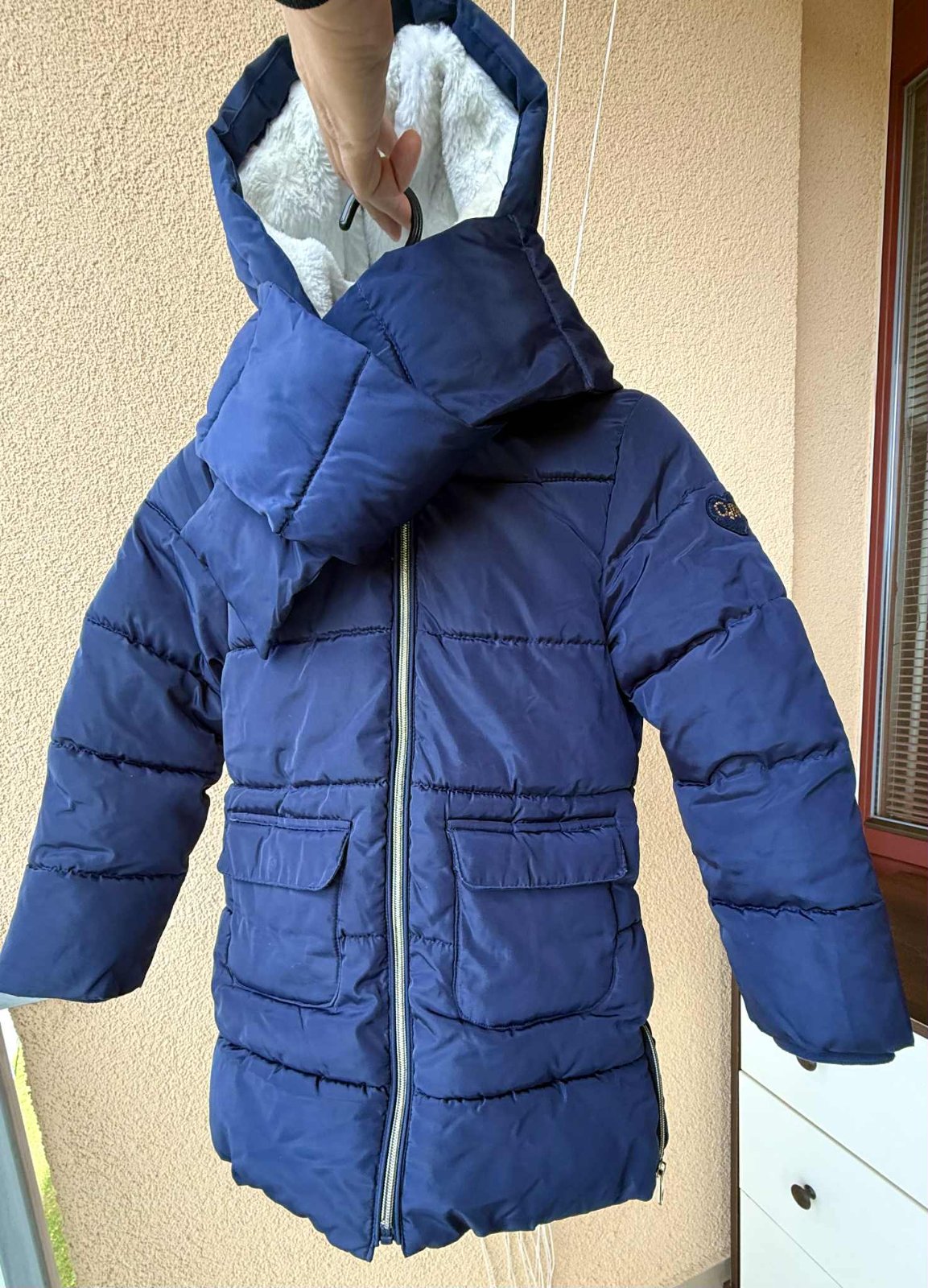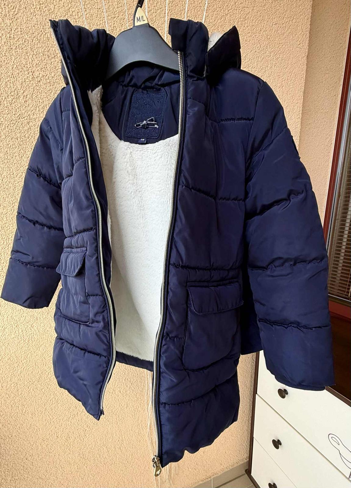 Predám zimnú bundu po dcérke nosená na striedačku... veľmi teplá- vnútro biela kožušinka, farba tmavomodrá, značka original Marines, PC 65€, veľkosť 7/8 rokov, vrecká, bez opasku s odnímateľným šálom. Rozmery: prsia: 38cm,celková dĺžka: 61cm, rukáv: 45cm.