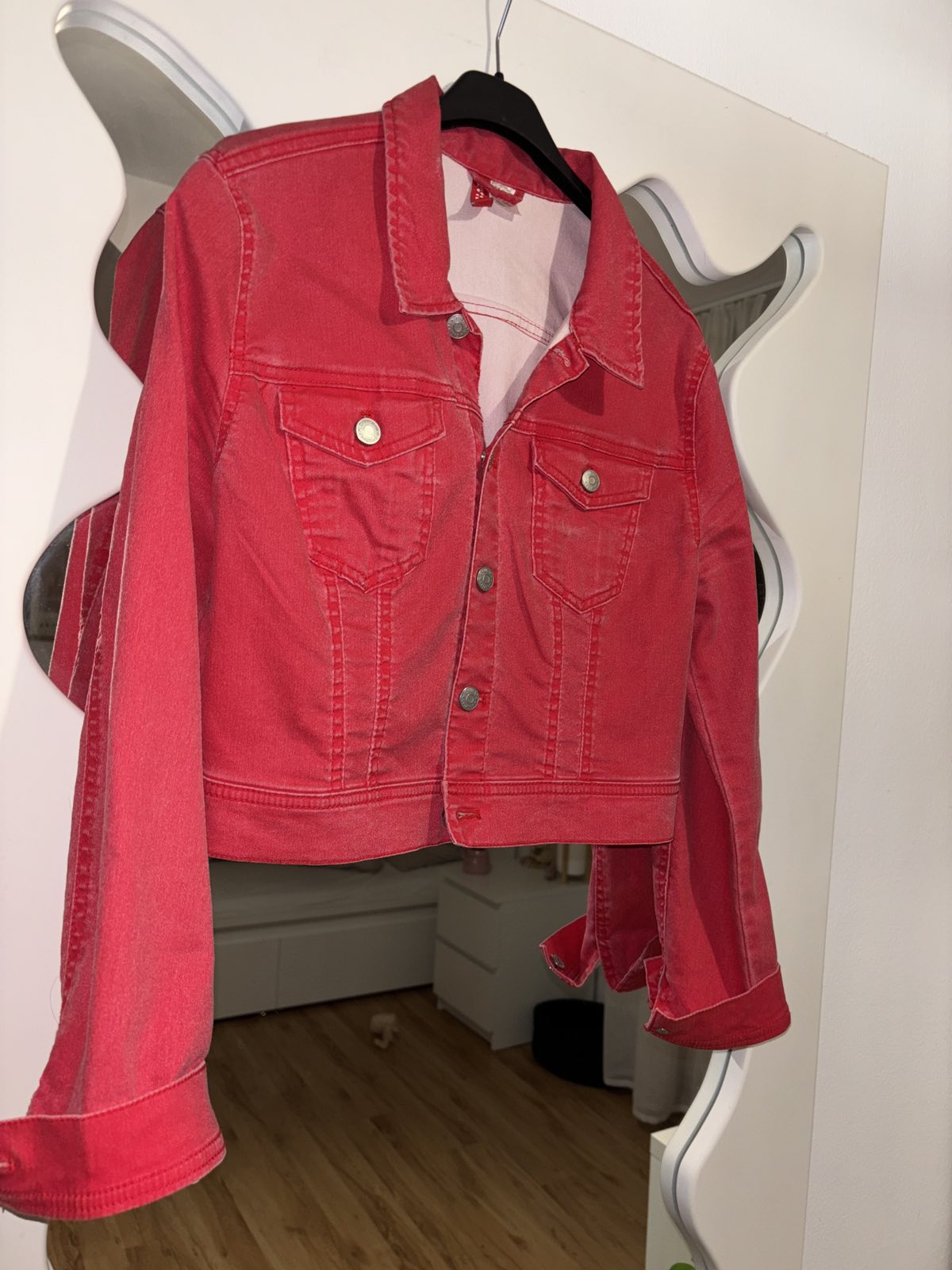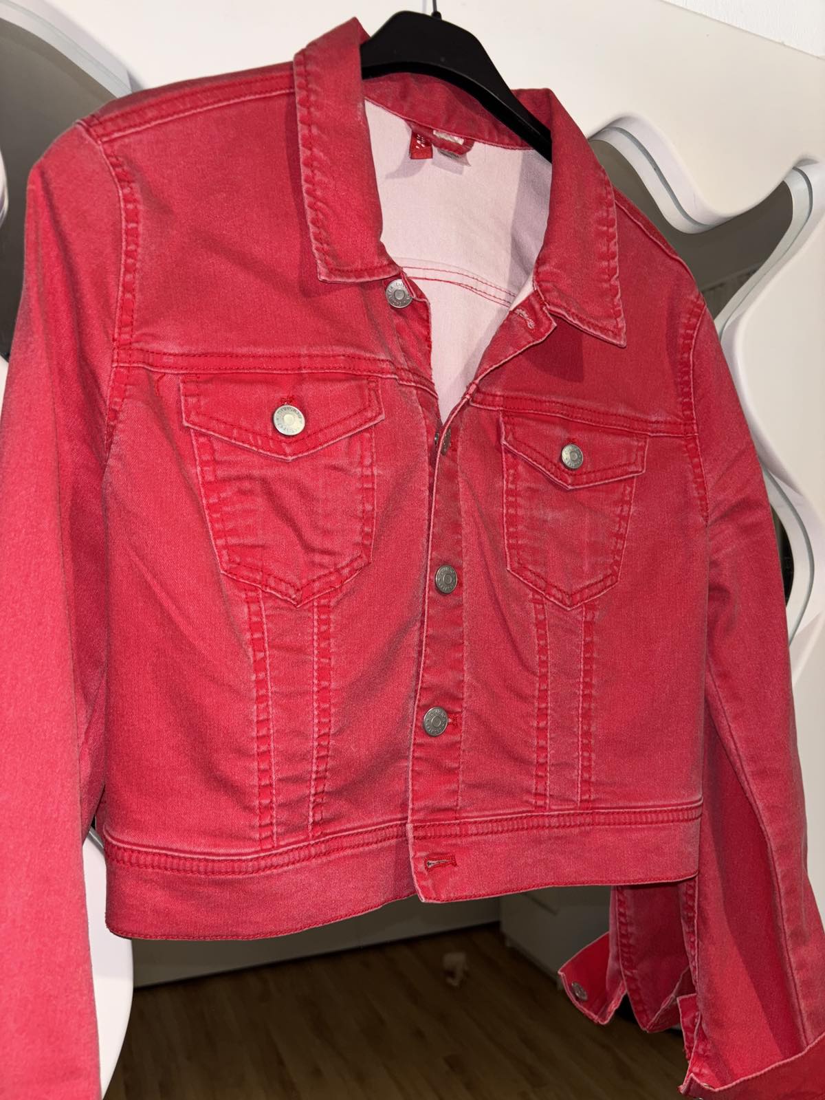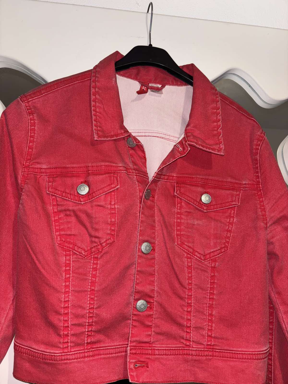 Bez známok nosenia, pružná tenká riflovina, jahodová červená,veľkosť 42,sedi na 38/40, alebo M,s.pod pazuchami 49cm,d.48 cm, rukáv od krku 73 cm
