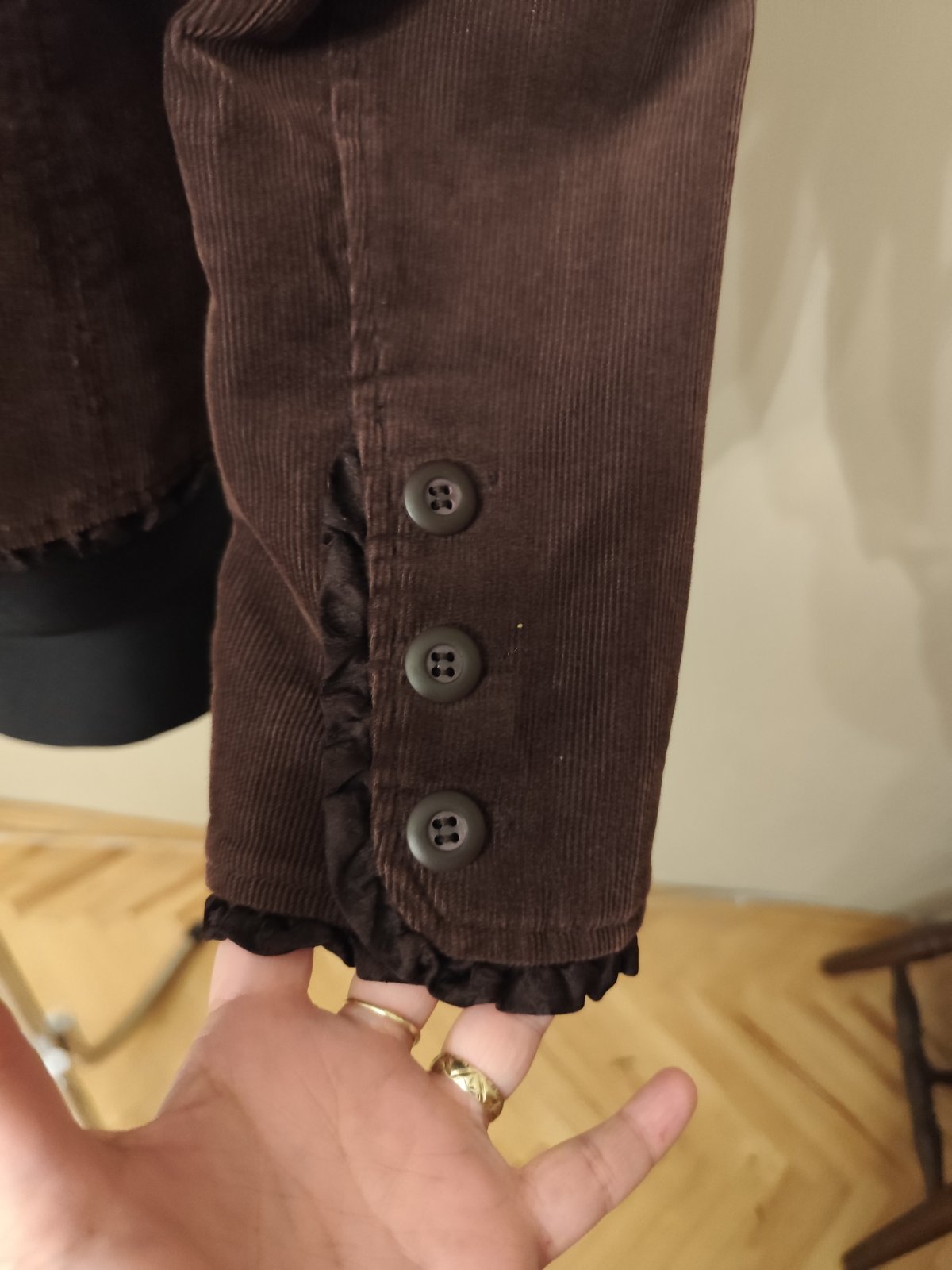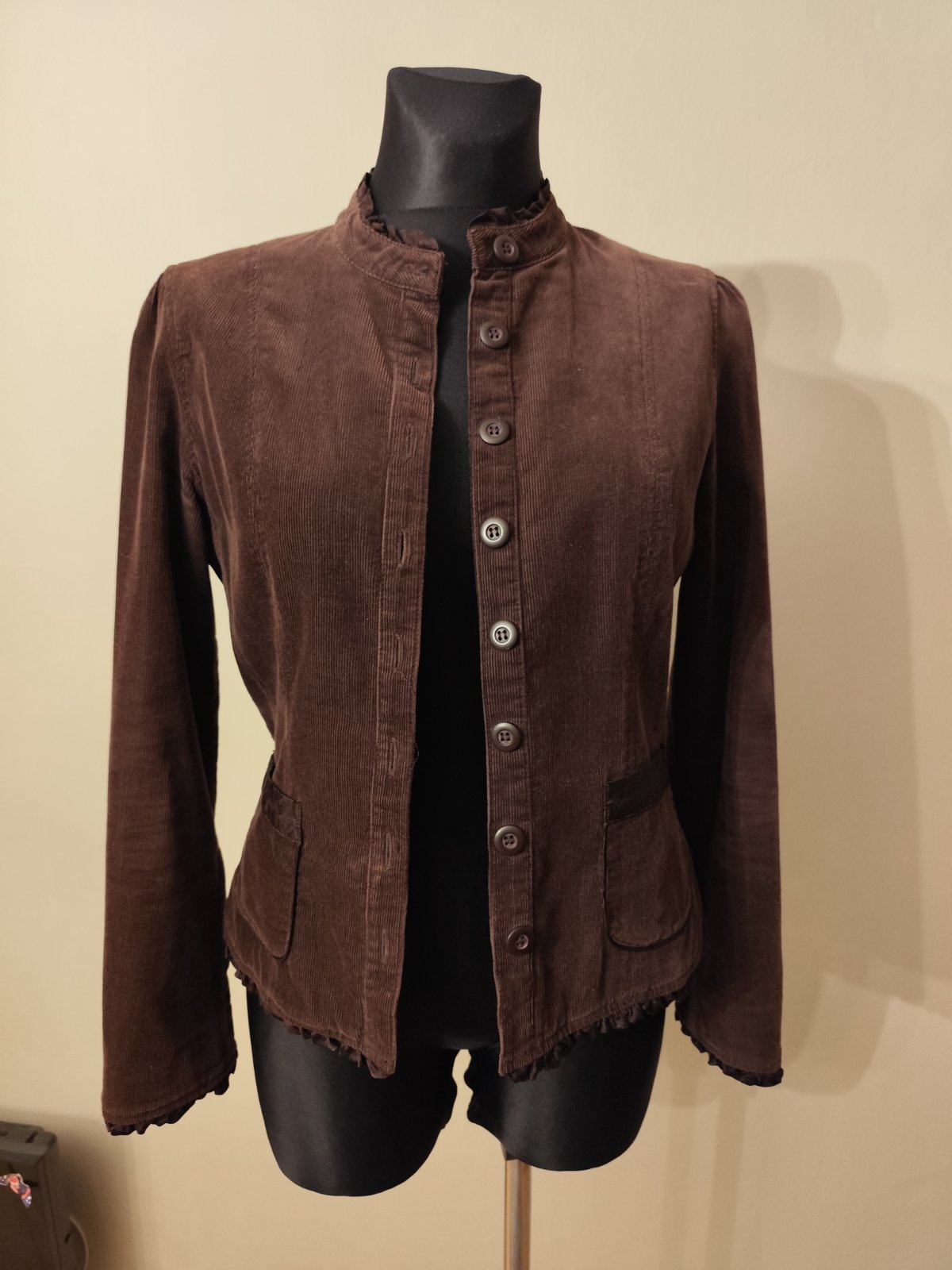 Predam krasne, kvalitne menčestrove sako. Je pekne prepracovane, na rukavkovh a dole je satenova fodrička, vnutri ma peknu podsivku. Ma aj vrecka. Velkost je na nom uvedena L, no sedi na M. Aj figurinka je vo velkosti M a sedi na nej pekne.