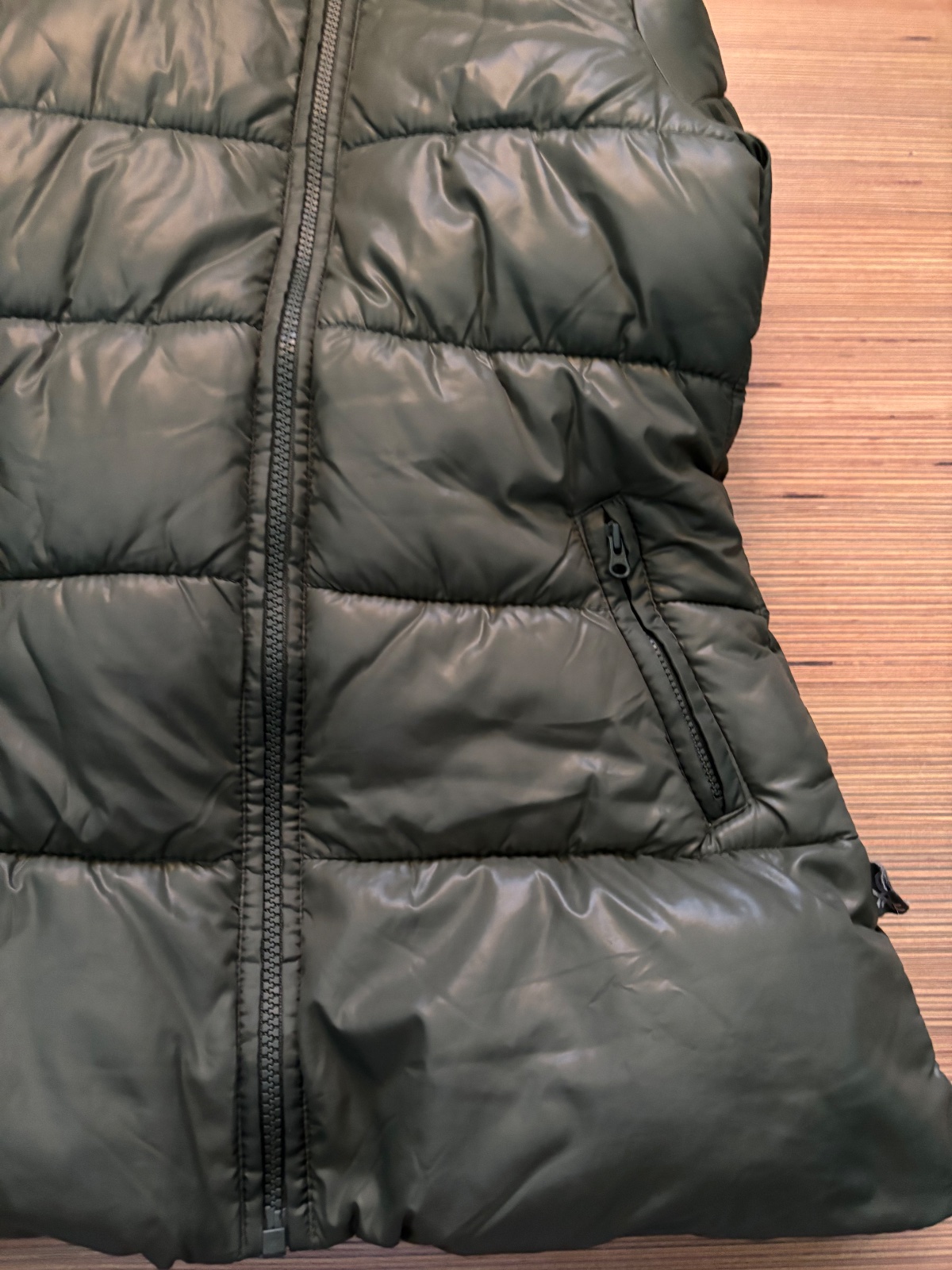 Páperový kabatik, tenší ale teplučky. Nosený bez poškodení (chýba v predu jeden gombík - ale je len okrasný z predu). Bunda má zapínanie na zips aj cvočky. Kožušinka na kapucke odnímateľná.