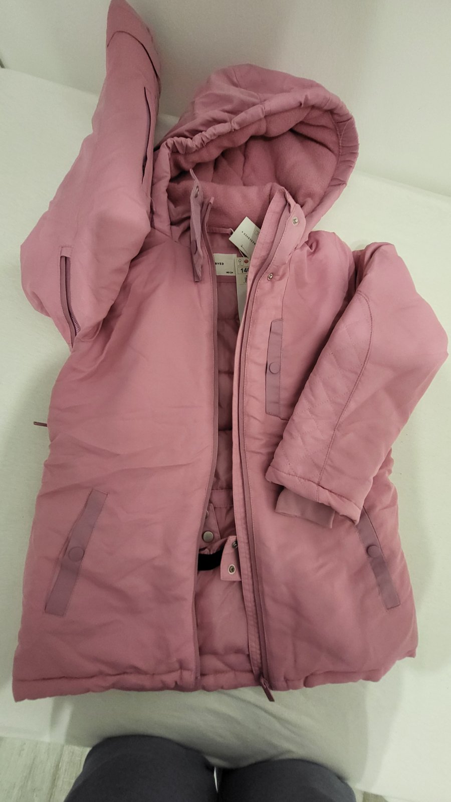 Nová bunda ešte s visačkou, ktorú sme nestihli výnosit. Vrecko je oi.aj na prsiach, pod pazou je zips, rukávy na patent, zapina sa okolo brucha a krku na cvoky.