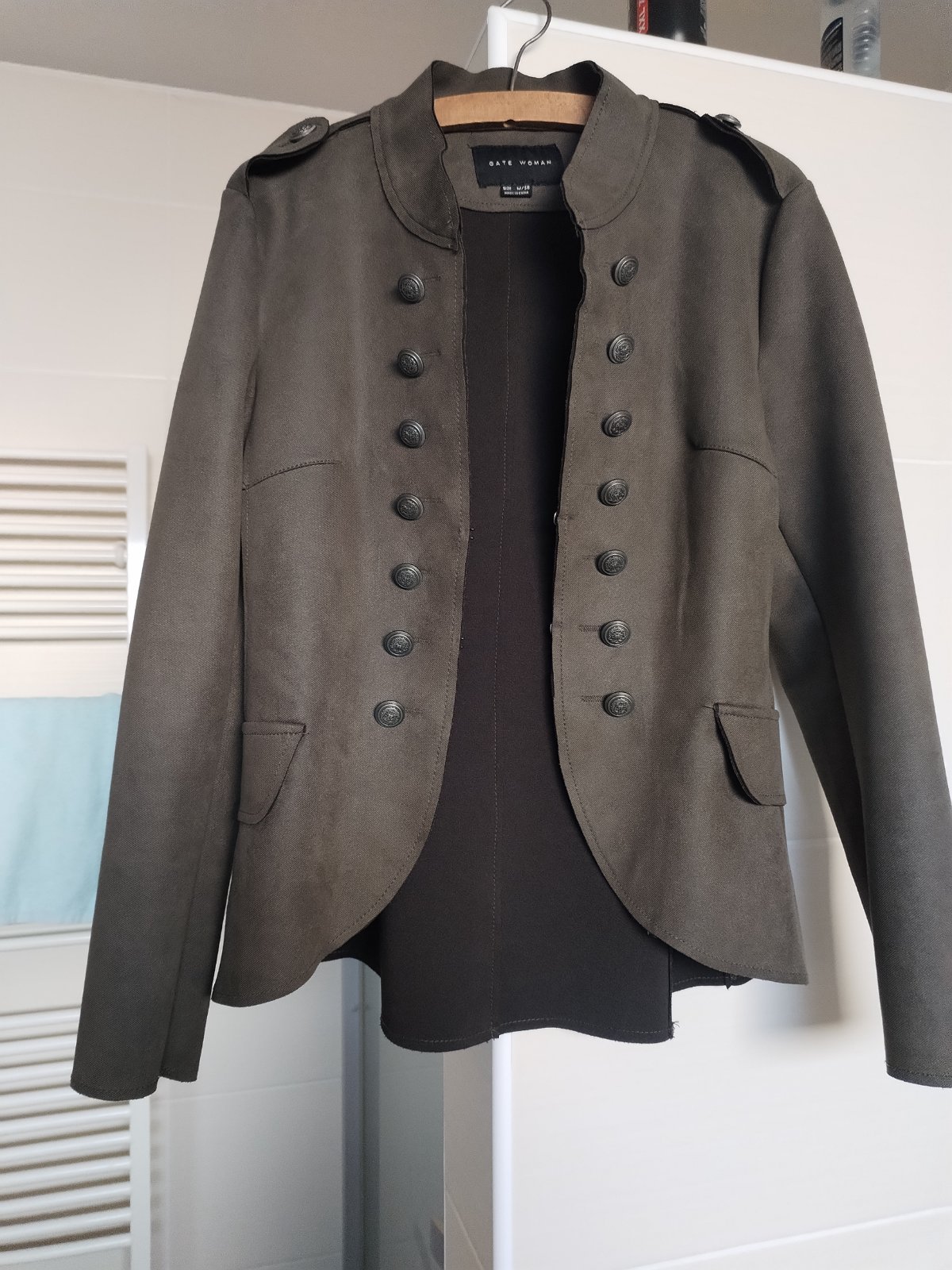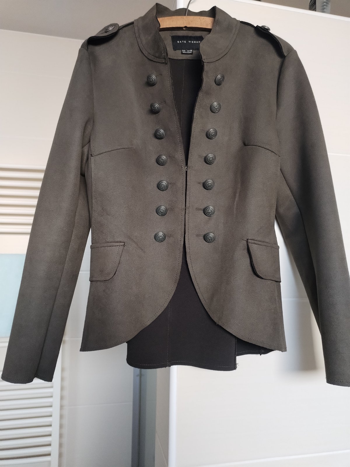 prechodný kabát 38,dĺžka od šije 64cm,dĺžka rukávu 61 cm, polyester, elastan, živica, flasone vačky, materiál sa nedá prať iba čistiť za sucha