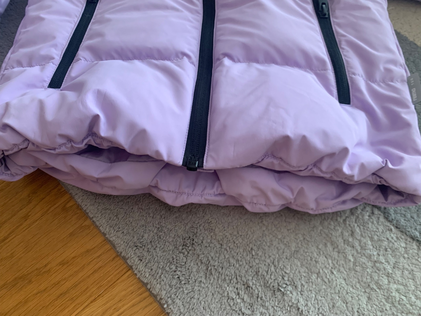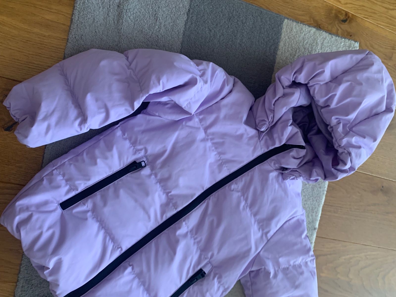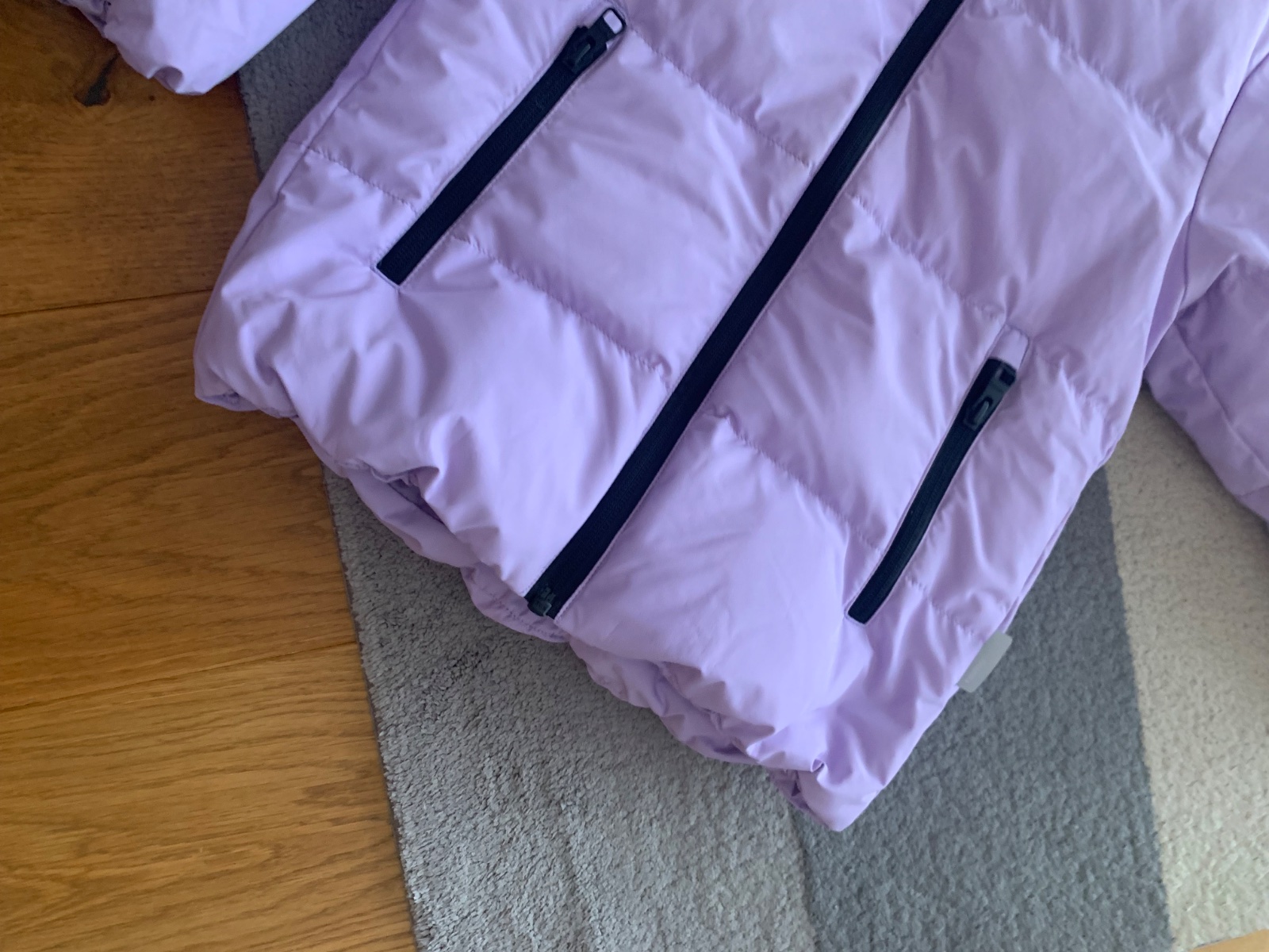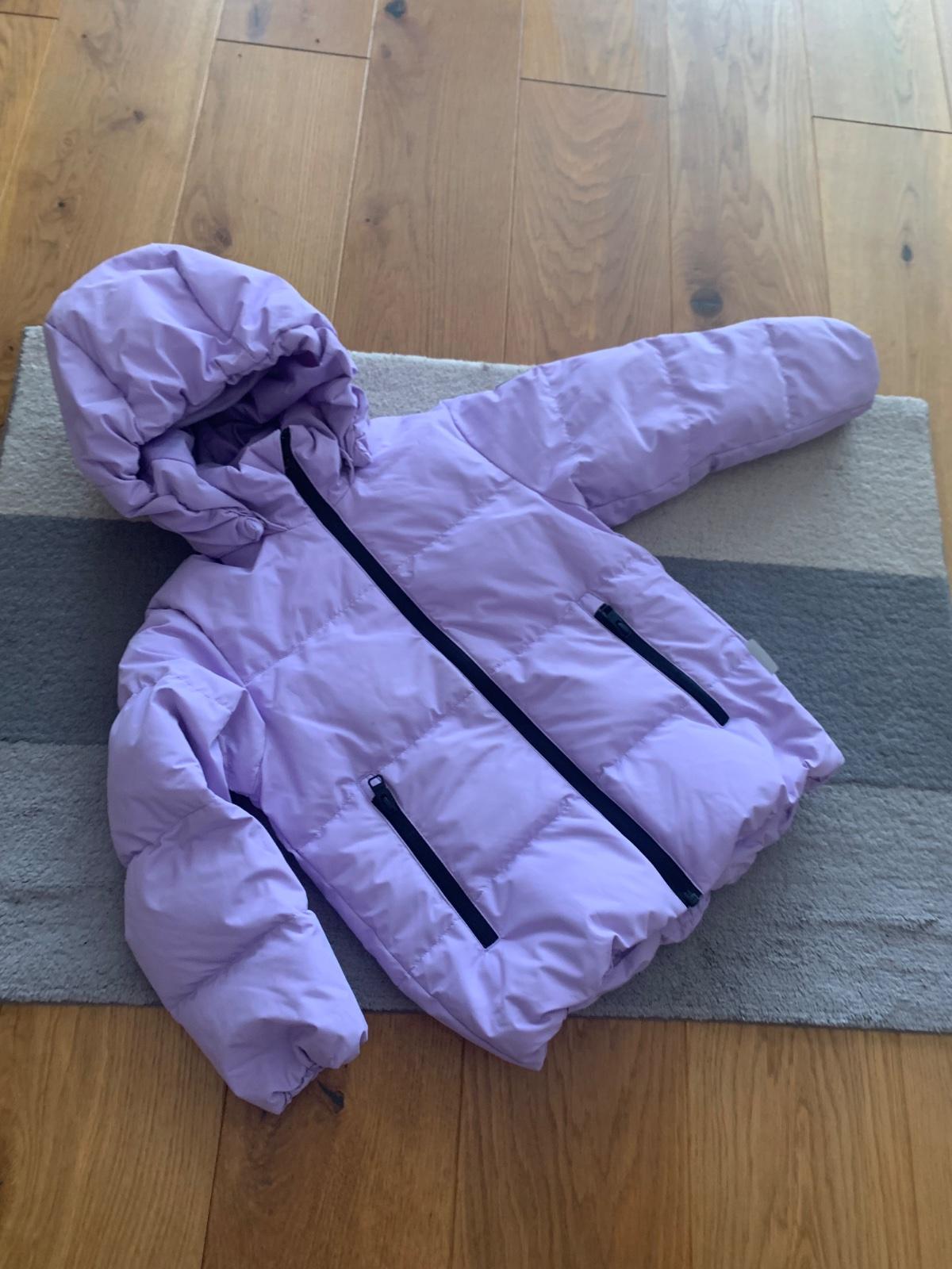 levanduľová veľmi teplá bunda v stále super stave, drobné známky nosenia podrobne zdokumentované, sedí na 116 a 122, kačacia výplň, 1 x čistená v čistoarni, PC 130€