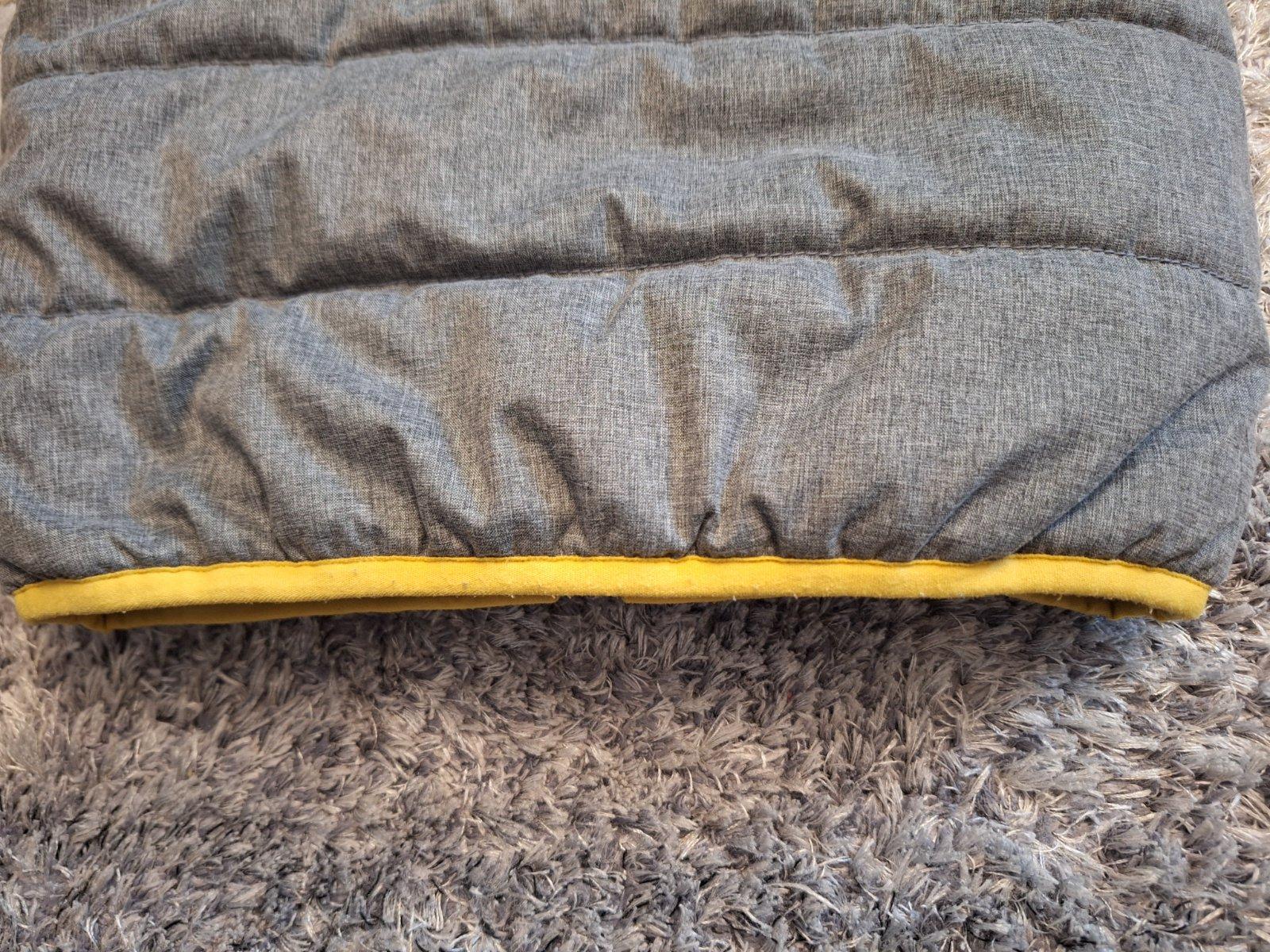 Teplá vesta vo veľmi dobrom nosenom stave (zopár žmolkov na žltom leme a zblízka vidno trochu šuchnuté 'cvoky' na vreckách).