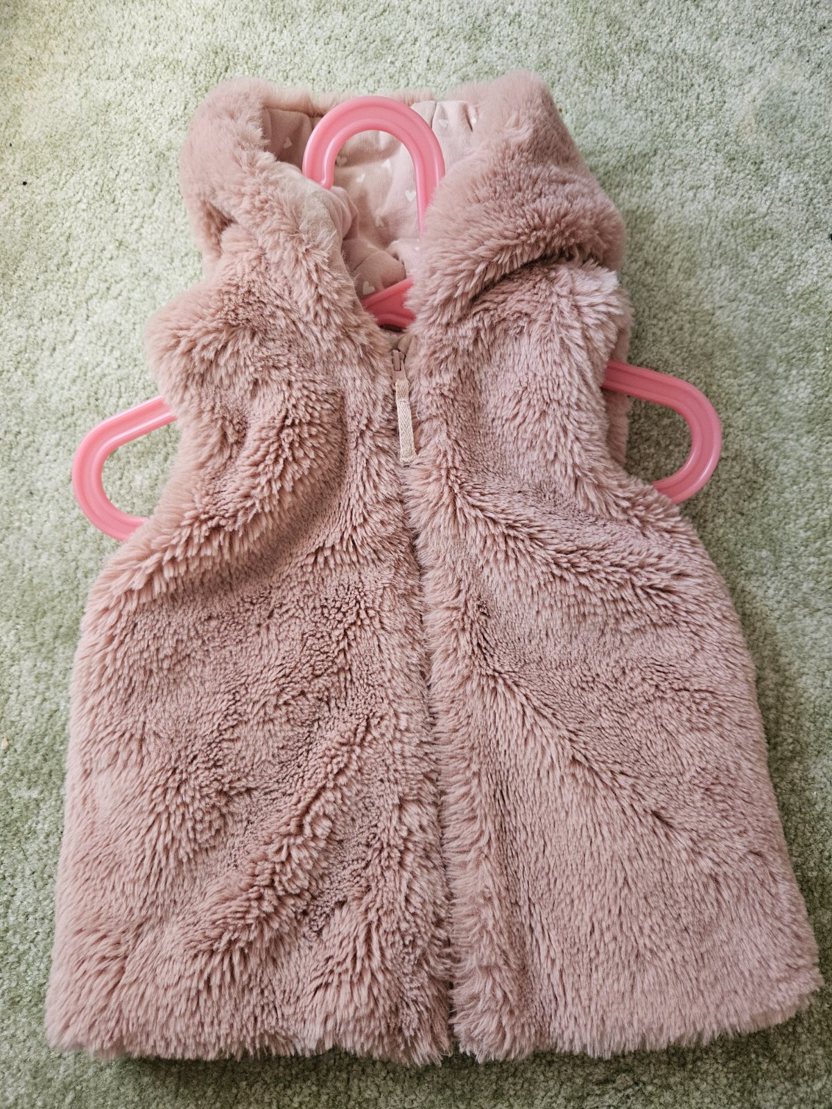 Dievčenská zateplená vesta na vek 18 - 24 mesiacov. Ozdobné vrecká na predných dieloch. Bez fľakov a dier, zips funkčný. Nedostatky: na prednom dieli pri prieramku odpáraný kúsok na ozdobnom štepov...