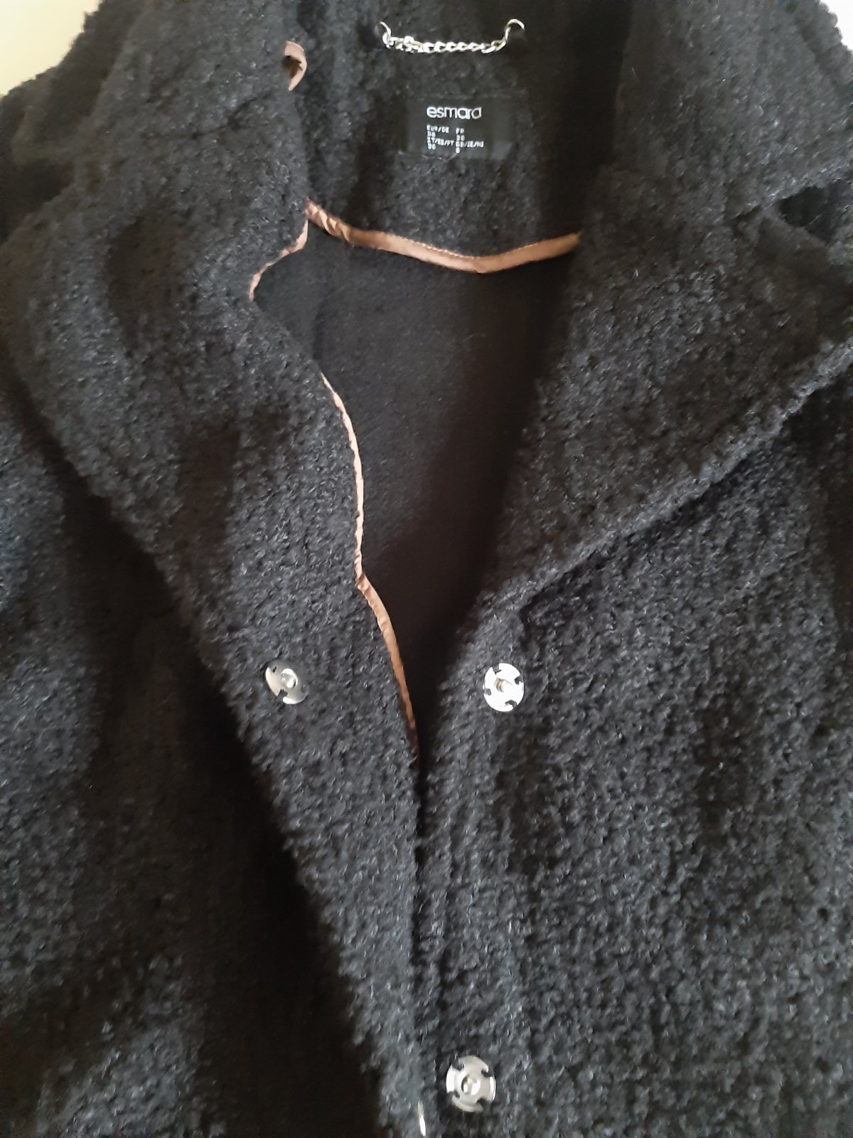 Cierny damsky/dievcensky kabat vel.S, ma bocne vrecka, zapinanie na patentky, nepodsity, znacka Esmara. Vyborny stav, rovny strih.