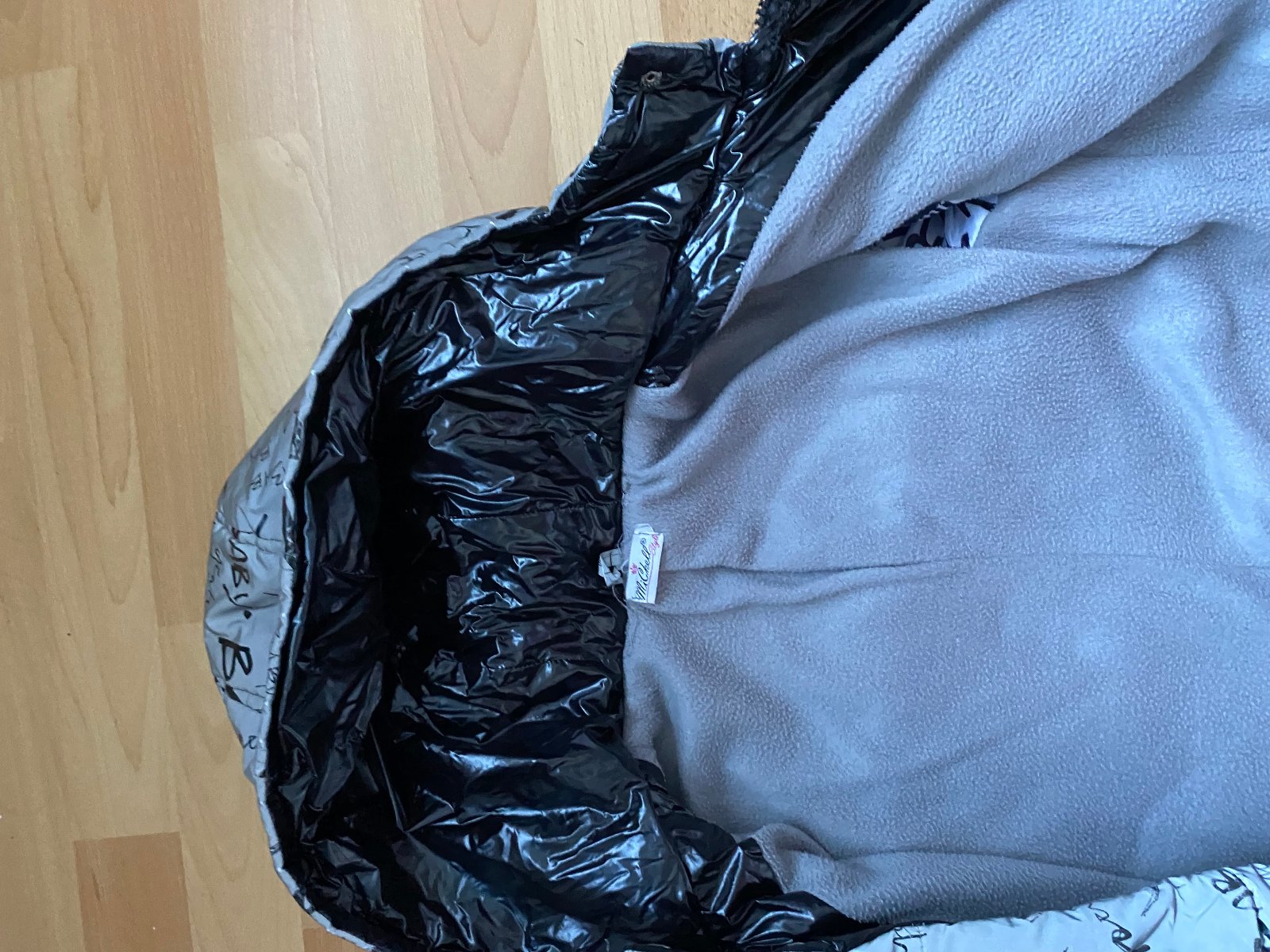 Krásna bundicka vo veľmi peknom stave. Farba je strieborná/svetlosivá lesklá. Rukáv ma vnútorný patent. Veľkosť sedí na 134-140.