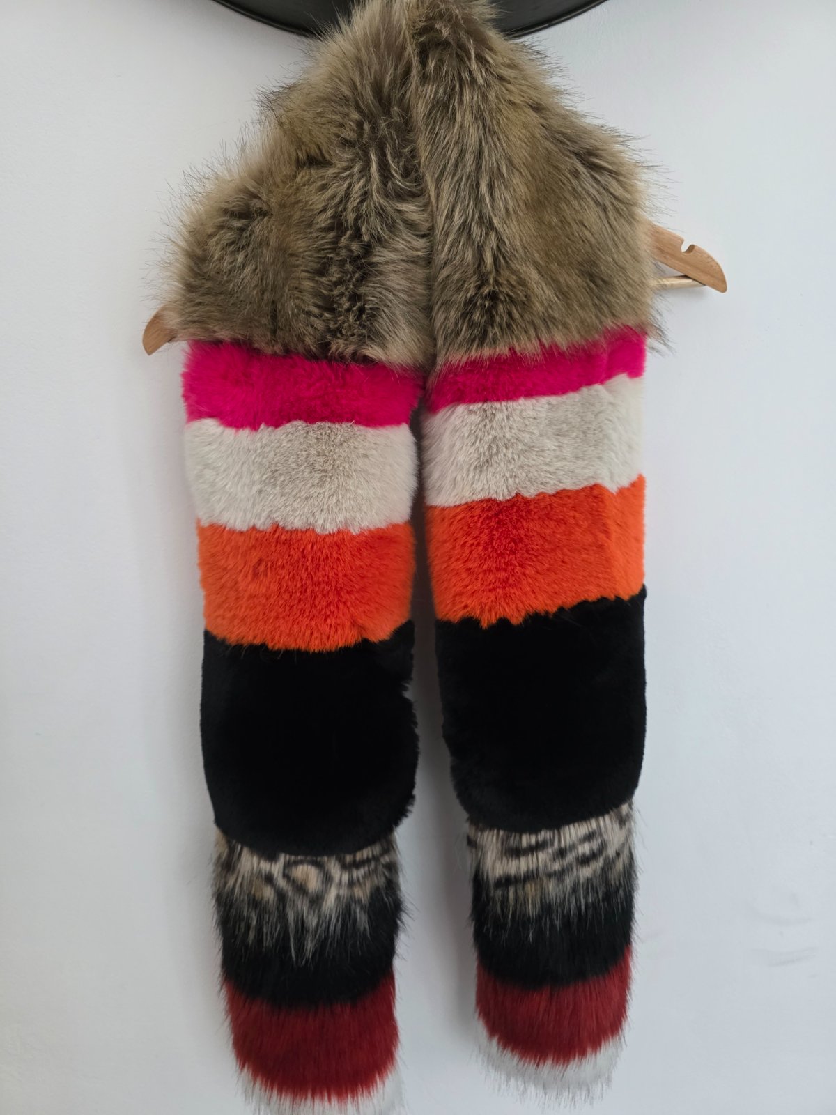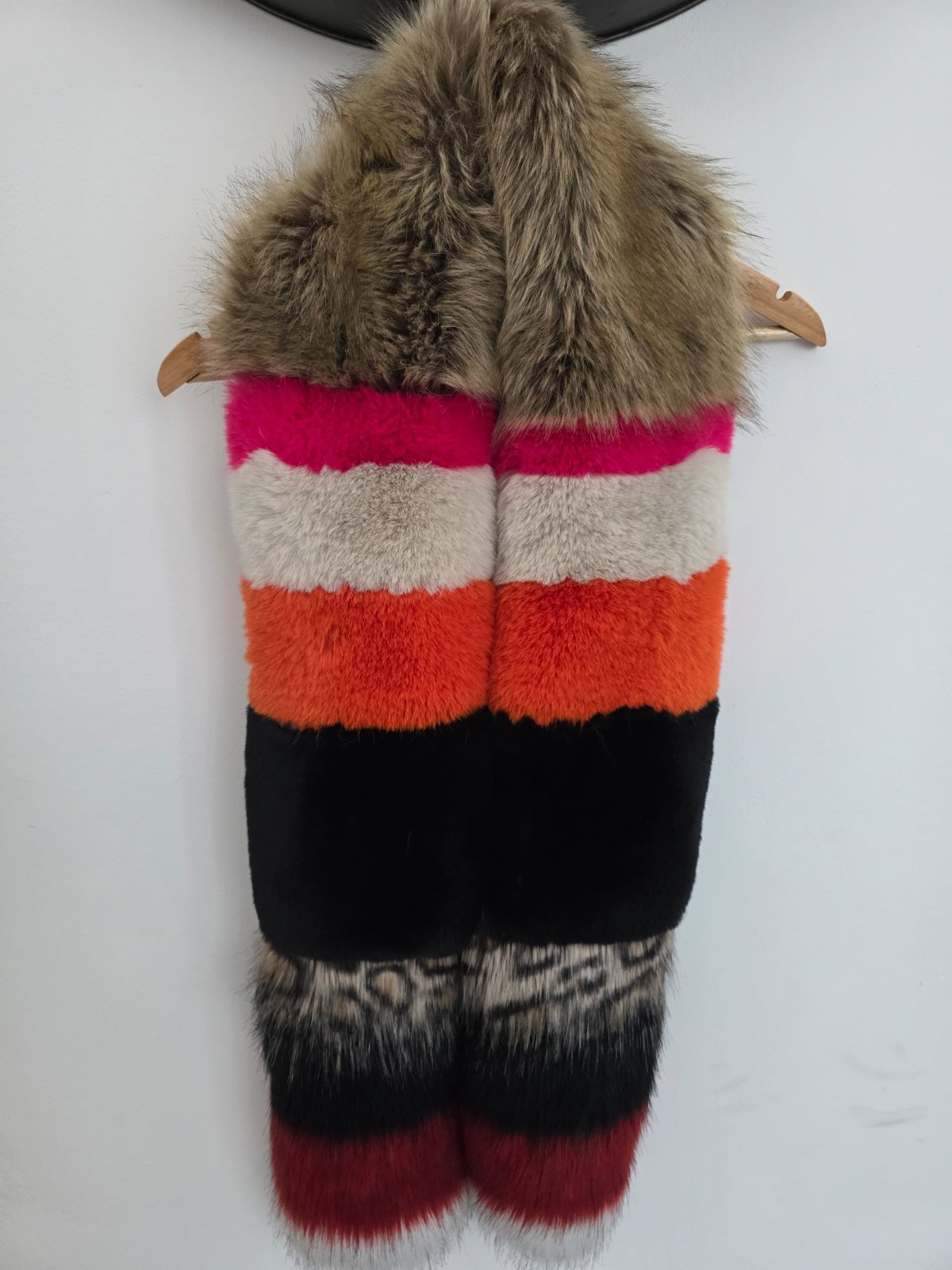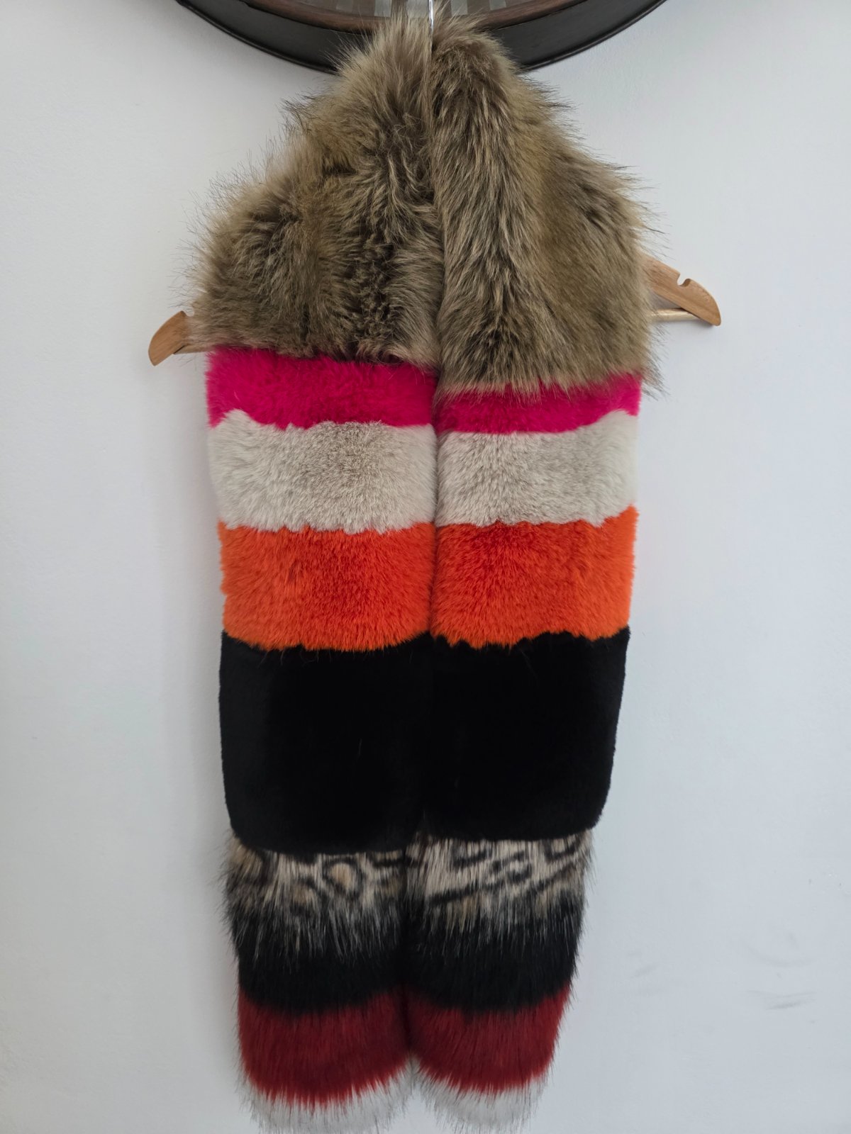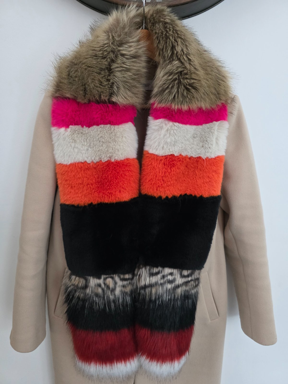 Vhodný na kabát alebo bundu. Krásne živé farby. Kožušina je umelá ale vyzerá reálne. Pôvodná cena 35€