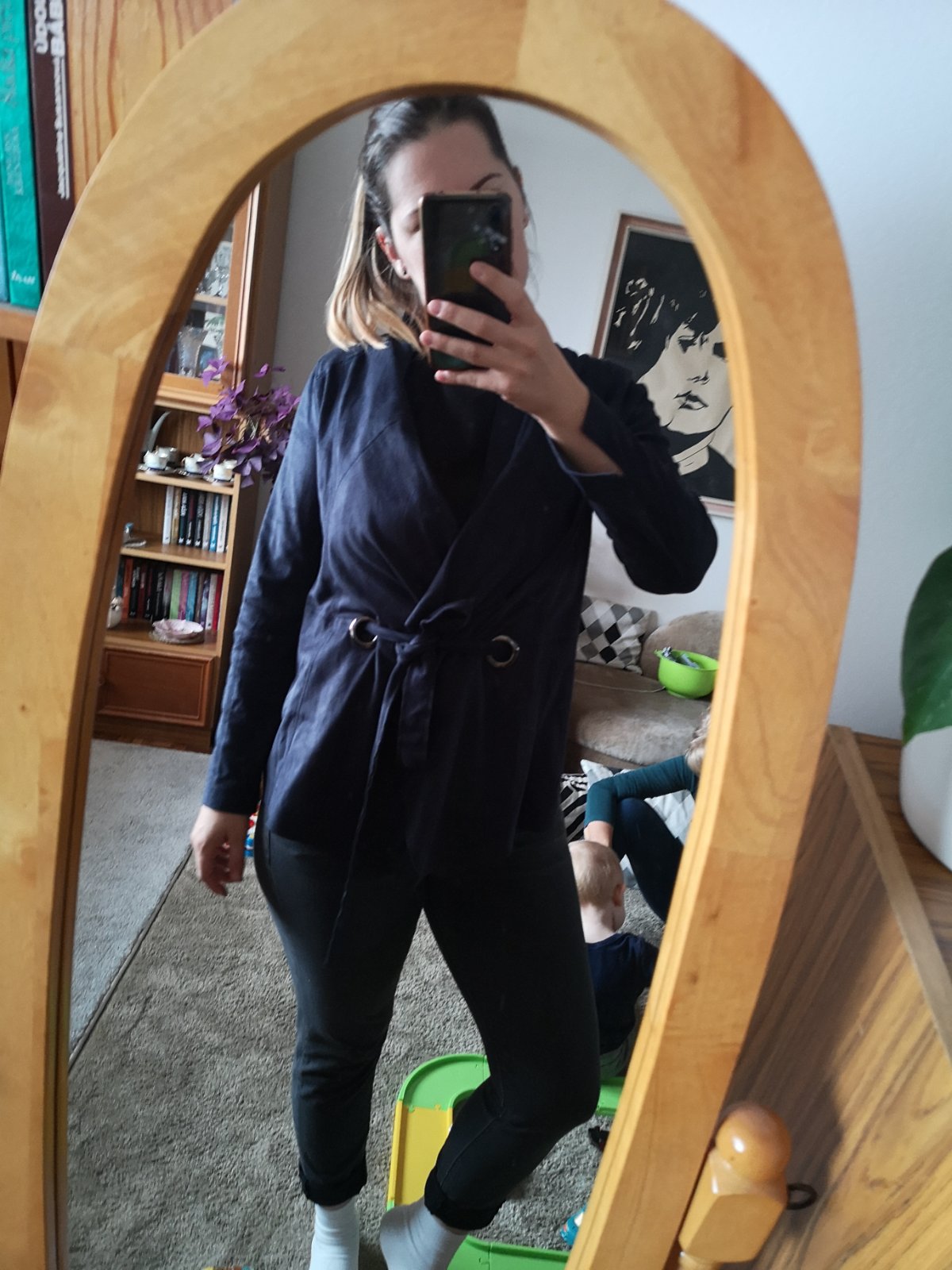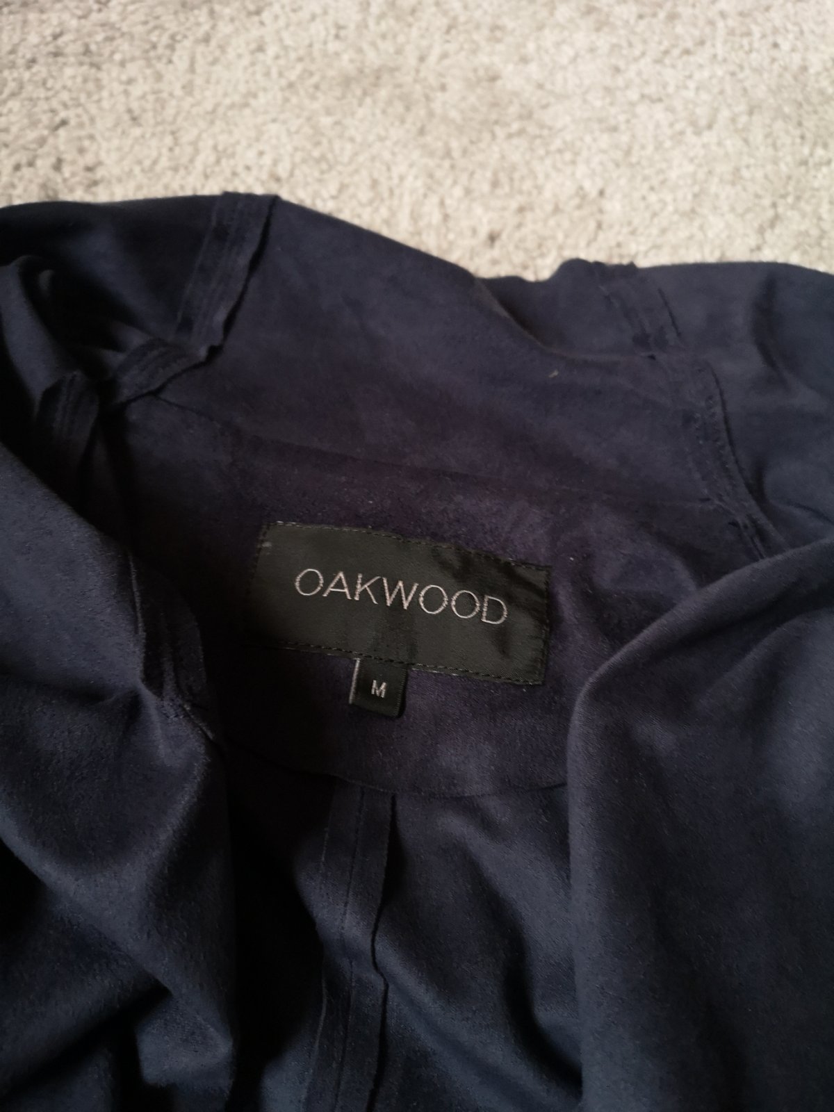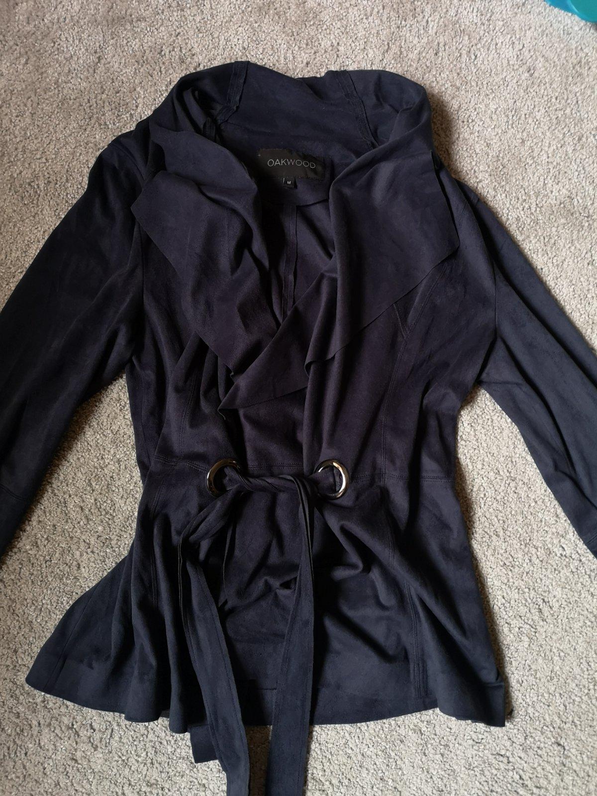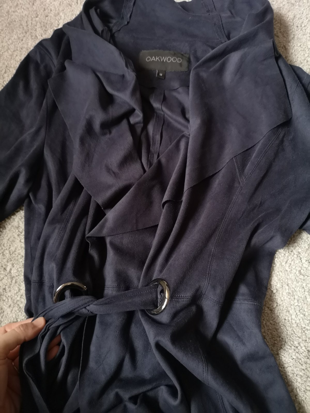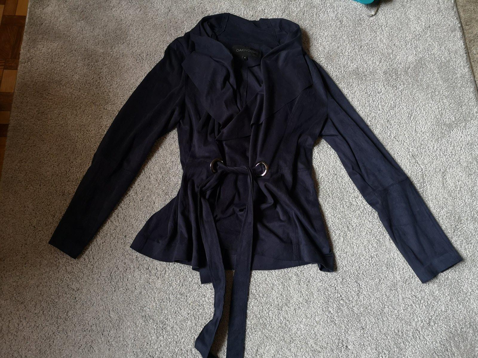 Ľahký prechodný kabátik značky Oakwood. Zaväzuje sa v pase na boku. Je na dotyk jemný a príjemný. Vyzerá ako brusena koža. Material: bavlna, polyester. Nemá žiadne poškodenie. V prípade záujmu premeriam