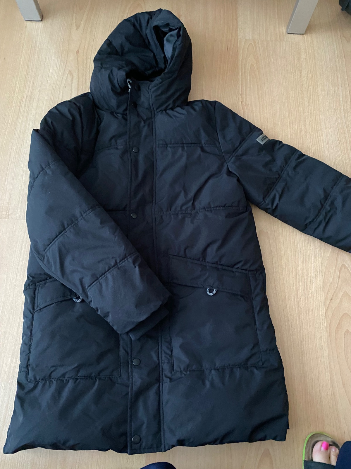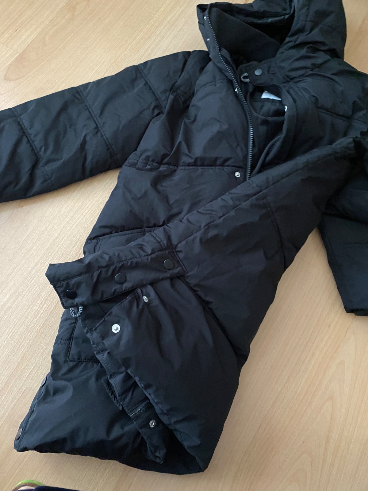 Super tepla bunda. Dobry noseny stav. Nenasla som chybu. Dvojite zapinanie (zips a nity), dvojite patenty na krku aj rukavoch... Kapucnu nemam... Dlzka 65cm, obcod 2×55cm, rukav od krku 70cm...