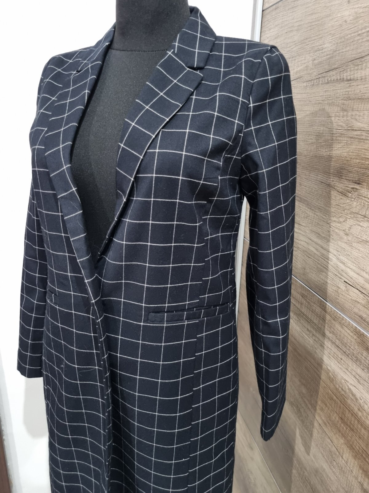 Kabát má klasický fazónkový golier a zapínanie na jeden gombík.