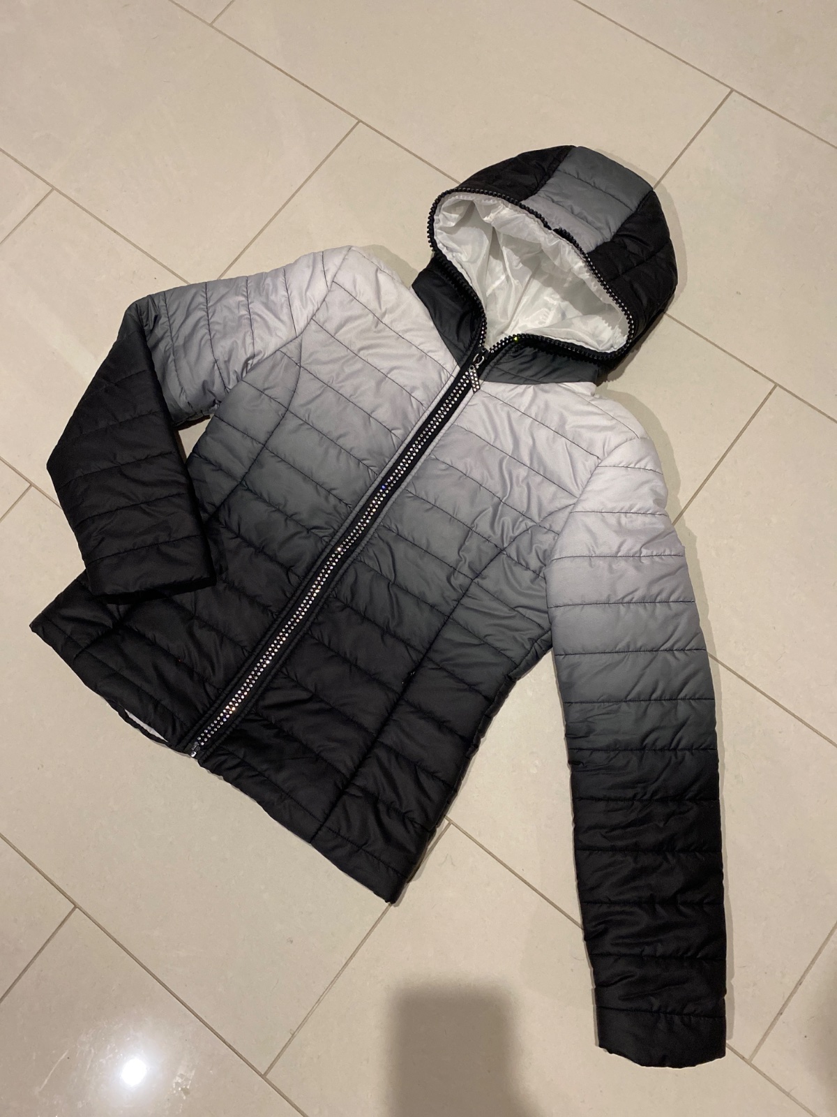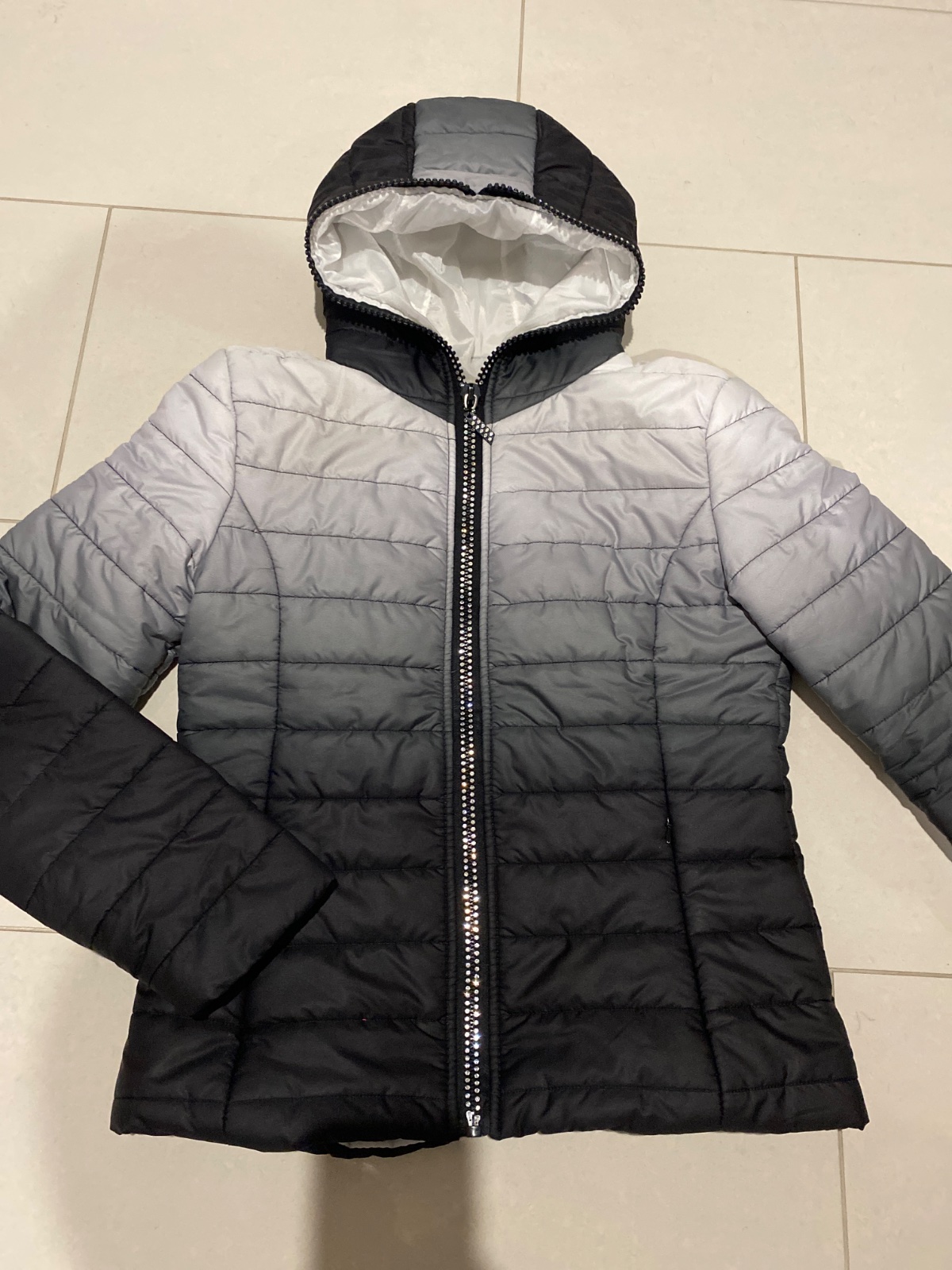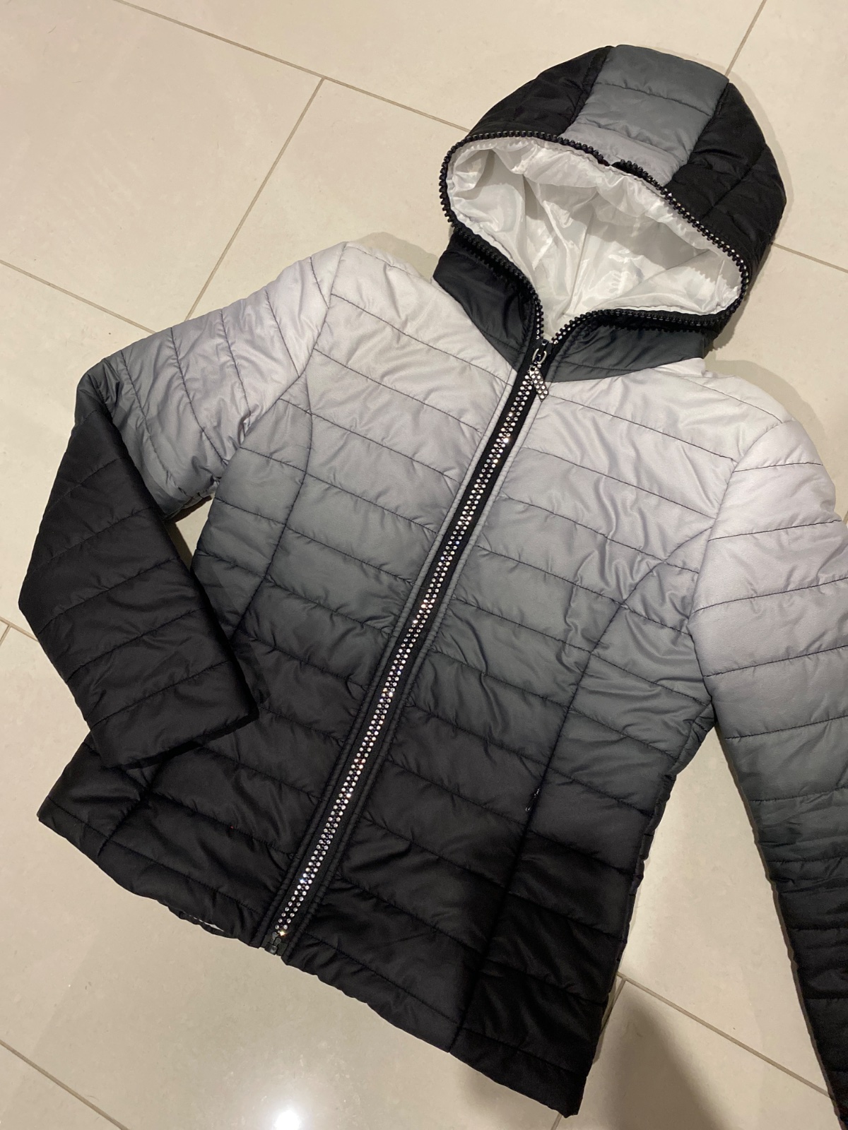 Predám prešívanú bundu.Veľkosť164/170.Na14-15 rokov.Šírka 50cm,dĺžka59cm,dĺžka rukáva 65cm.Kapucňa sa dá odopínať.Ako nová.