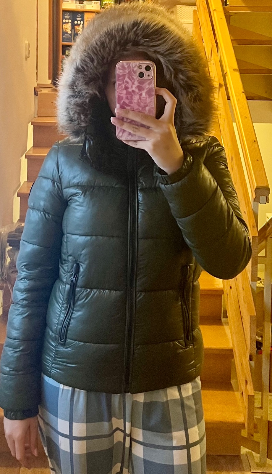 Krásna olivová zimná teplá bunda, veľmi málo nosená a bez poškodenia.