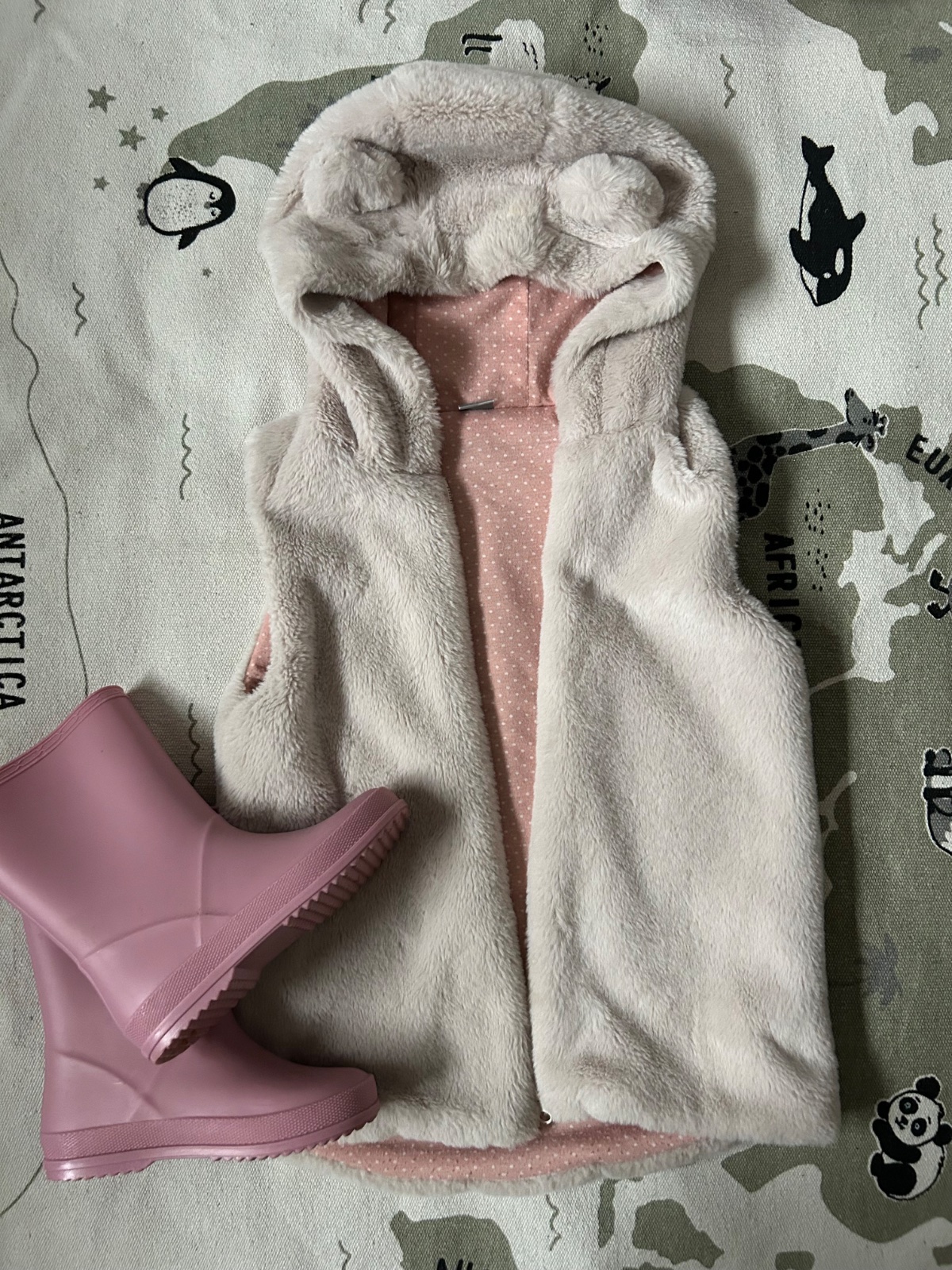 Posúvam teplú vestičku, veľkosť je uvedená 128, ale dieťatko ju obliekalo ako veľ. 116 (bola akurát pod zadok). Žiadne poškodenia.