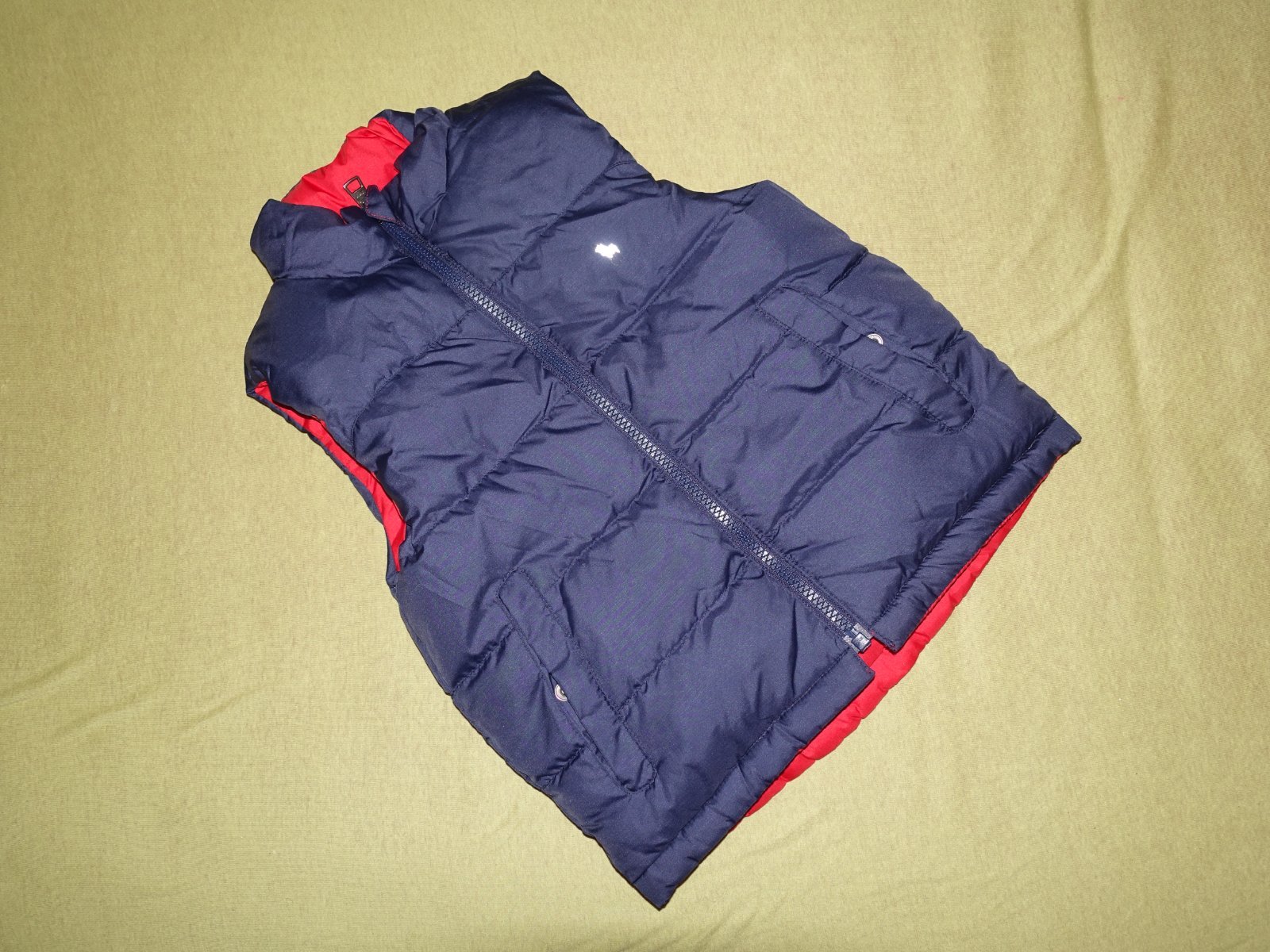 Krasna paperova obojstranna vesticka- vo vybornom stave, bola len oprata, este mam visacku, ktora sa oprala spolu s vestou, tak je zalepena. Znak sa na tej modrej strane poskodil- velmi mierne aj na tej cervenej).