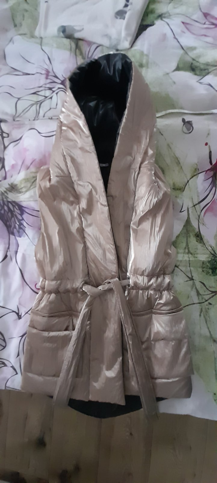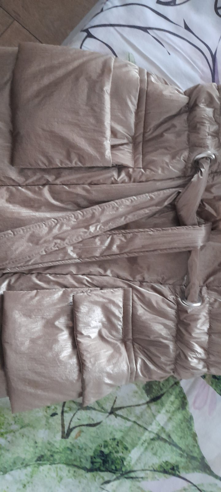 Veľmi pekná dámska vesta, veľkosť 36, s kapucňou, s vreckami a viazaním v páse.