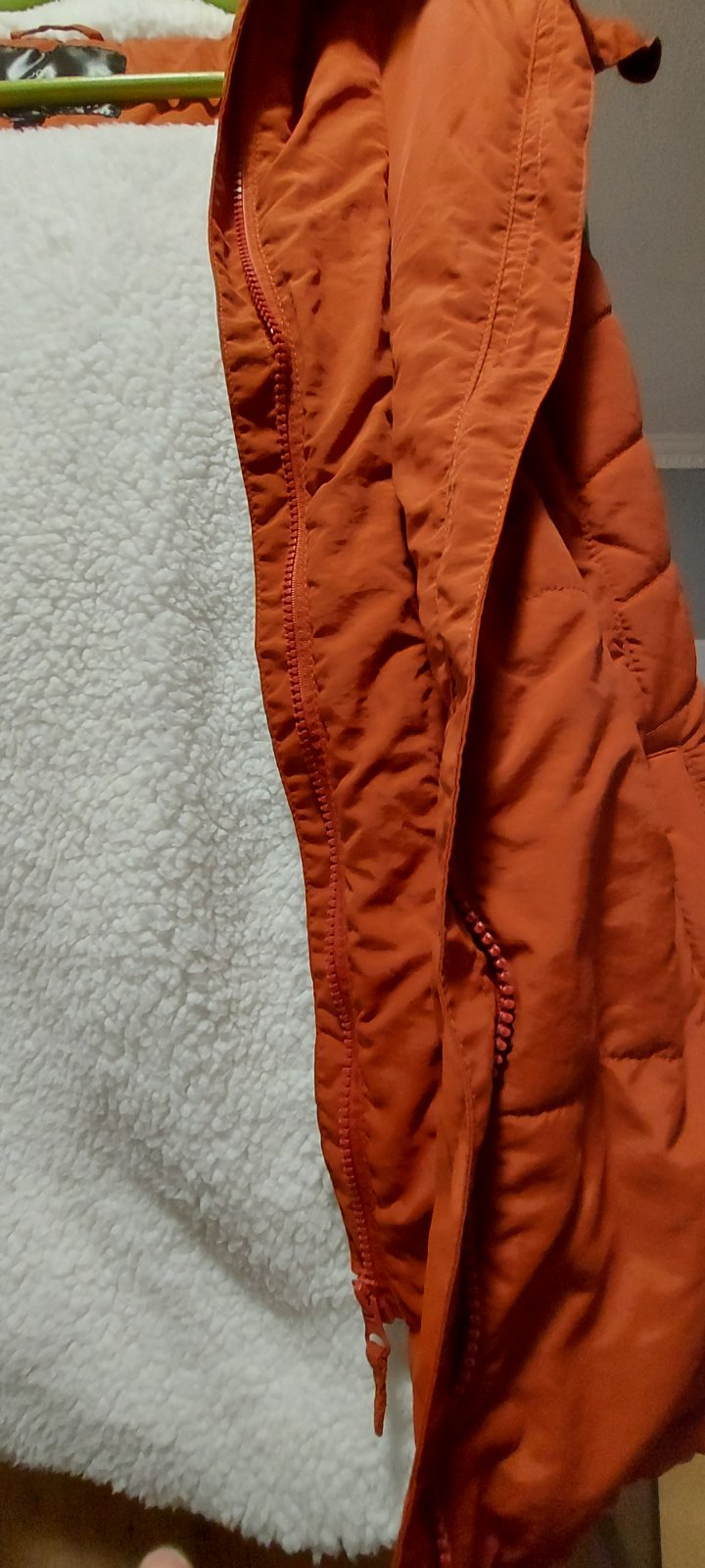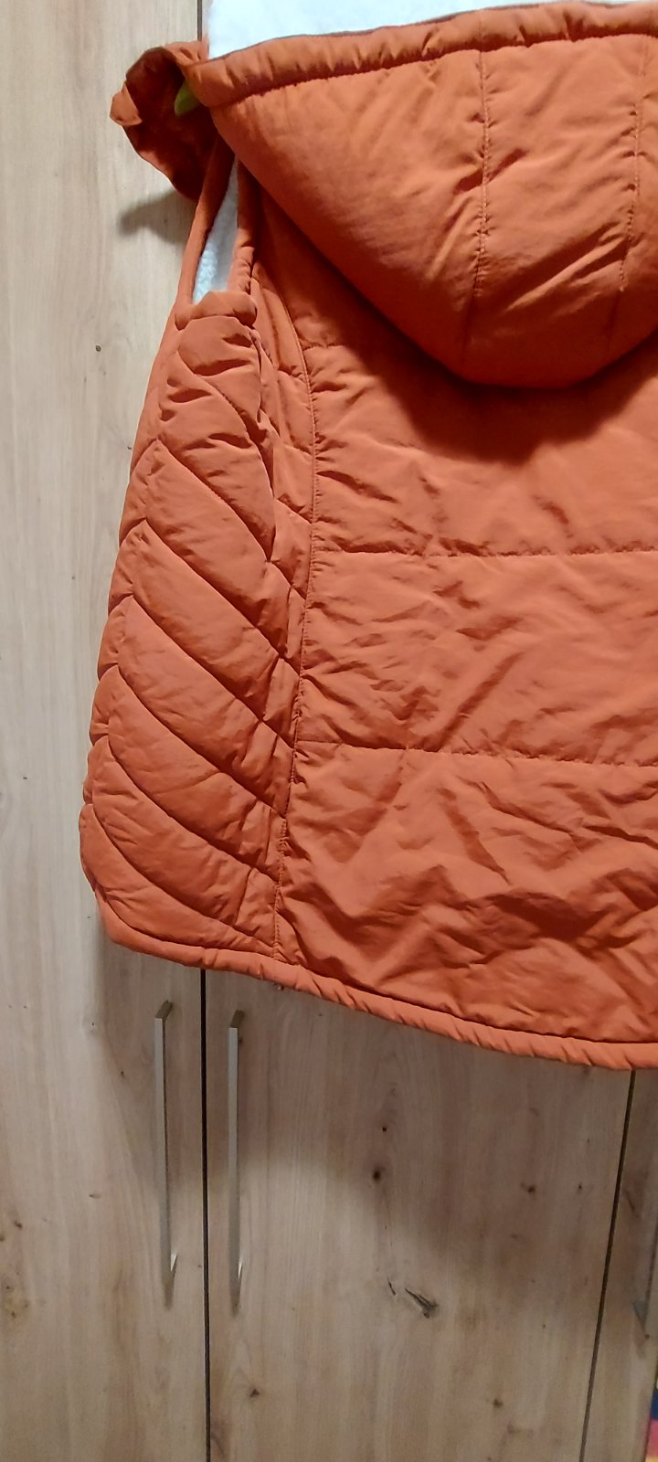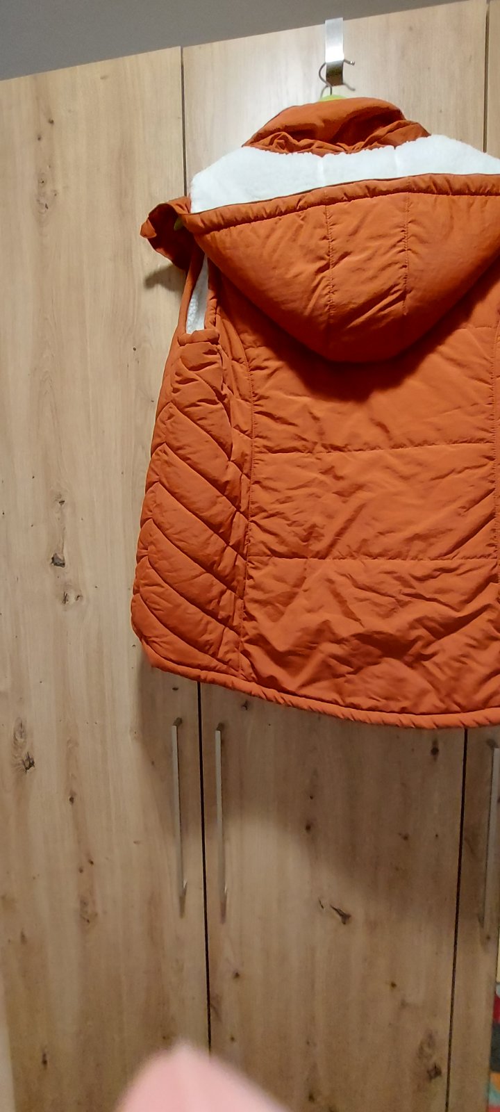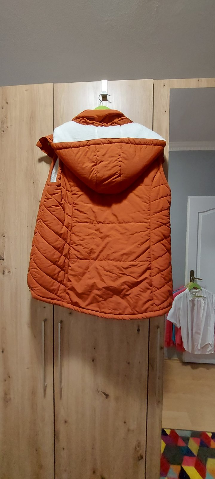 Krásna zateplená nová vesta ,len vyskušaná s nádherným bielim kožuštekom hnedooranžovej farby,sedí skôr na veľ.44 . Má dvojradové zapínanie s kapucňou. Šírka pod pažami 128 cm ,dĺžka 73 cm. Cena plus pošta ,alebo paketa .