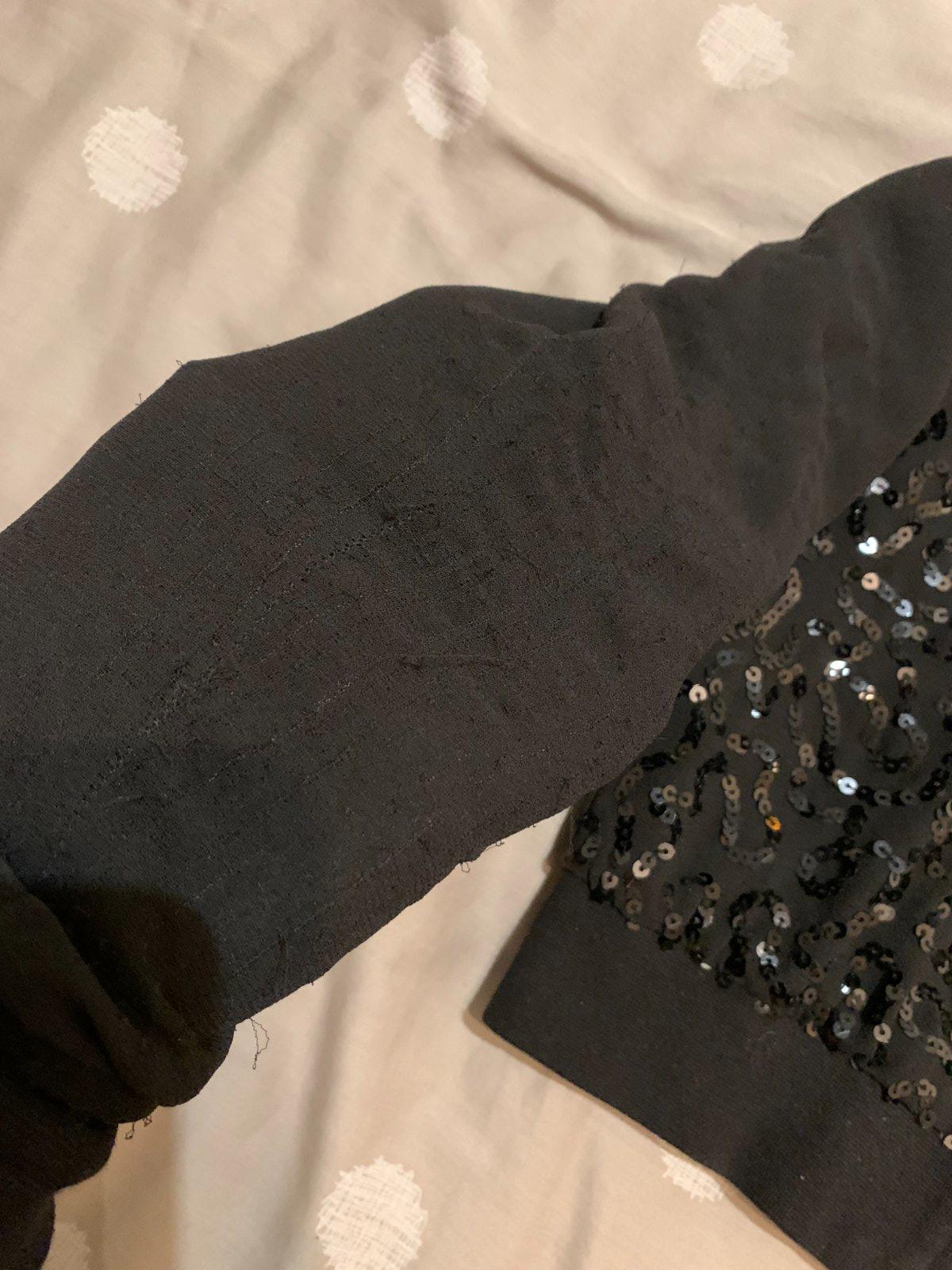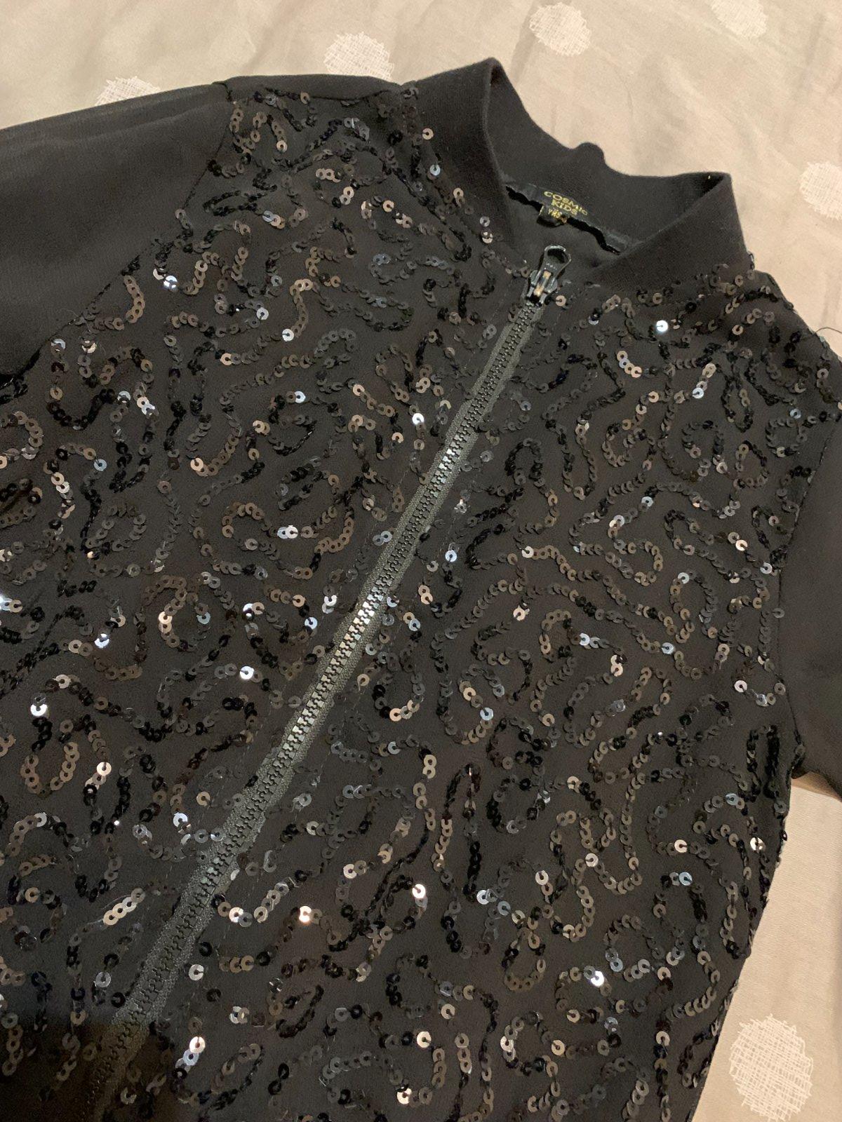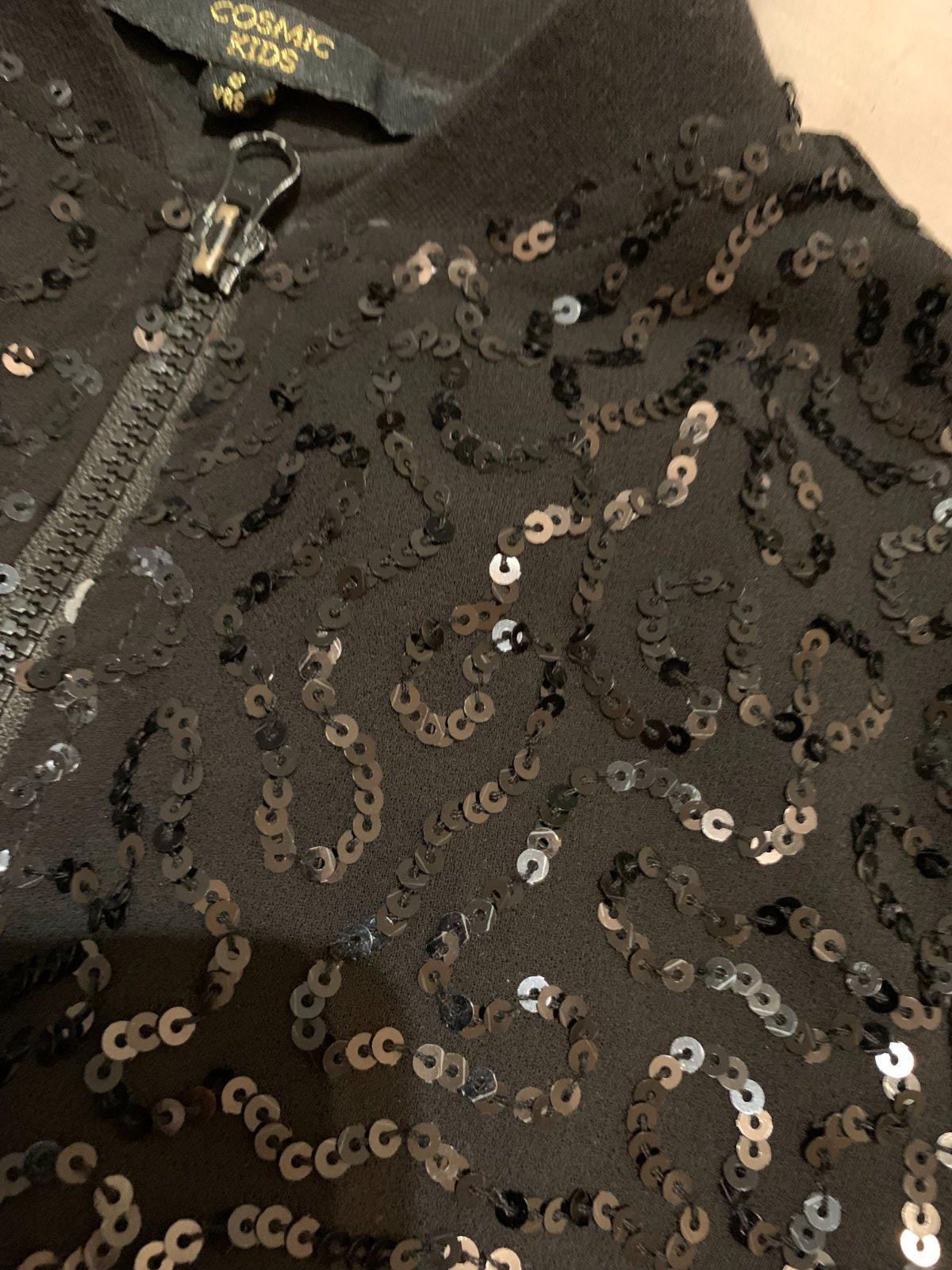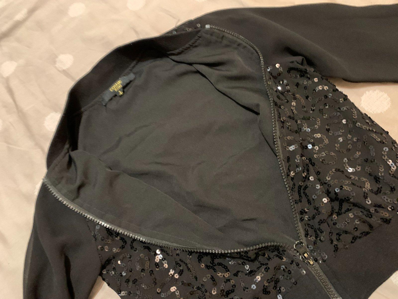 Tenučká bundička na zips s flitrami. Jeden rukáv povyťahávaný - viď. foto, inak ok.