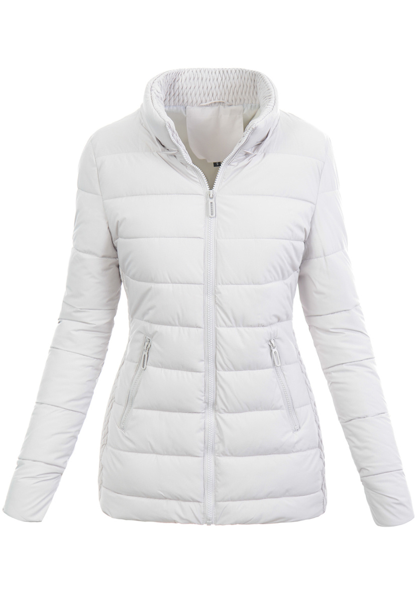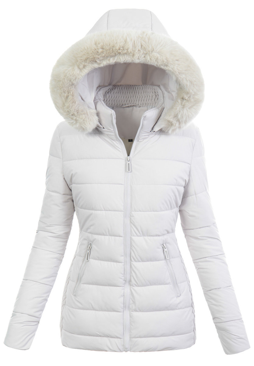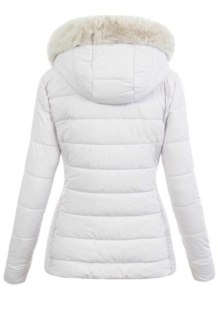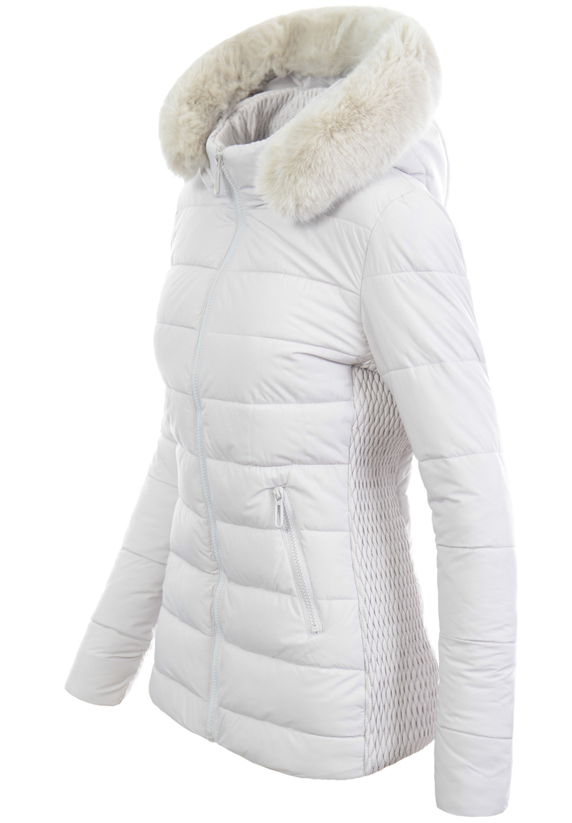 Krásna, veľmi módna dámska zimná, prešívaná ecru bunda. Bunda sa zapína na zips. Zateplené kvalitnou syntetickou výplňou, ktorá zaisťuje tepelnú izoláciu a vysoký komfort používania. Má dve priestranné vrecká na zips. Látková manžeta na rukáve. Bunda má odopínateľnú kapucňu s odopínateľnou kožušinkou, ktorá je ako stvorená na ochranu pred vetrom a dažďom. Bunda je ideálnym riešením pre ľudí, ktorí si cenia pohodlie a hodia sa k mnohým štýlom.